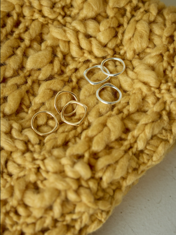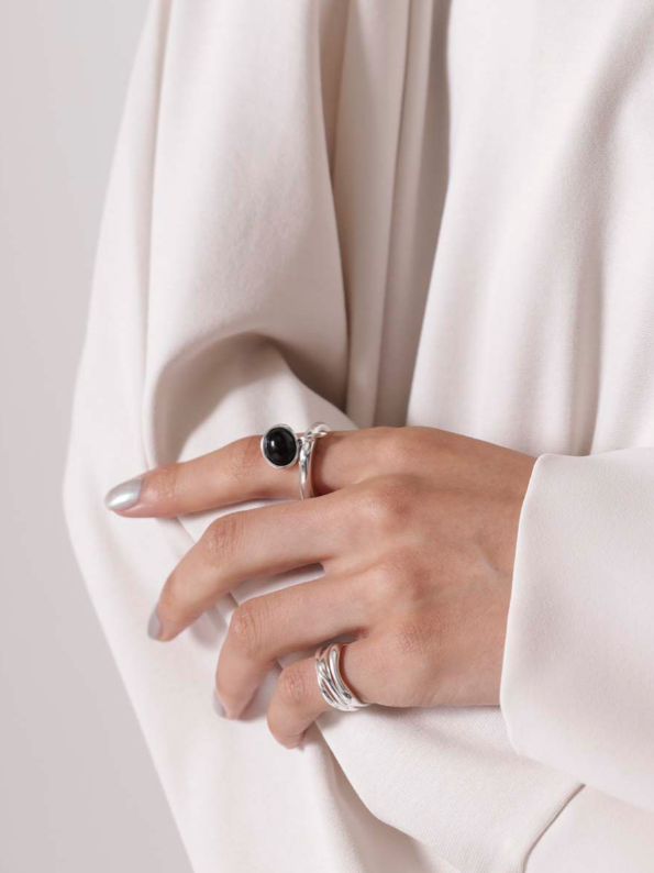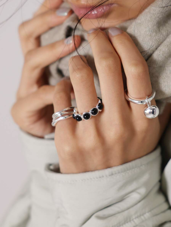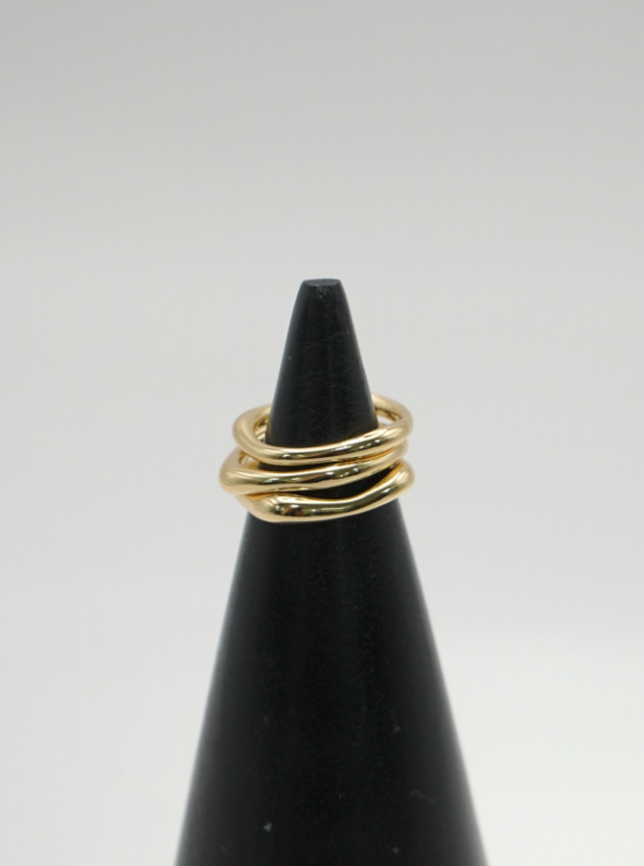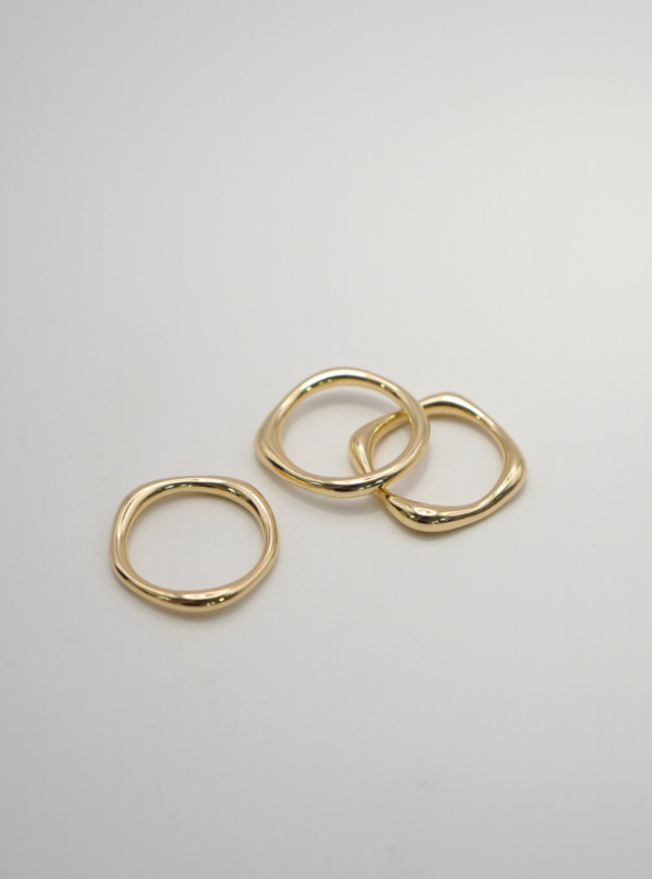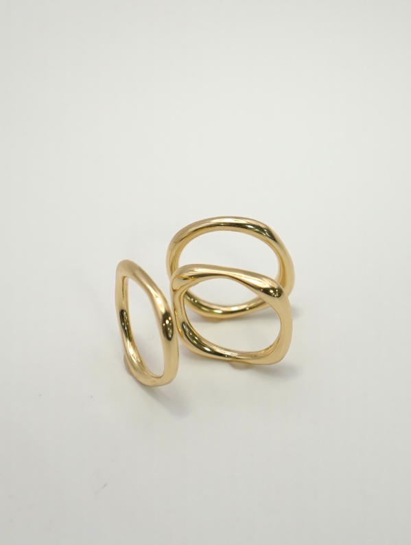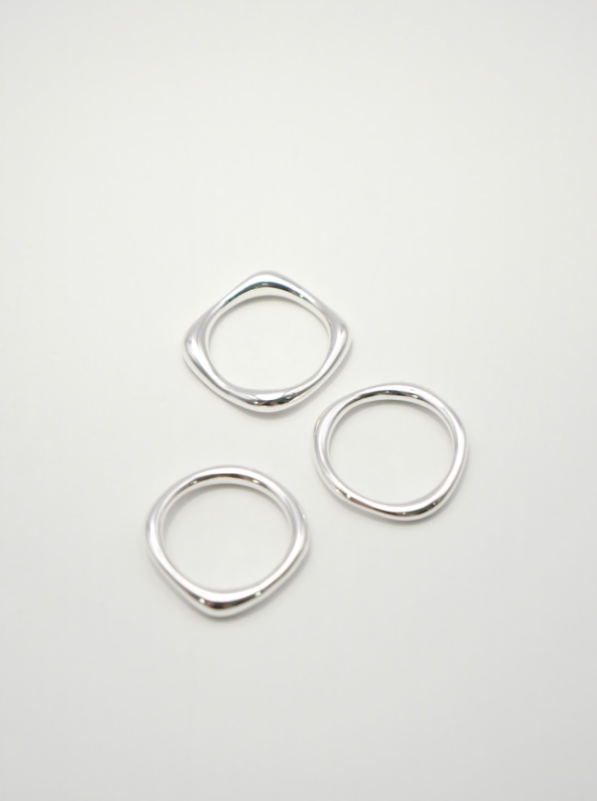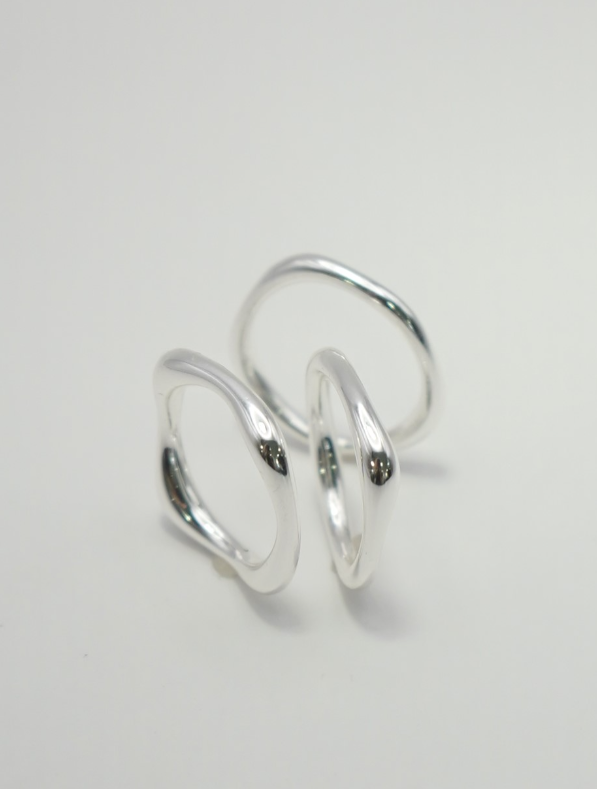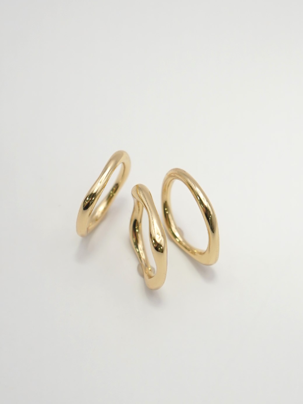 抑揚のある線が特徴的なニュアンスリング3本セットは場所によって形が違うのでお好みの位置に回して付けたり、3本まとめて着けたり、それぞれの小指に2本と1本ずつ着けたり、お手持ちのリングとレイヤー使いしたりと様々な着け方を愉しめます。小ぶりで手元に馴染みやすく、存在感のある有機的ラインは着けるだけで手元にアクセントを加えてくれます。