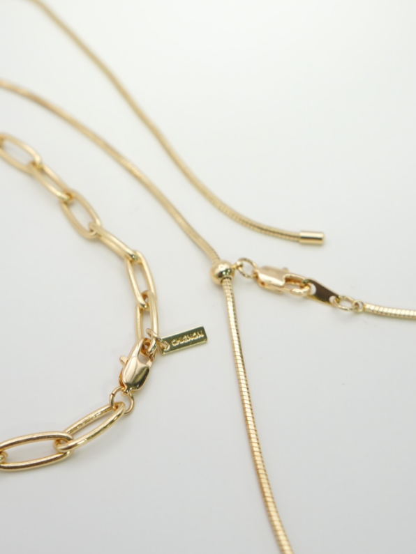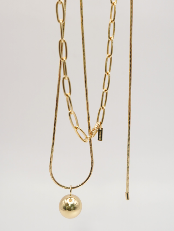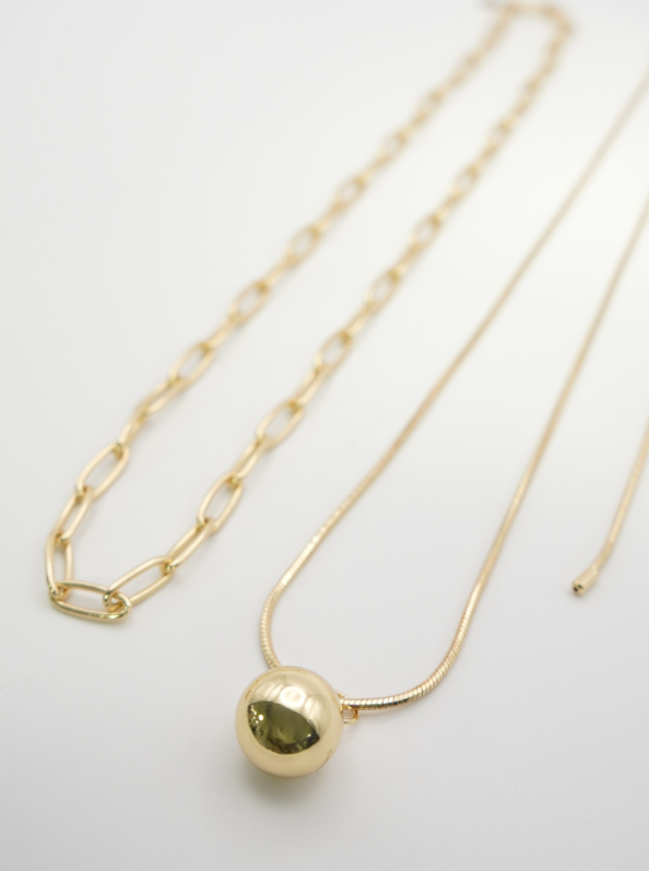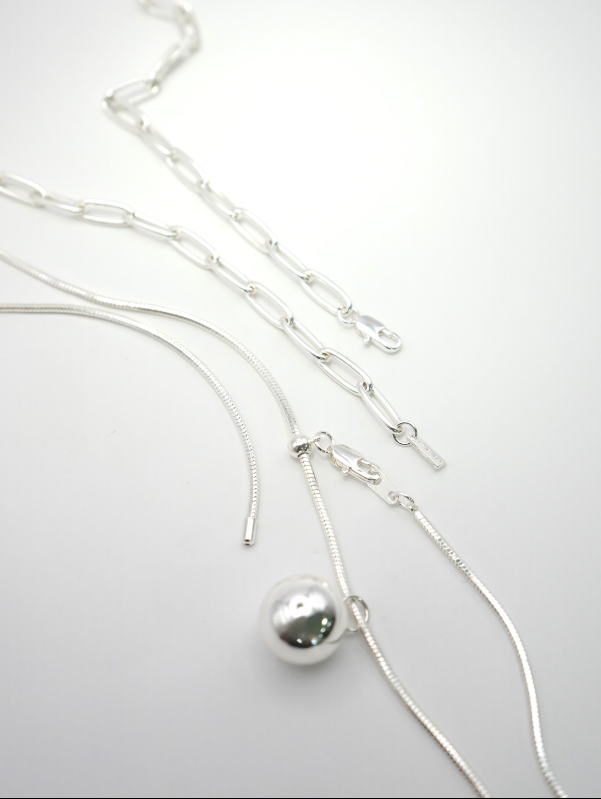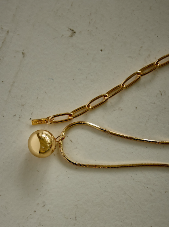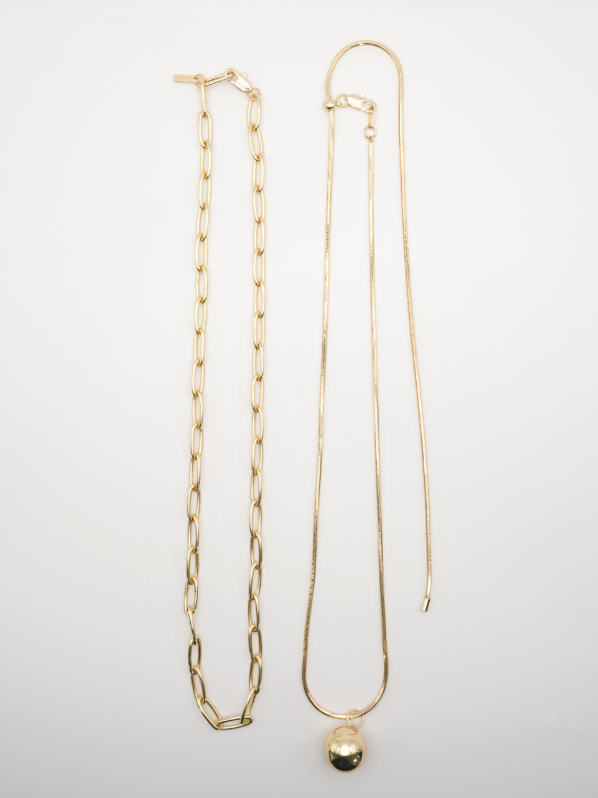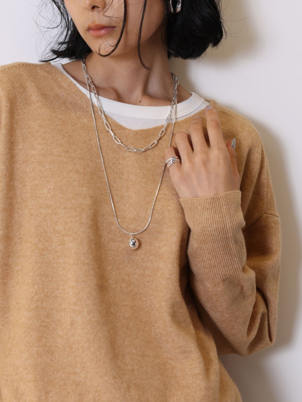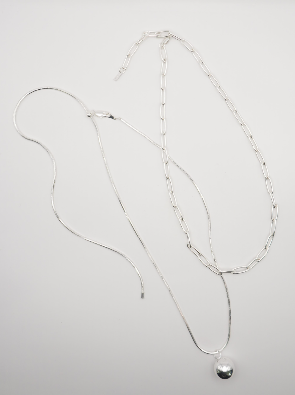 程良いボリューム感と抜け感のあるオーバルチェーン&取り外し可能なメタルボールが付いたスネークチェーンの2本セットネックレスはどんなコーデにも合わせやすく、それぞれサイズ調整も可能な万能アイテムとなっております。オーバルチェーンはお好きな位置で留められるのでショートやY字にしても◎メタルボールは取り外し可能で、スネークチェーンにスライドビーズがついているので着用しながらの長さ調節が可能です。2本重ねて着けたり、単体でつけたりと様々な着け方を愉しめます。メタルボール裏面に「CHIGNON」刻印入り。