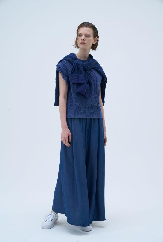 同素材、同加工のニットスカートとのセットアップコーデも可能です。