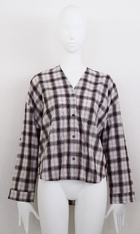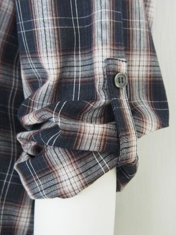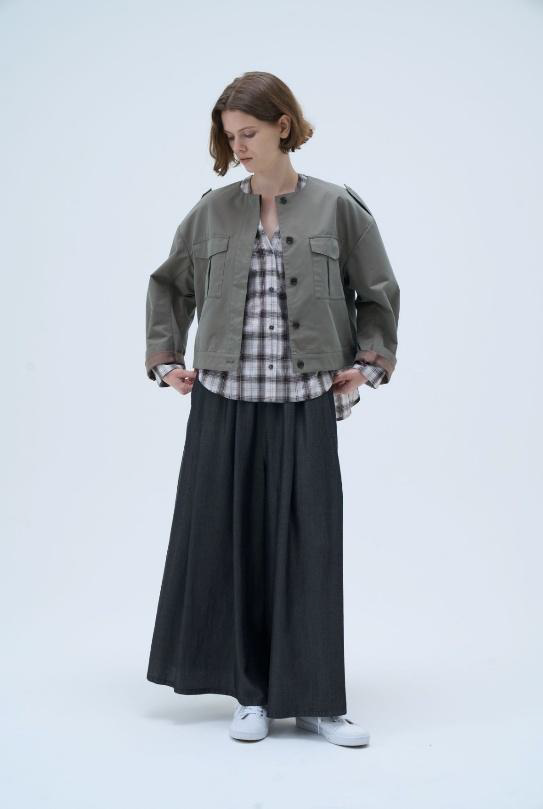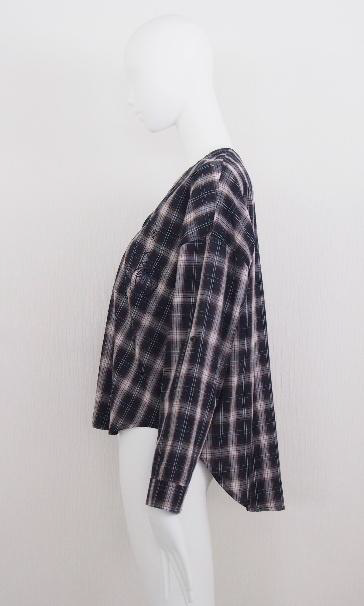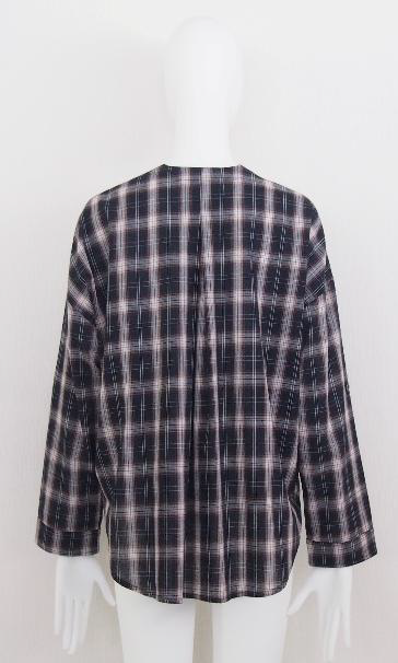 ノーカラーでゆったりとしたワイドシルエットに仕立てたチェックシャツです。