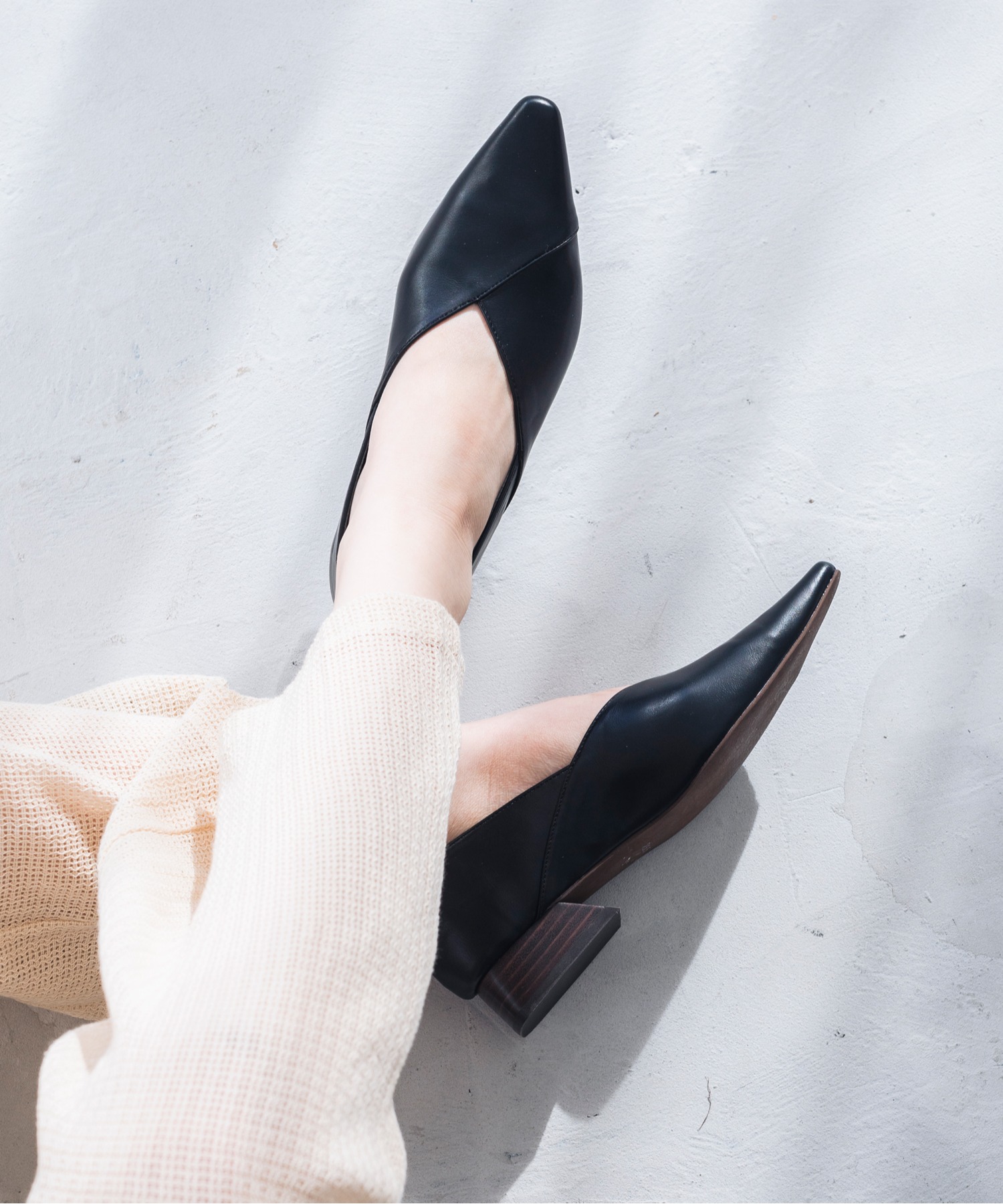 シャープなシルエットが魅力のポインテッドトゥパンプス。Vカットのラインが足元をすっきり美脚にみせてくれます。ソフトな素材を使用しているため、足当たりが良く長時間履いても疲れにくい1足です。踵を踏んでも履ける2way仕様になっているので、その日のコーディネートや気分によって履けるのも嬉しいポイントです◎
