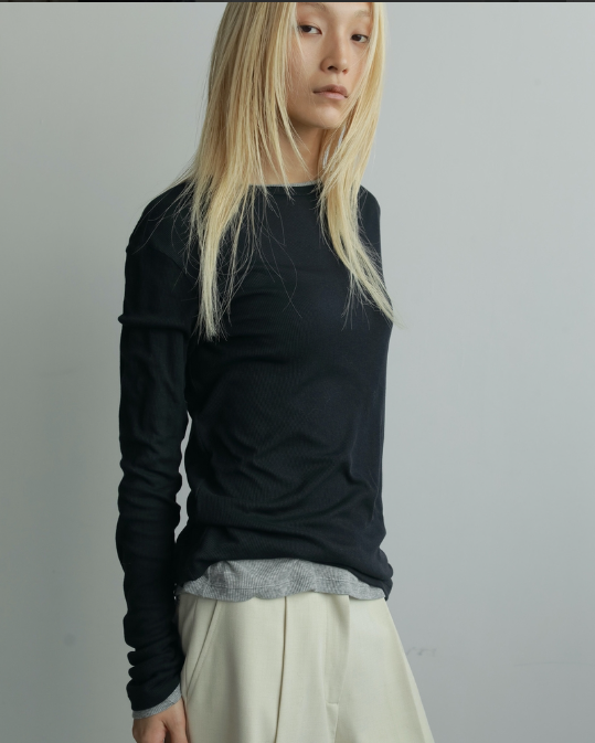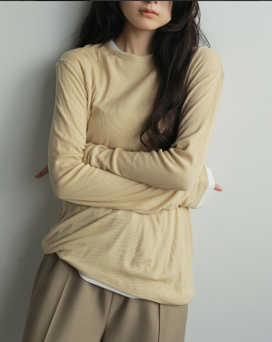主張し過ぎず程良くニュアンスを出してくれる細かなリブ目で、幅広いアイテムと合わせやすい一枚。