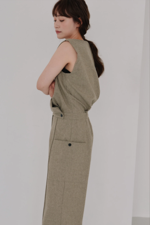 フロントのカシュクールデザインが印象的なウールジャンプスーツ。