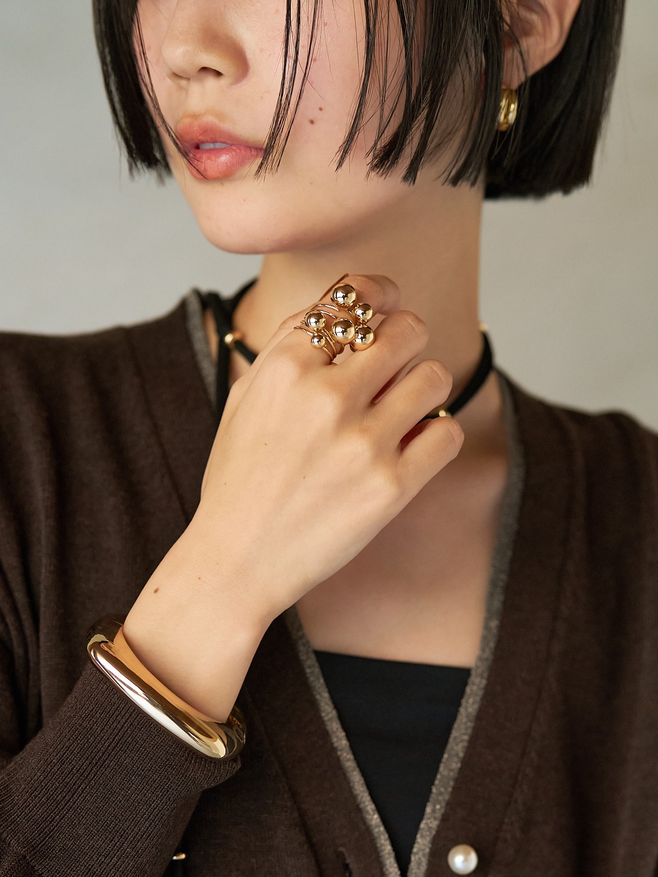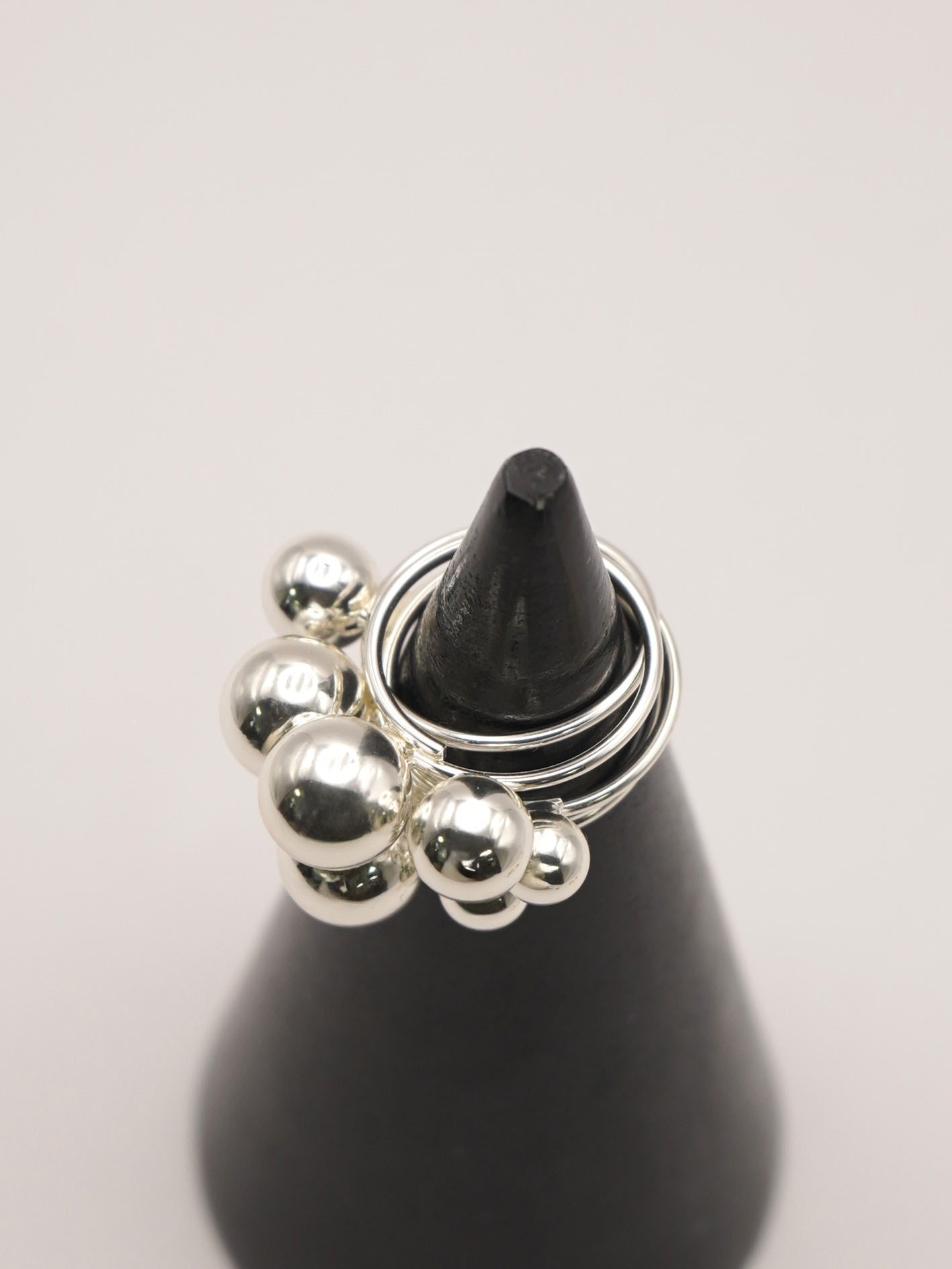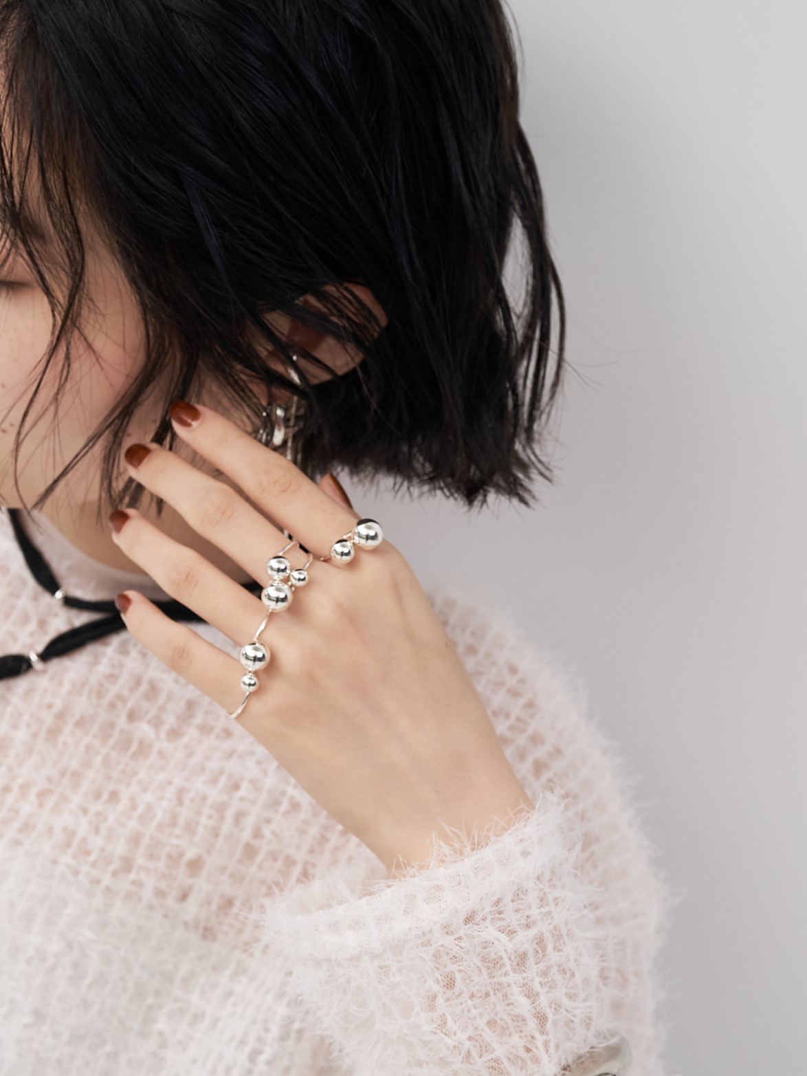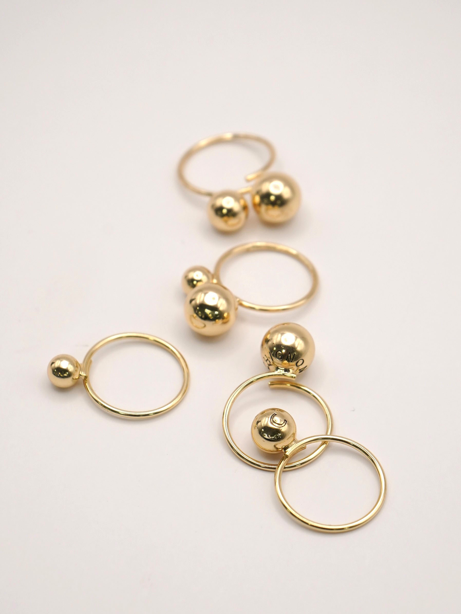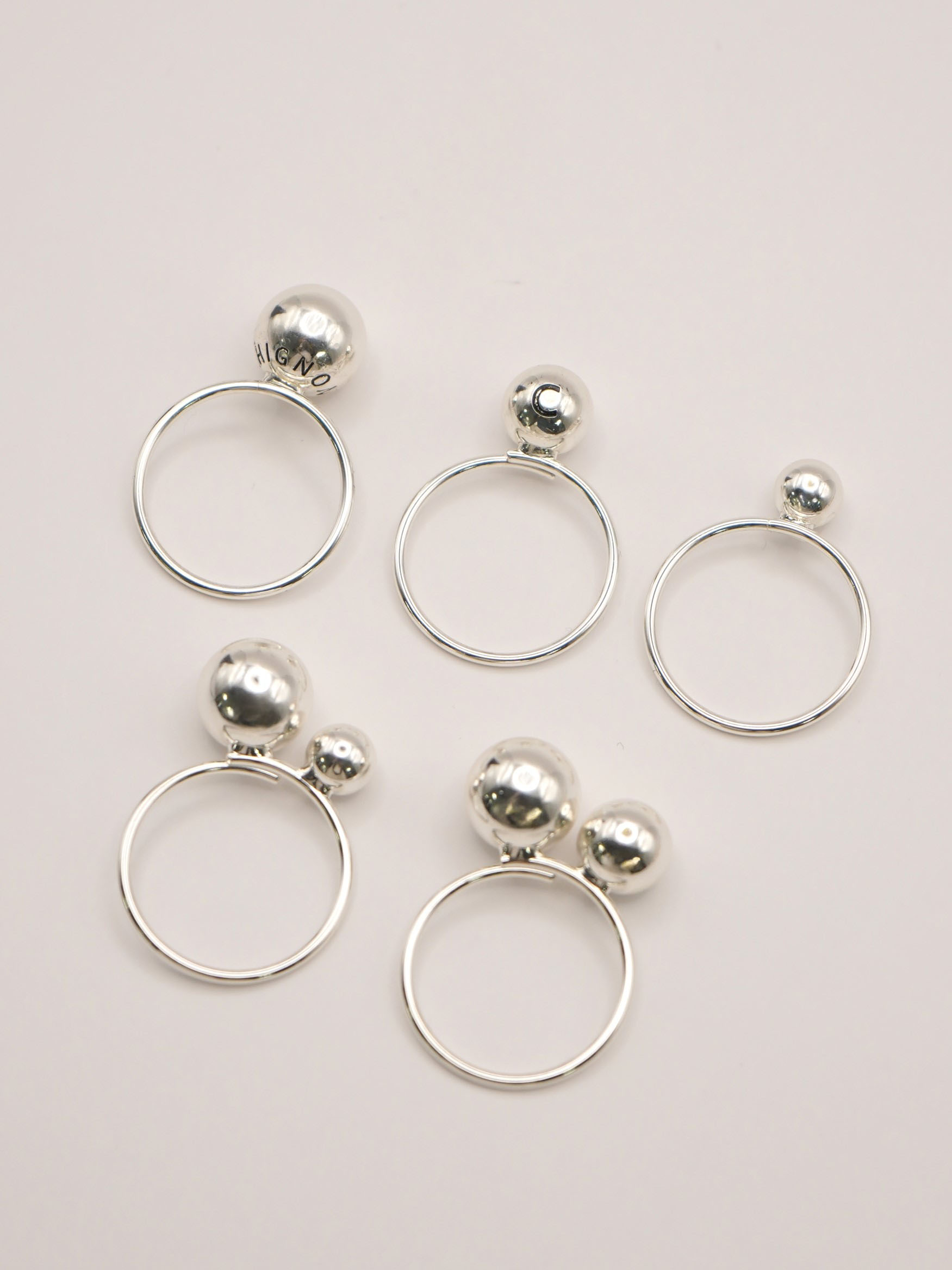 それぞれ大きさの異なるメタルボールが付いた5本セットリングは、様々な着け方を愉しめるアイテムとなっております。