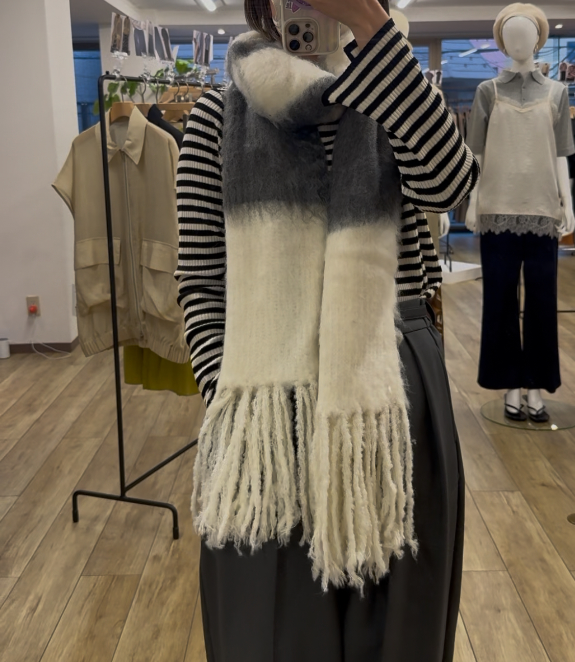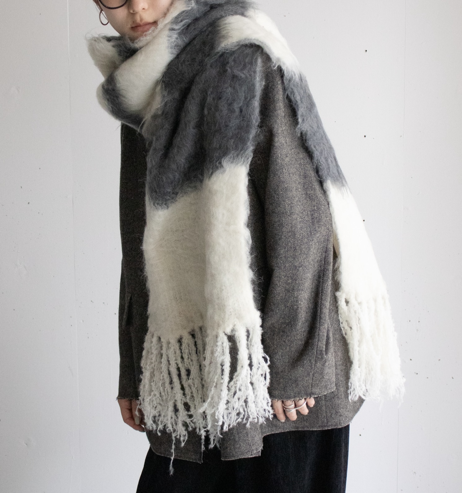 大判ですが厚すぎず軽い為、スタイリングに取り入れやすい1枚です。