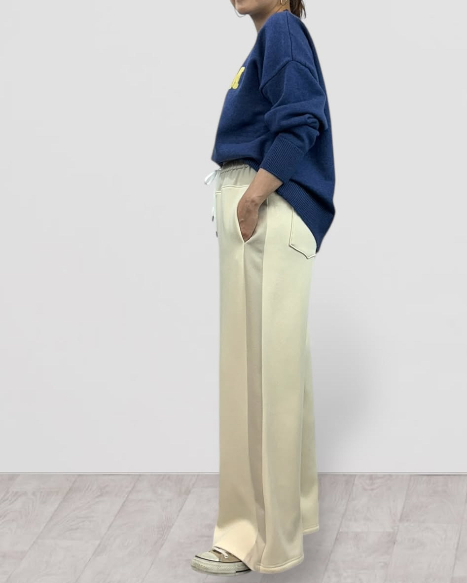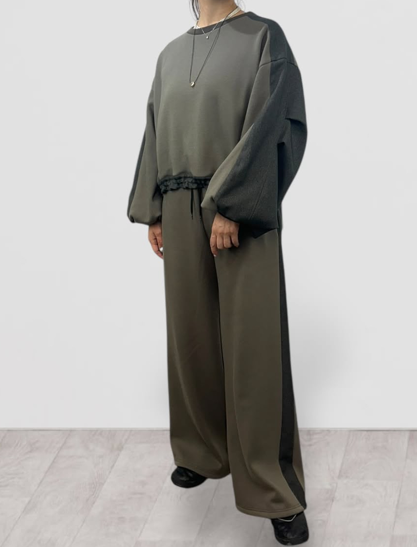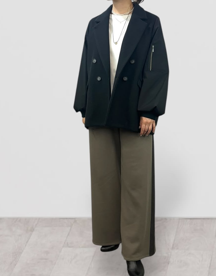 ・ウール湖サージの上に裏起毛ジャージを重ね着したようなウエストとサイドラインがポイント