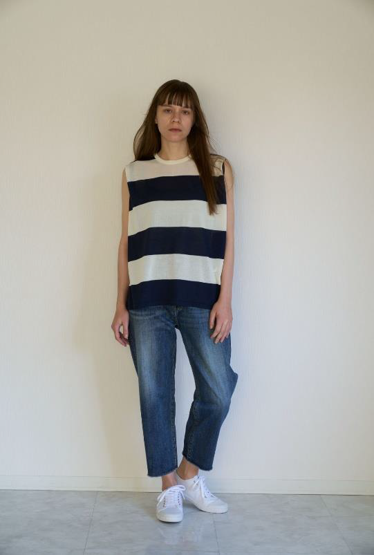カジュアルな超ワイドピッチボーダーを、落ち感のある綺麗めニットで編み上げ、大人っぽく仕上げたノースリーブトップスです。