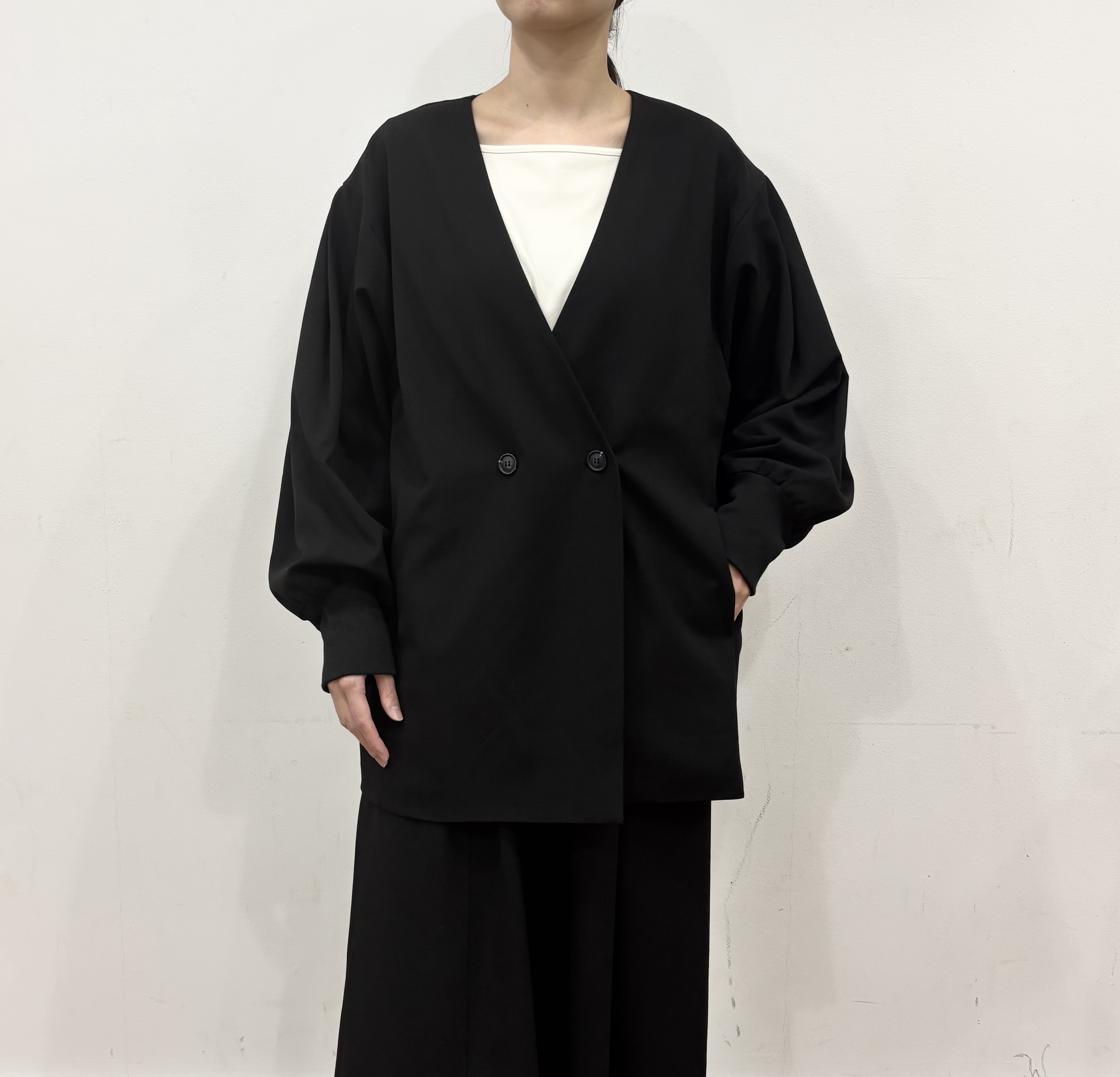 袖部分にタックをとってあり、たっぷりボリューム感のあるお袖が特徴のジャケット。