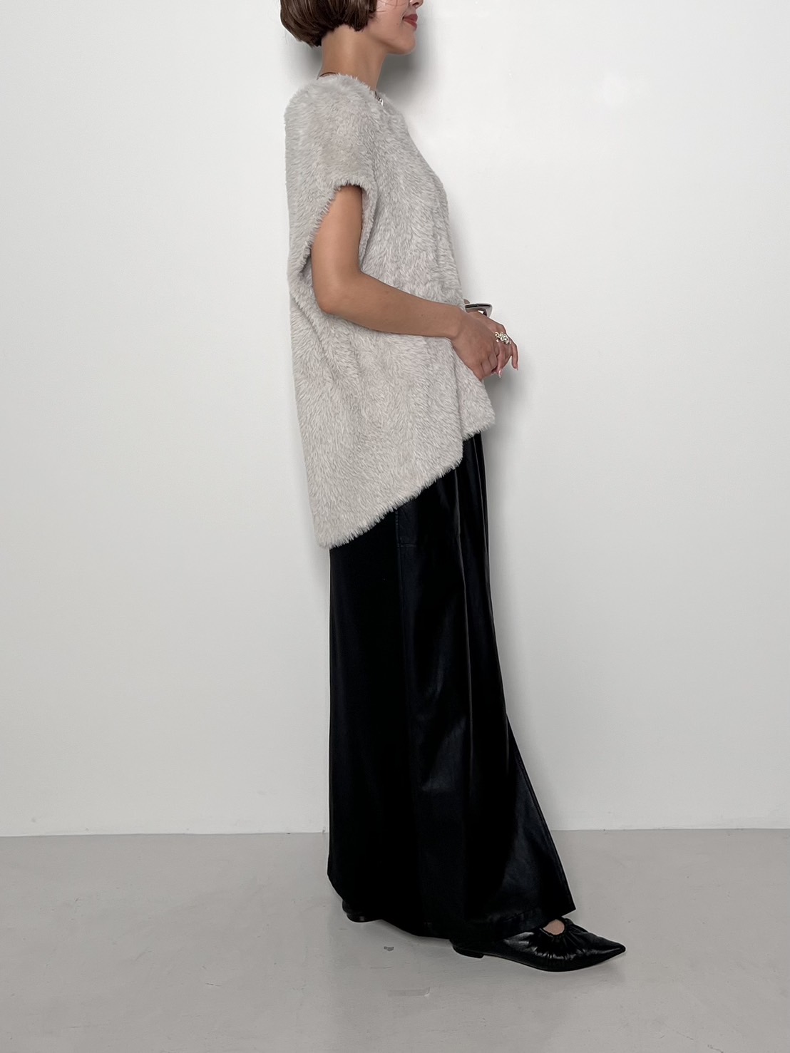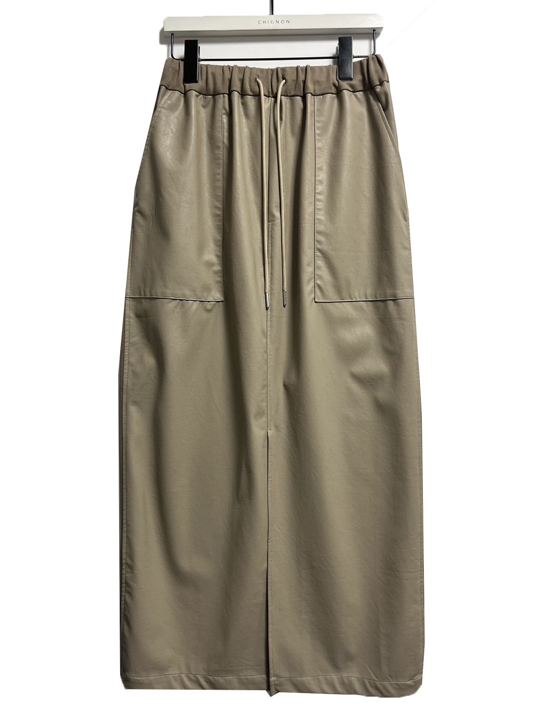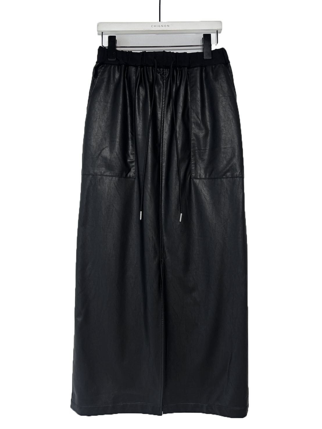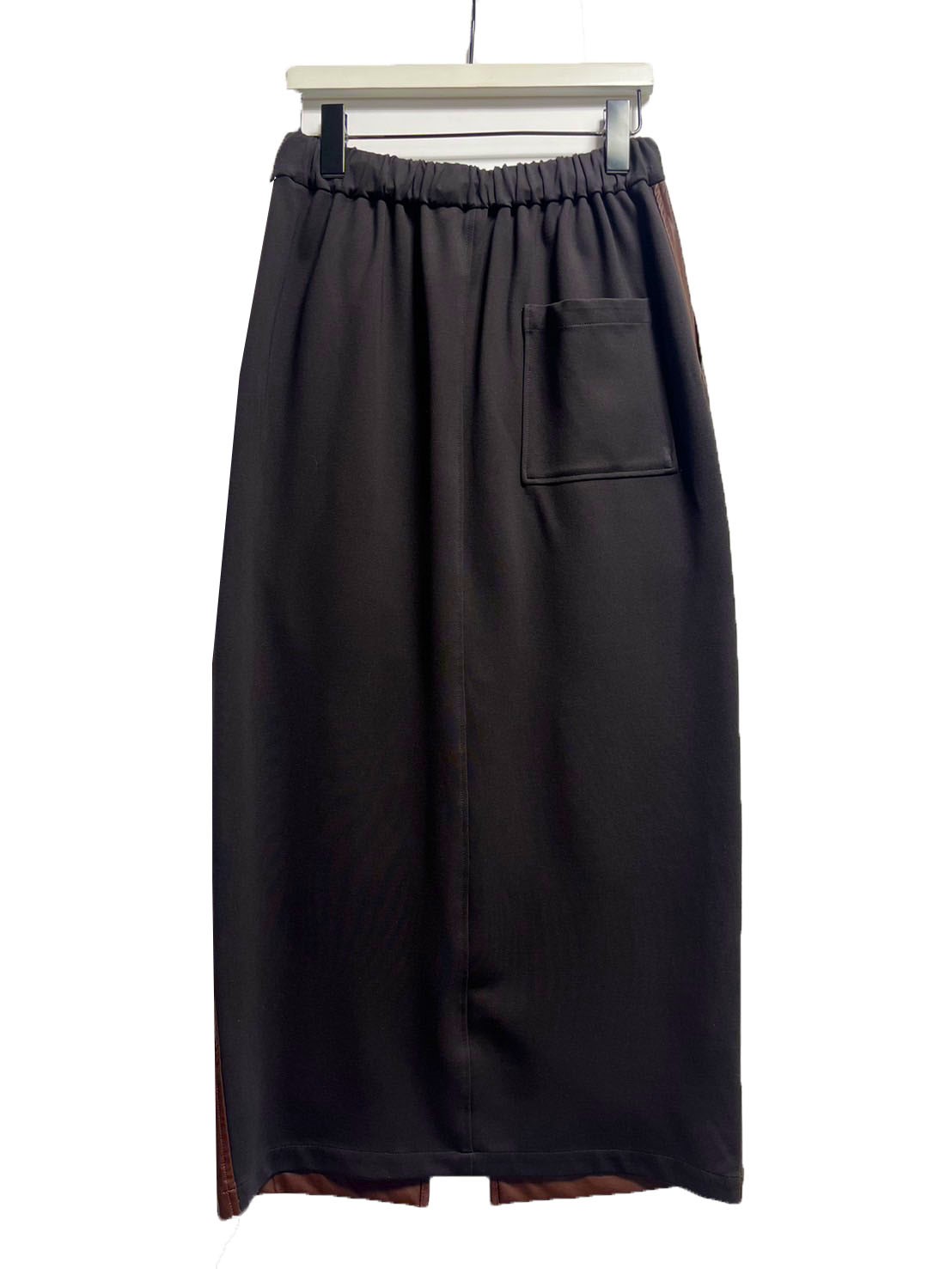 異素材使いのナロースカートです。シンプルなベイカースカートのデザインですが、フロントはフェイクレザー、後ろはカットソー素材の、大胆な異素材使いになっております。後ろがカットソーのため、フェイクレザーのボトム特有の座りにくさがありません。まっすぐなラインのすっきりしたシルエットですが、タイトになりすぎないサイズ感に拘りました。フェイクレザー素材は、リアルレザーのようなシボ感のある風合いになっております。