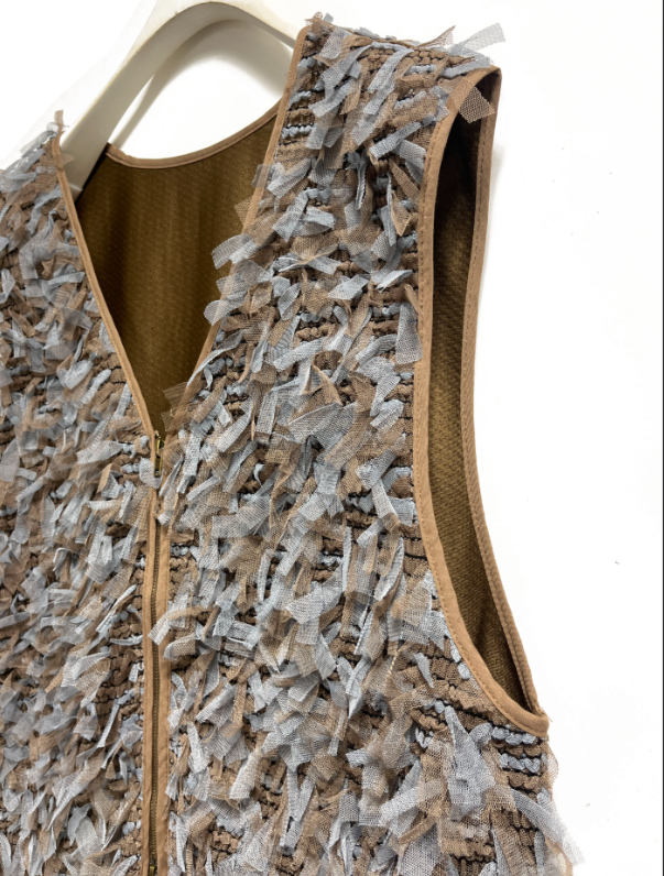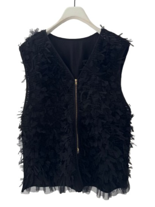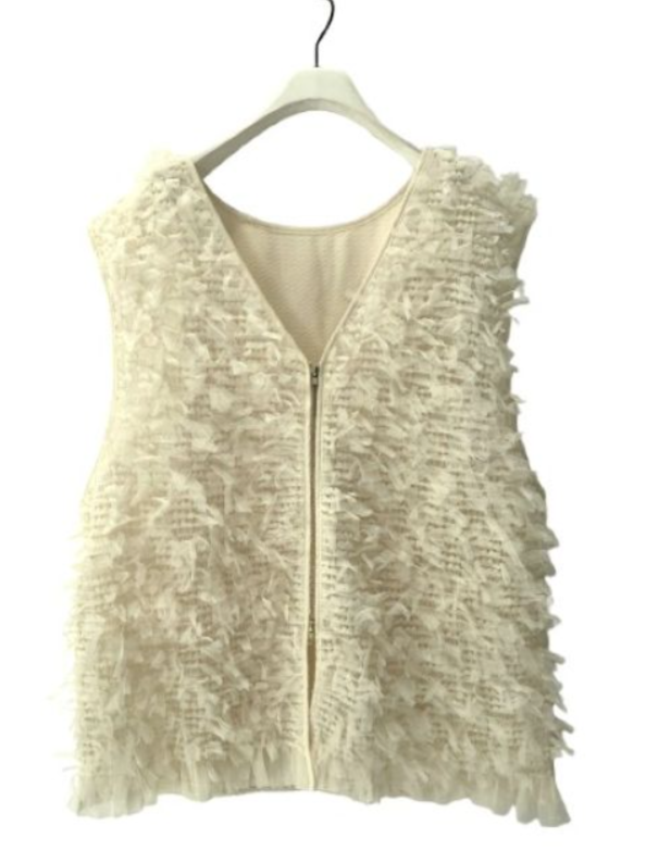 甘くなりやすいリボンチュールを逆開ファスナーで辛さを足して、大人も着やすいベストに仕上げました。
