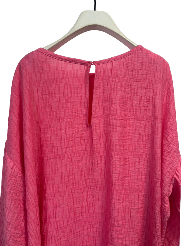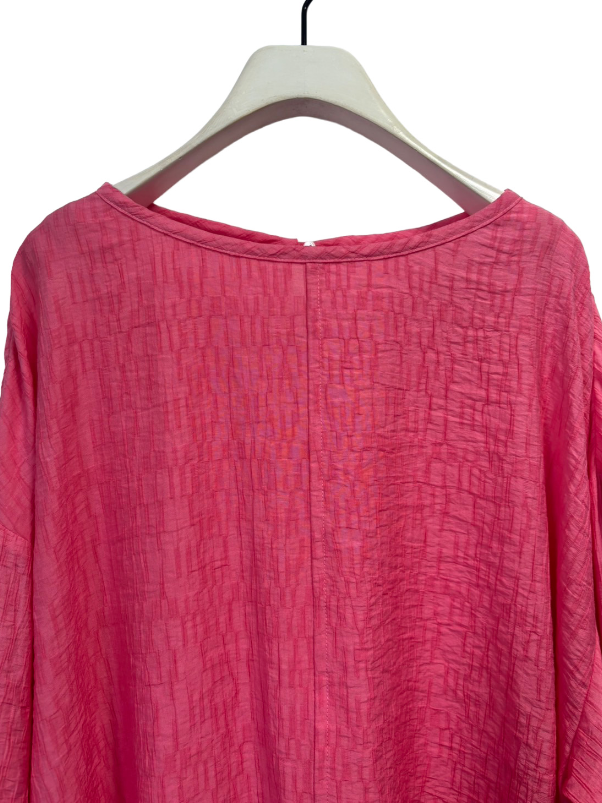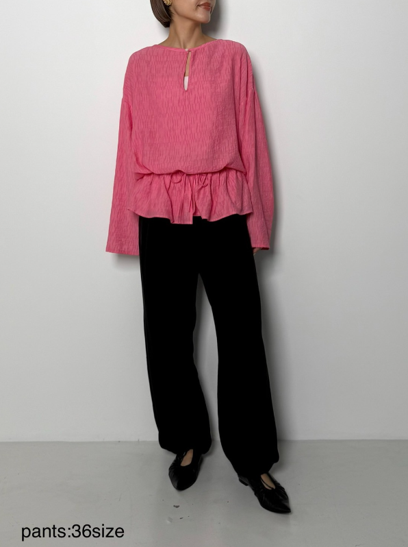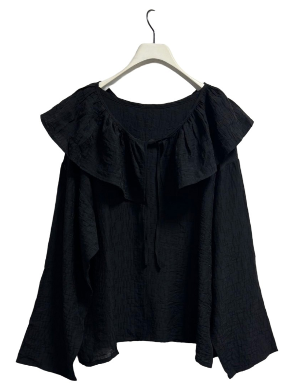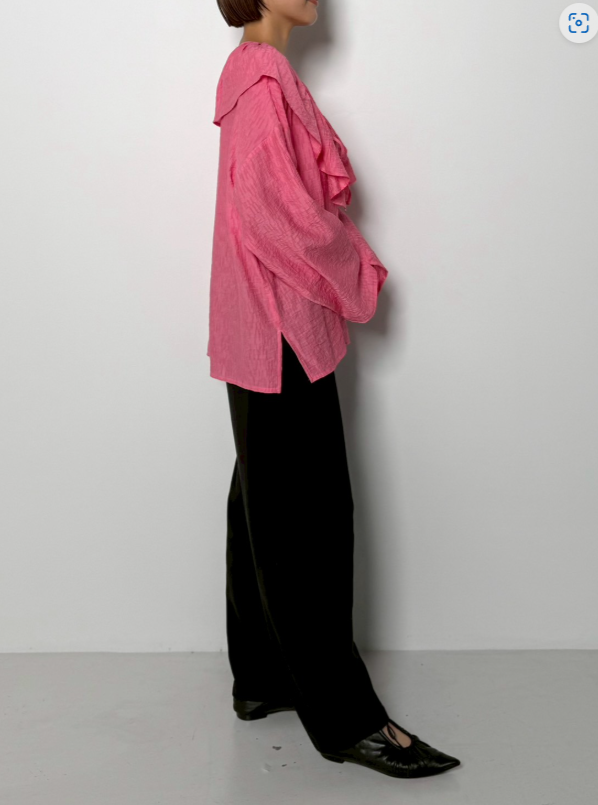 凹凸感のある楊柳 をしようした、フリルの衿付のTブラウス。