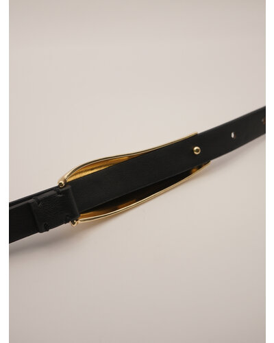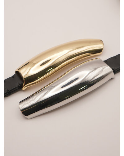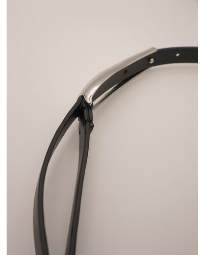 ニュアンスのある丸みを帯びたバー状のメタルプレートをフロントに配し、ベーシックな着こなしをモダンにアップデート。