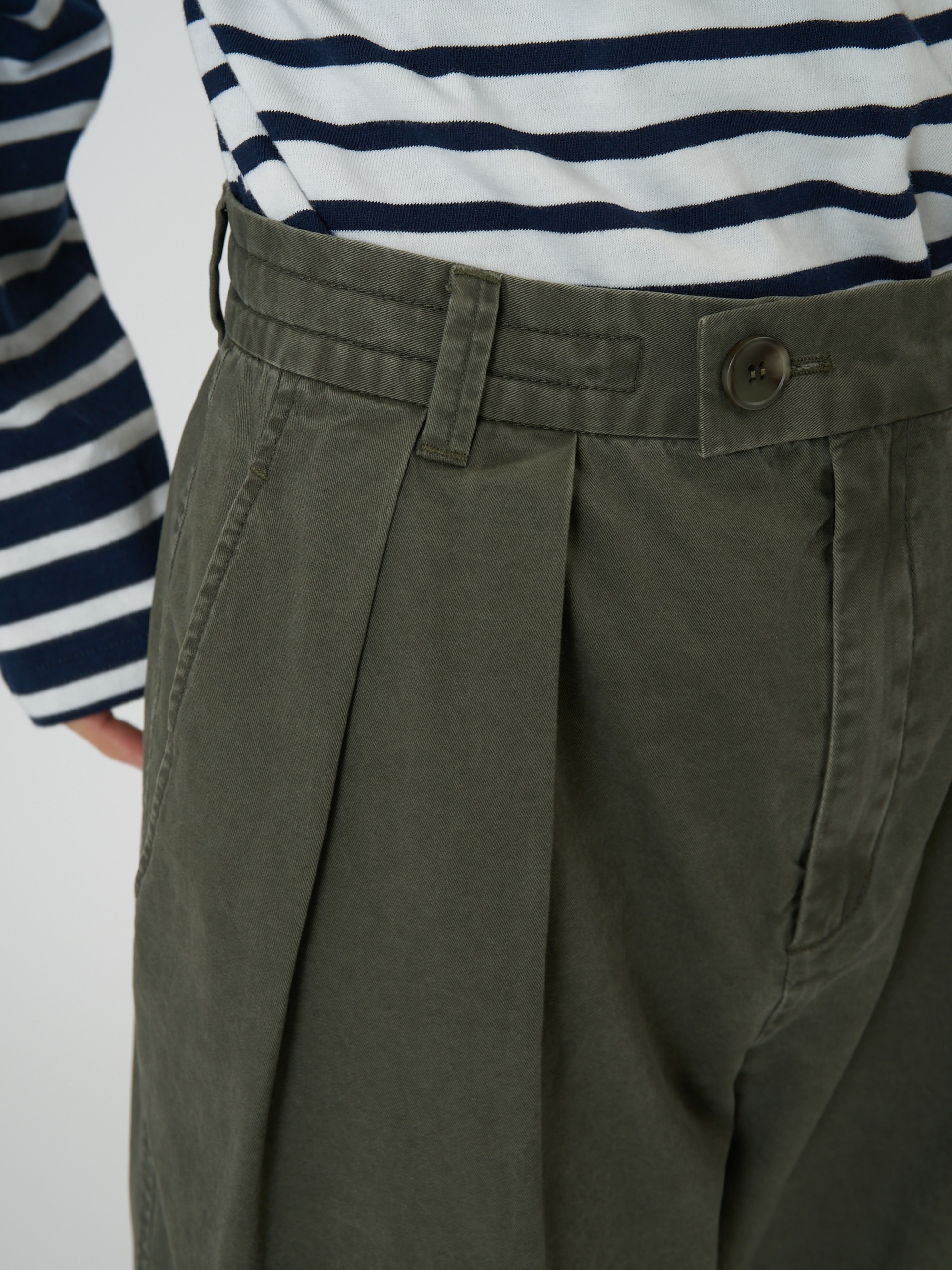 クリアな表面感のコットンツイルを使用し、製品バイオストーン加工を施したマルチユースなチノパンツ。