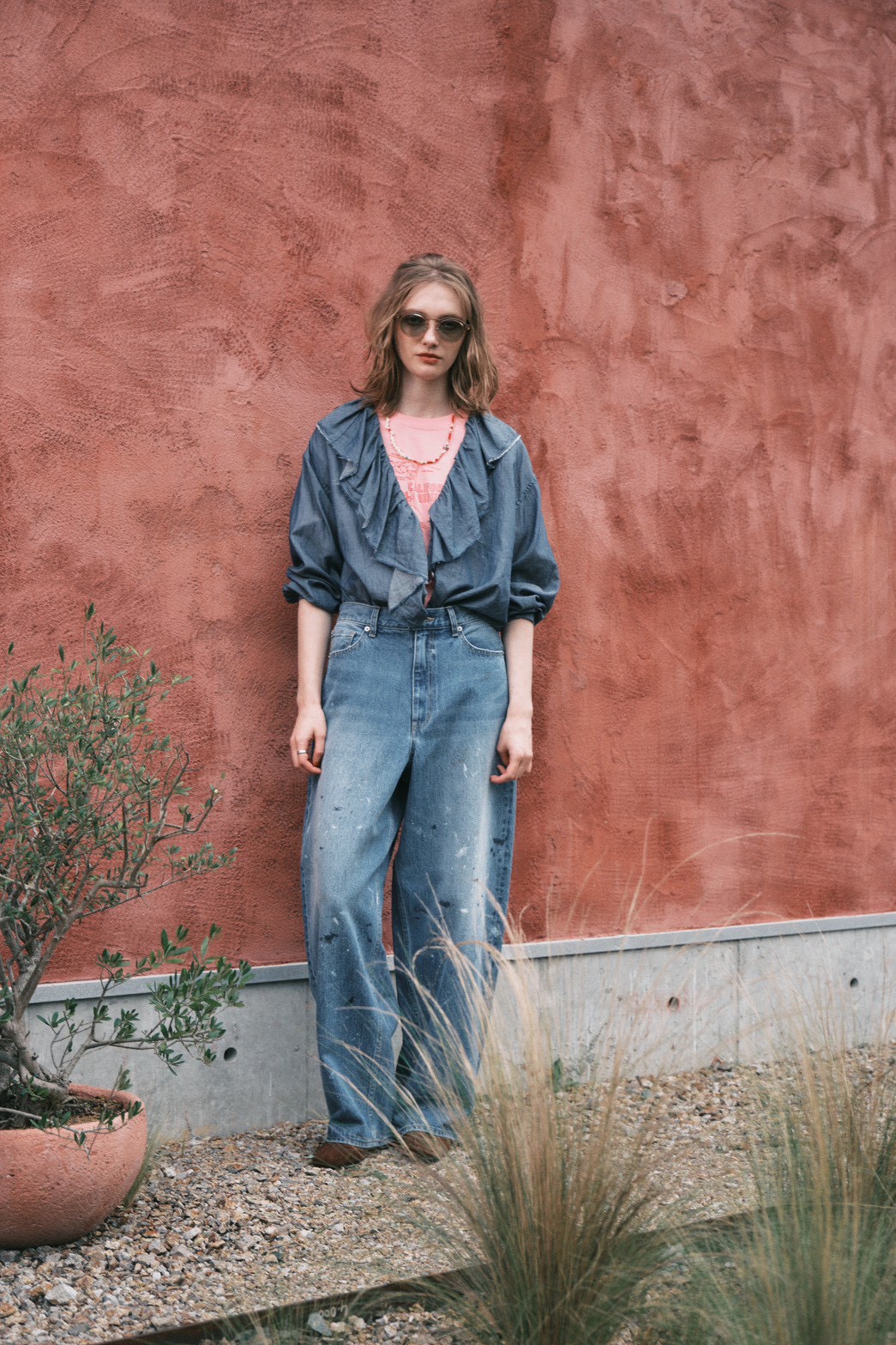ハイウエスト、ヒップからワタリにかけて女性らしい丸みを持たせ、裾にむけてカーブをかけたシルエット。