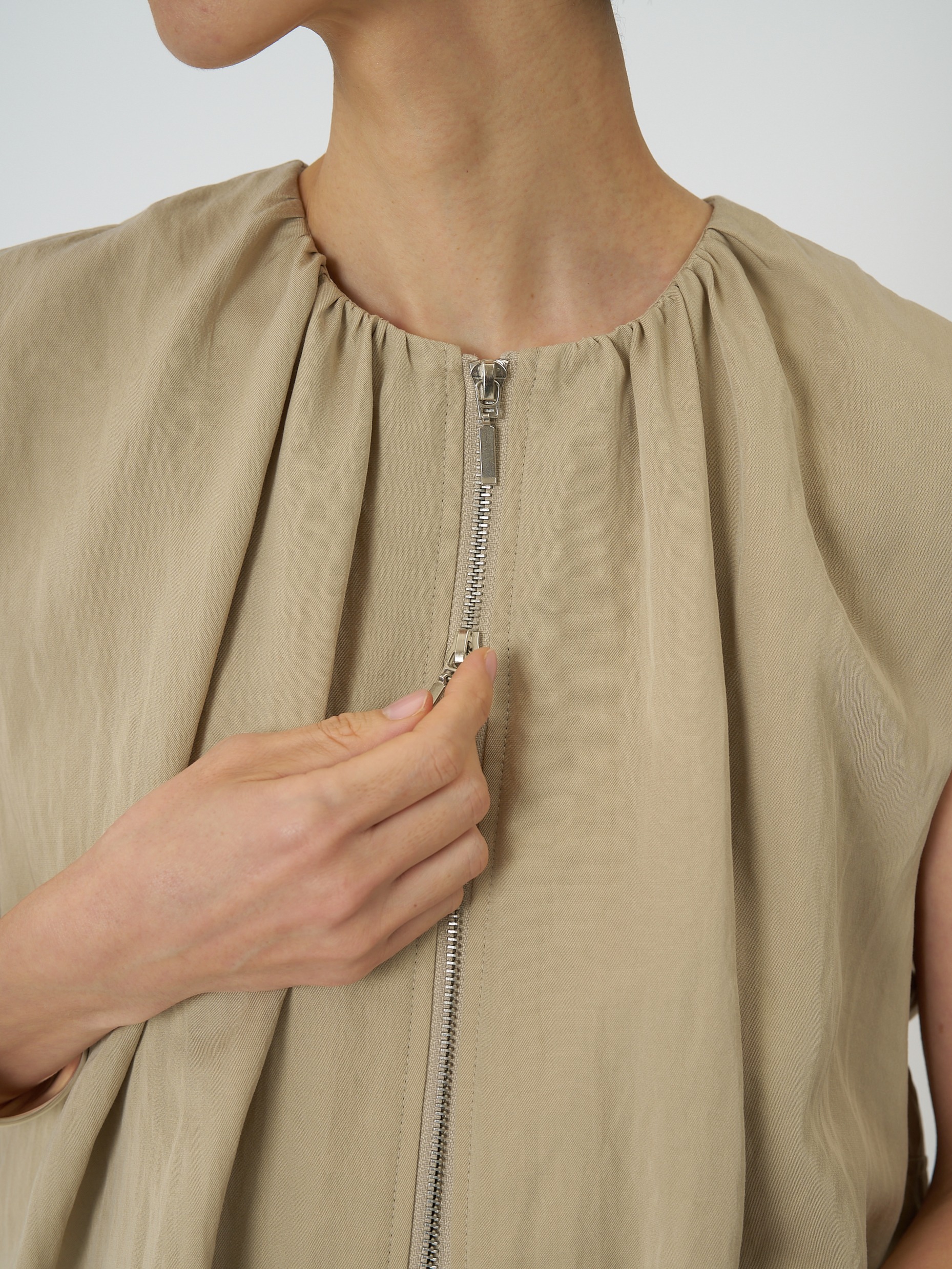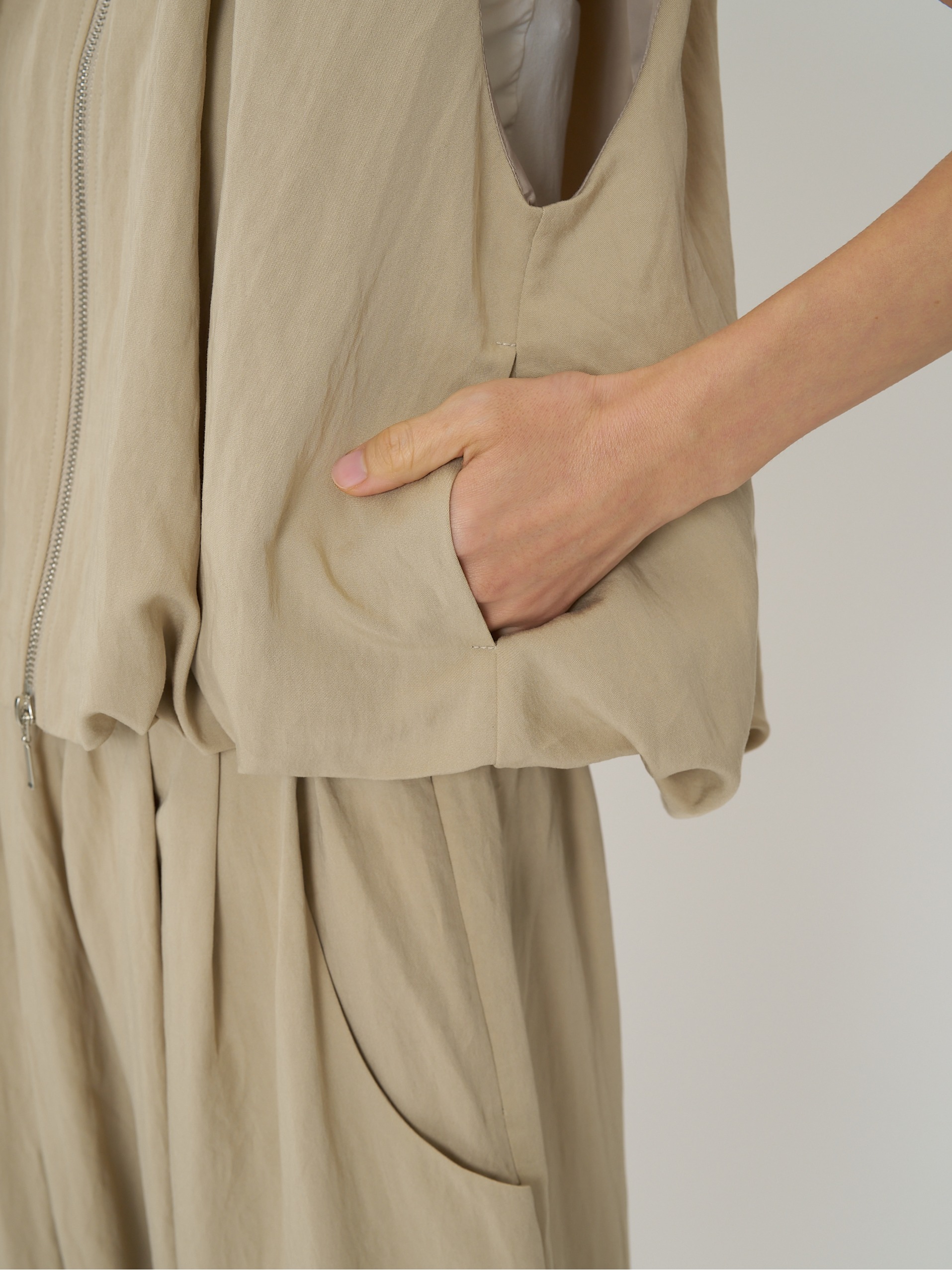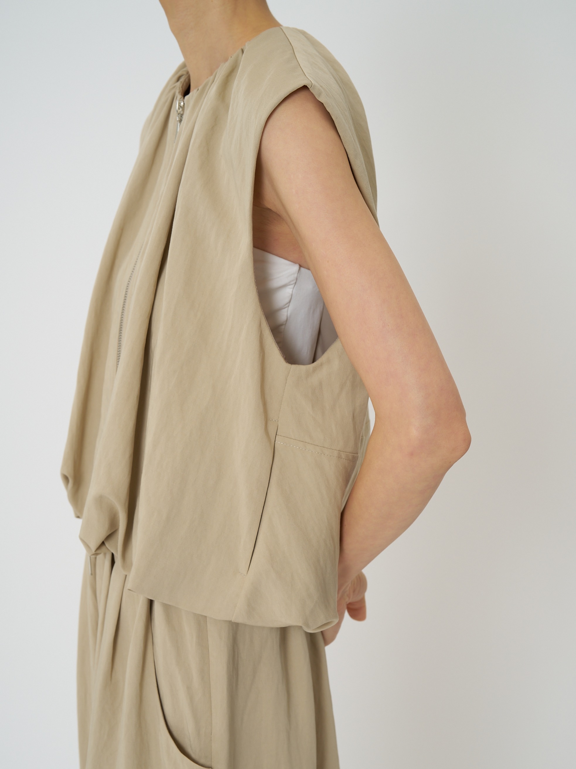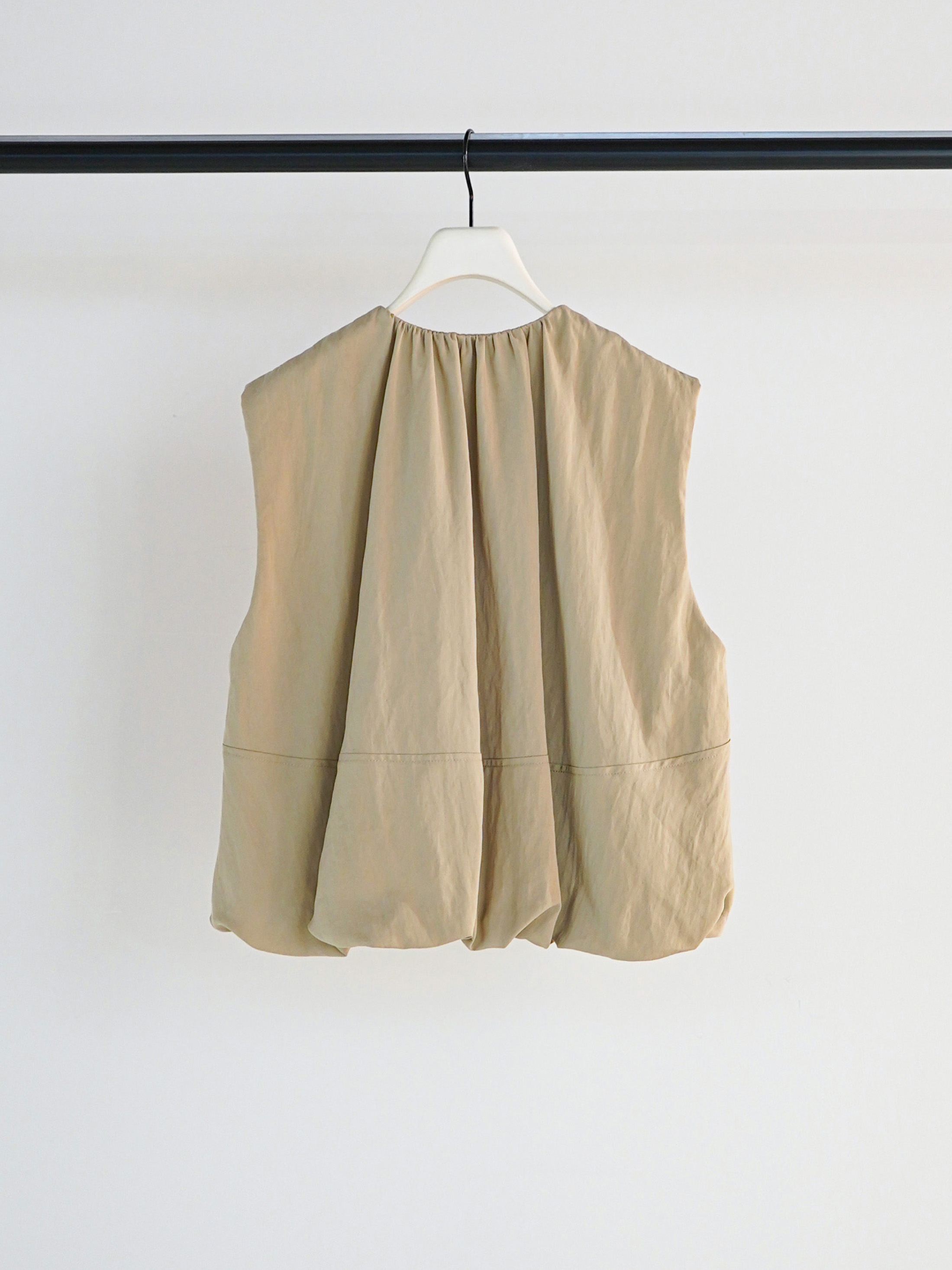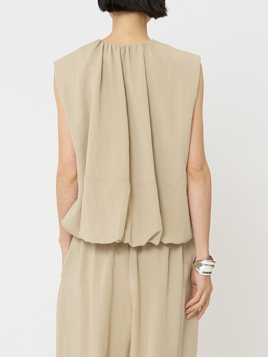 計算されたタックアンドギャザーでまとめたバルーンシルエットが映える、ショートレングスベストです。