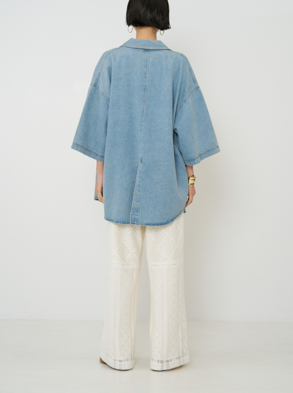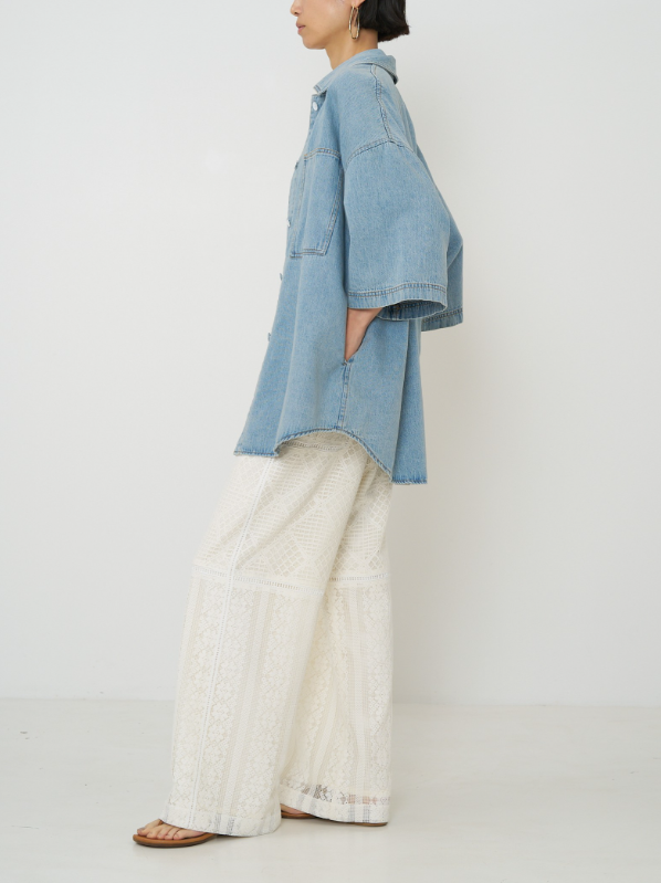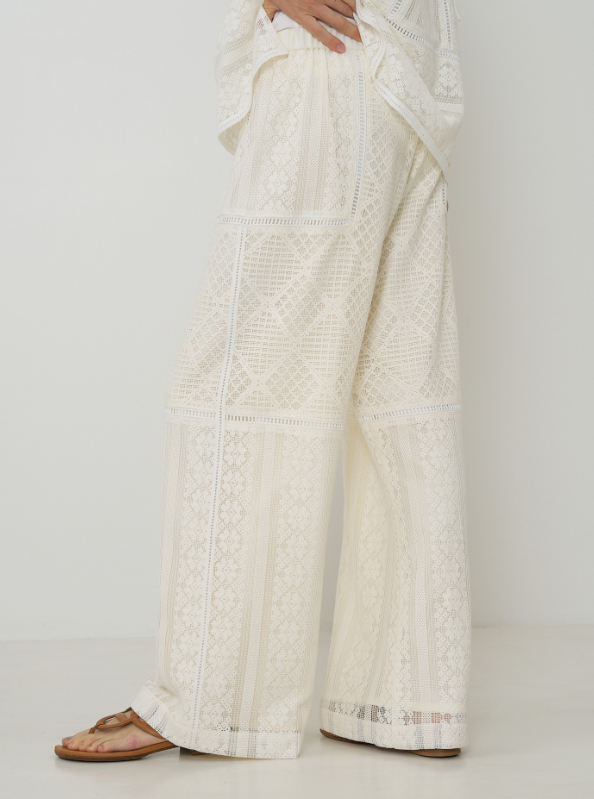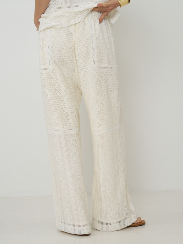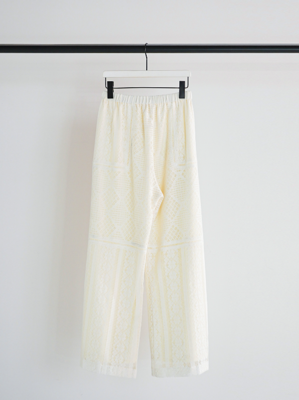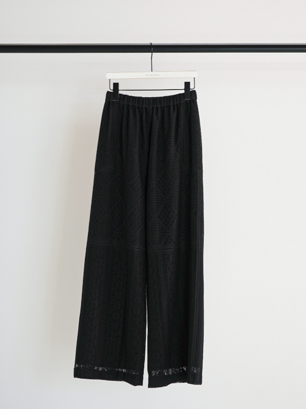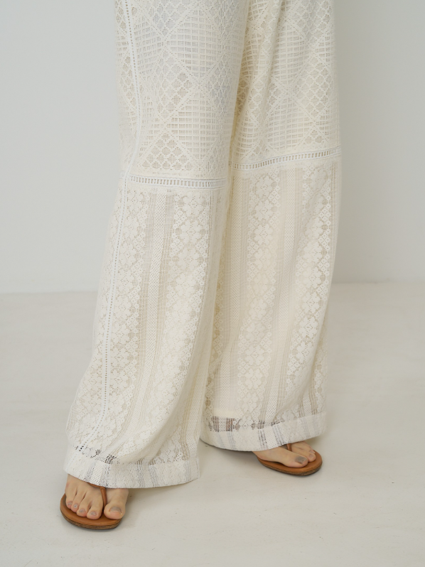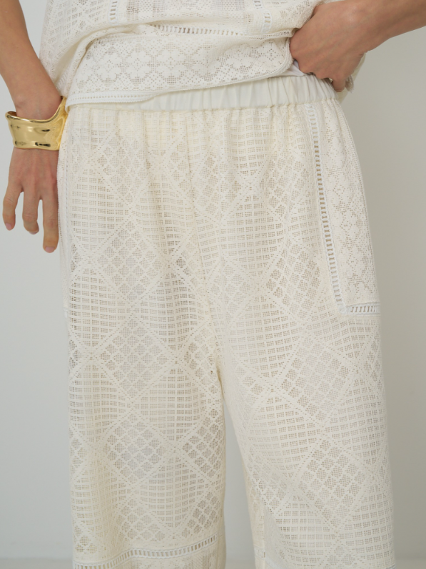 三種類のレースをパッチワークさせて作ったクラフト感あふれるデザインワイドパンツ。