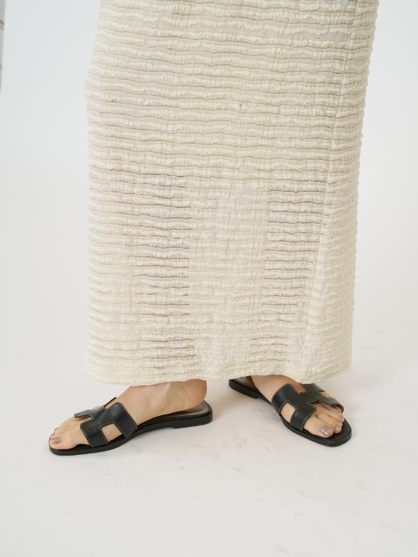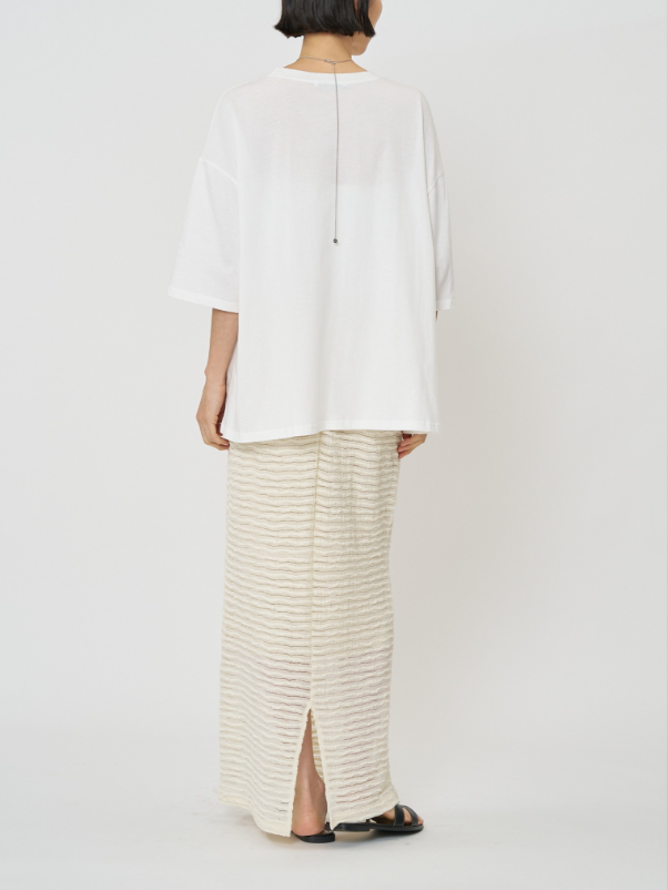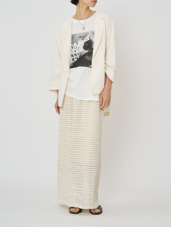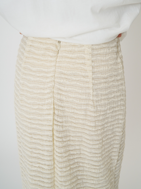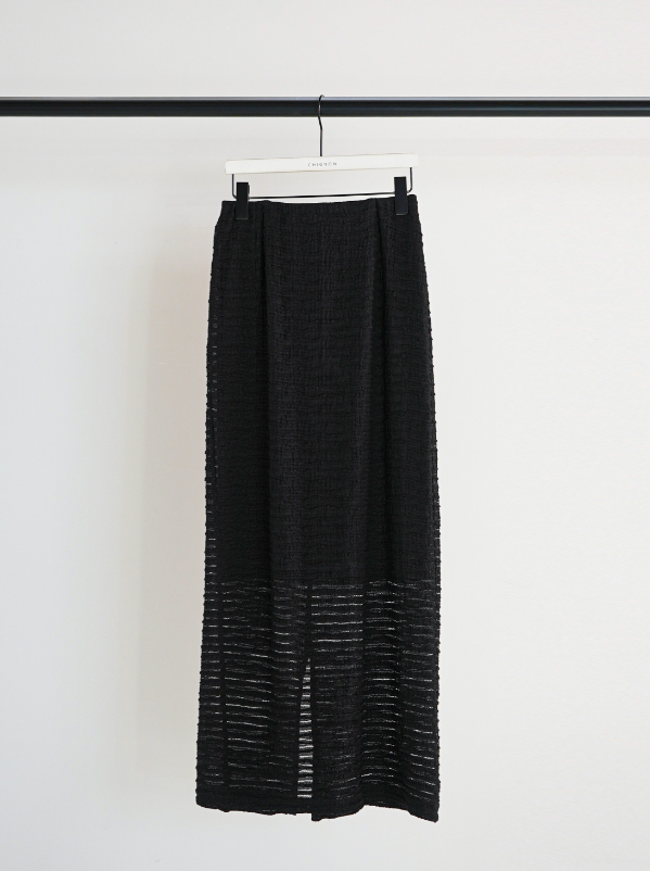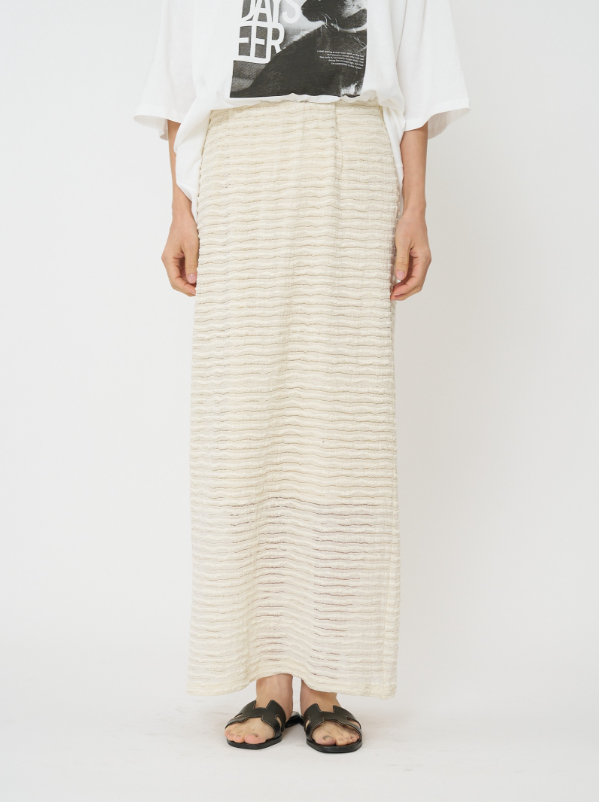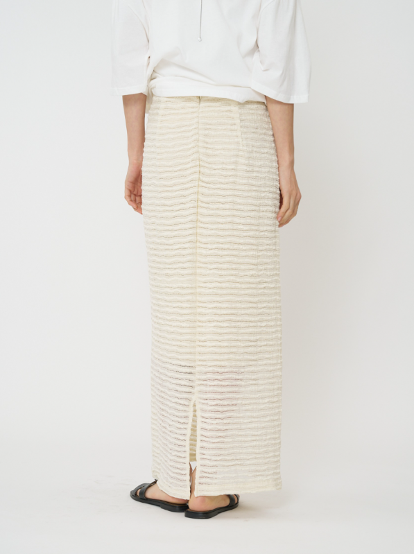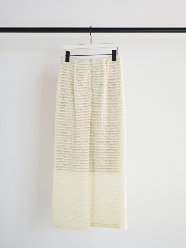クラフト感のあるジャカードレースを横づかいし、ボーダー調の畝が効いたストレッチ性の高いレーススカートに仕立てました。伸びの良い生地で動きやすく、スタイルアップ効果も抜群。足元の透け感が軽やかで、シンプルなスタイリングに華やかさをプラスしてくれます。