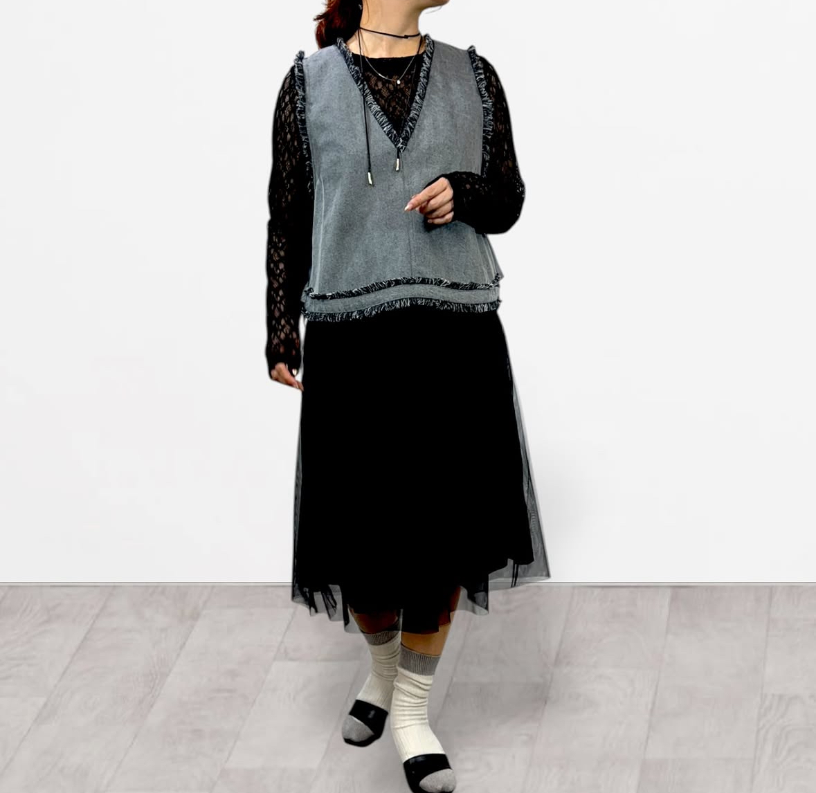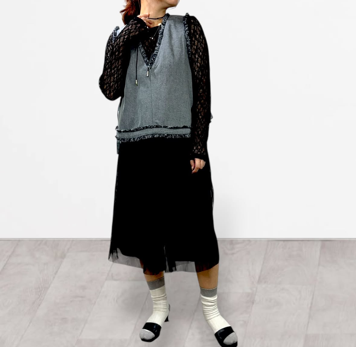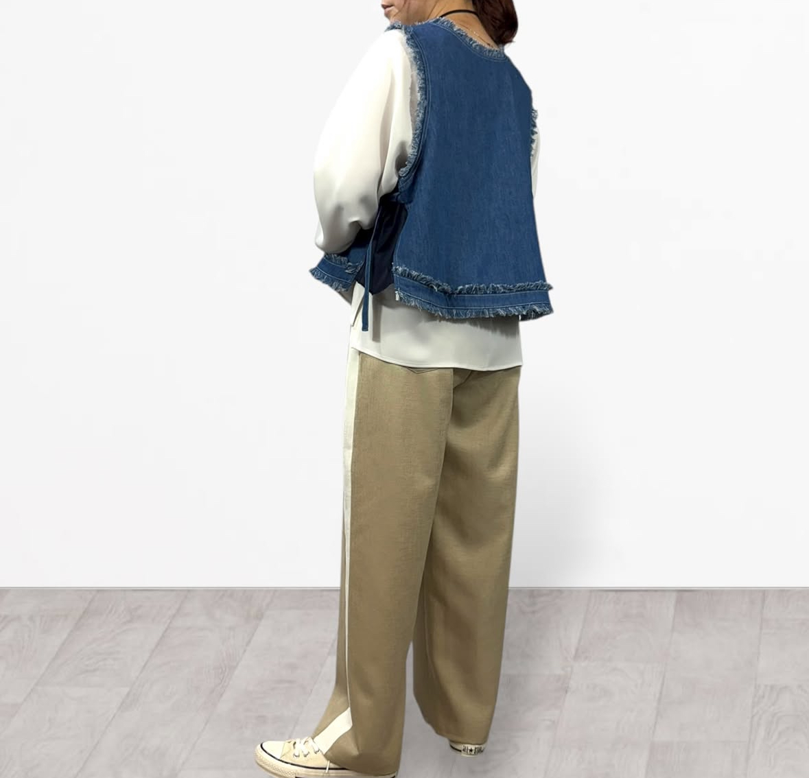 qtume リメイク風デニムコンビベスト 612-25054