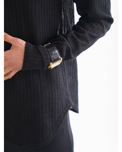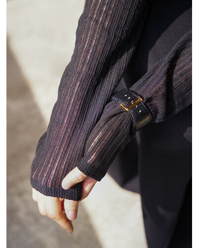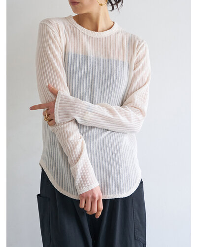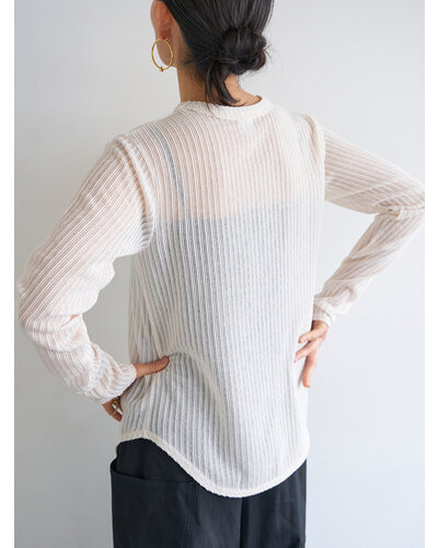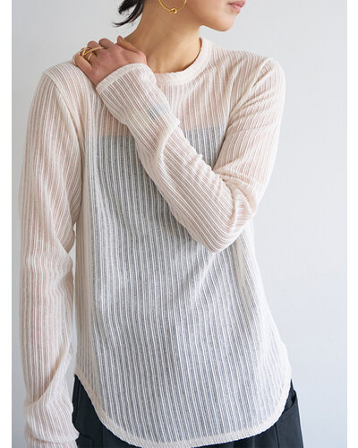 凹凸感のあるシアーストライプ素材を使用した、クルーネックのロンTEE。表面に立体感のあるストライプを施し、肌にのせるとさりげなく透ける軽やかな質感。主張しすぎないシアー感が、大人らしい落ち着きと抜け感を演出します。すっきりとしたクルーネックに、ベーシックなロングスリーブのシルエット。シンプルだからこそ素材の表情が際立ち、一枚でもインナーとしても活躍します。身体にやわらかくなじみ、ラインを拾いすぎない軽やかな着心地。日常のスタイリングに自然な奥行きを加えてくれる、大人のためのシアーロンTEEです。
