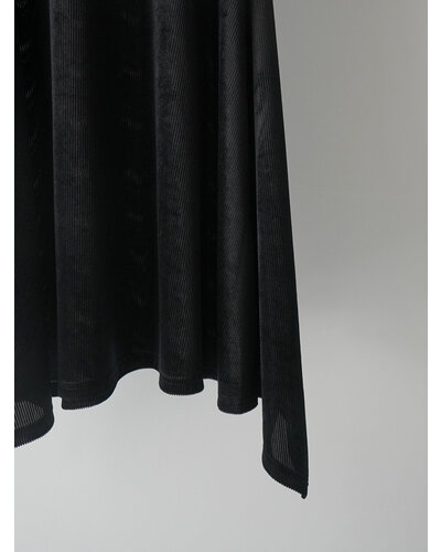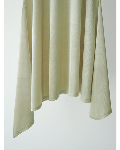 ベルベットの畝が生み出す立体感と、やわらかな起毛の光沢が印象的。落ち着いた表情の中に奥行きを感じさせる、秋らしい素材感が魅力です。両サイドにマチ切替を入れ、裾はイレギュラーヘム仕様に。動きに合わせて揺れるラインが自然なニュアンスをつくり、腰まわりやヒップラインをさりげなくカバーします。袖口はふんわりと折り返したデザインを採用。肩先をやわらかく覆うフレンチスリーブで、カジュアルすぎず上品なバランスに仕上げました。アウターやベスト、トップスの下に重ねると、イレヘムの裾がレイヤードのアクセントに。トレンドのレイヤードスタイルを、秋らしい素材感でアップデートしてくれる、深みのある表情で魅せる、大人のためのレイヤードチュニック。