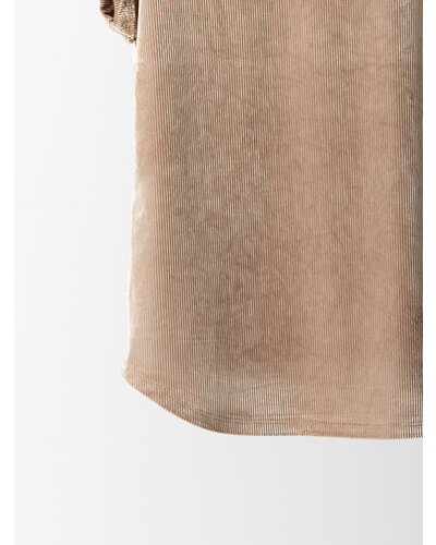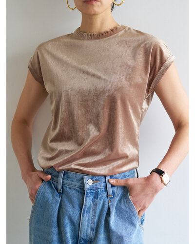 ベルベットの畝が立体的な陰影を生み、シンプルなフォルムに奥行きを与える一枚。やわらかな起毛感と上品な光沢が、落ち着いた華やかさを演出します。すっきりとしたクルーネックに、肩まわりを自然に覆うコンパクトなスリーブデザイン。身体のラインを拾いすぎないなめらかな落ち感で、上品に着こなせます。一枚で素材の表情を楽しむのはもちろん、ジャケットやカーディガンのインナーとしても存在感を発揮。控えめでありながら印象に残る、デイリーに使える大人のためのベルベットトップスです。