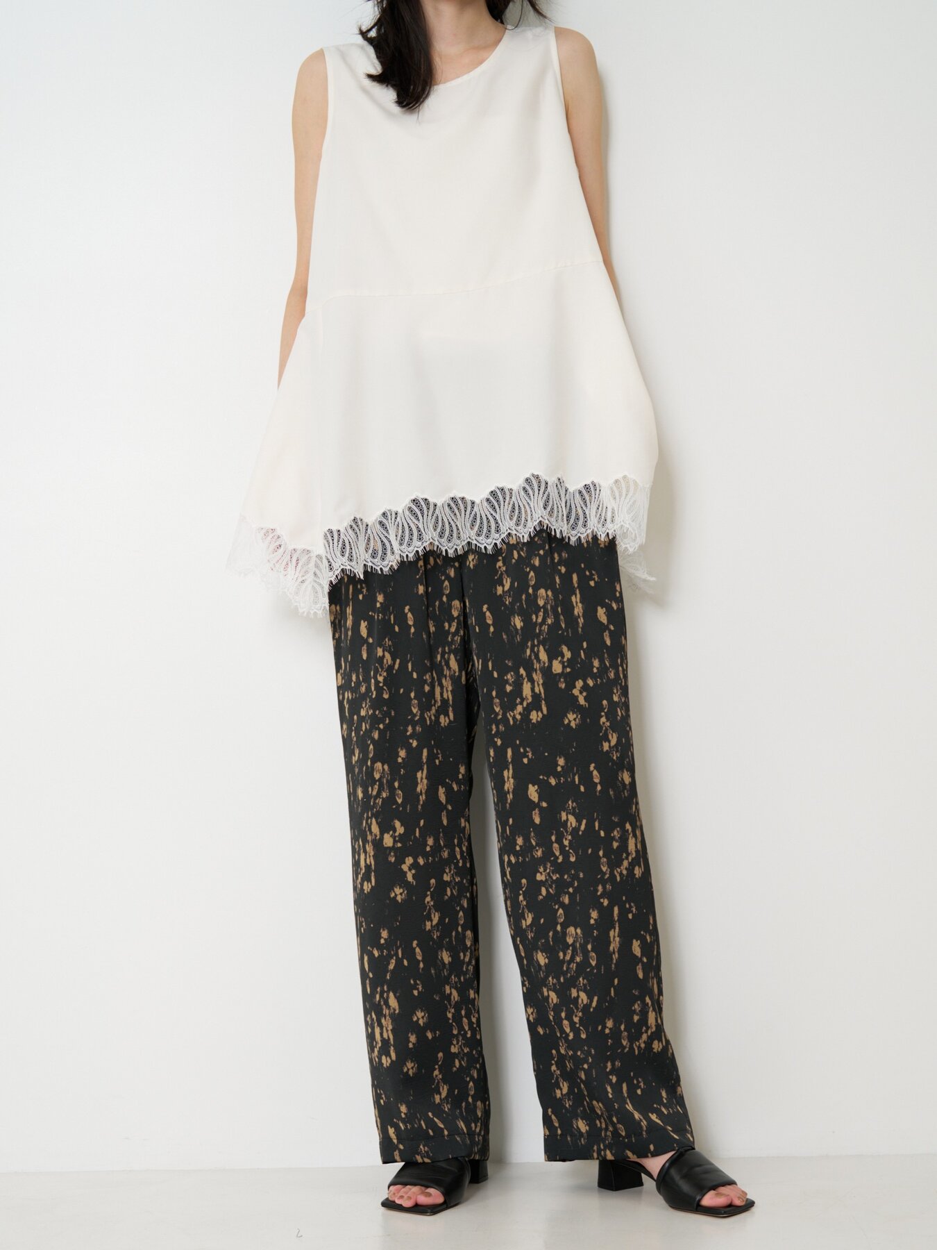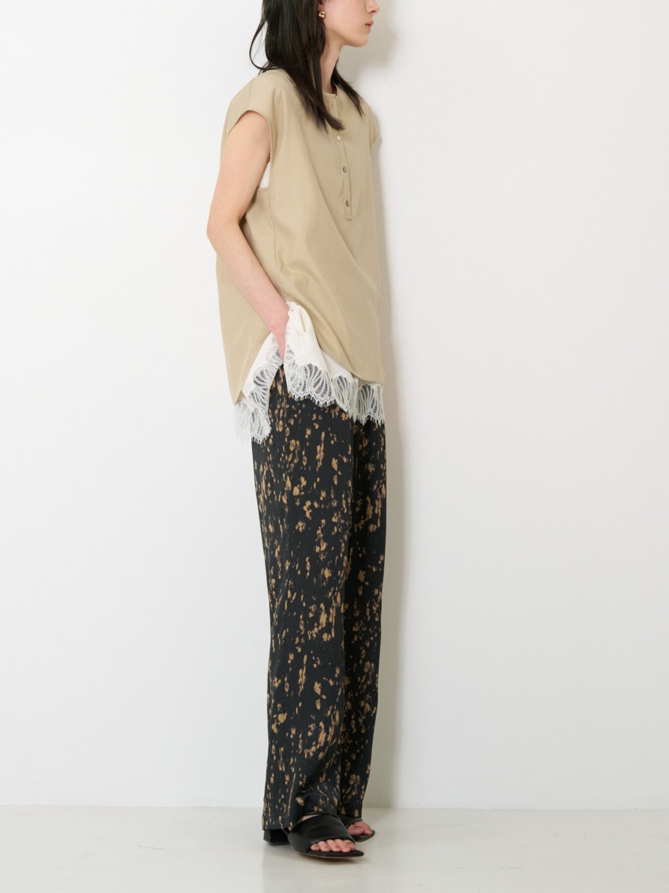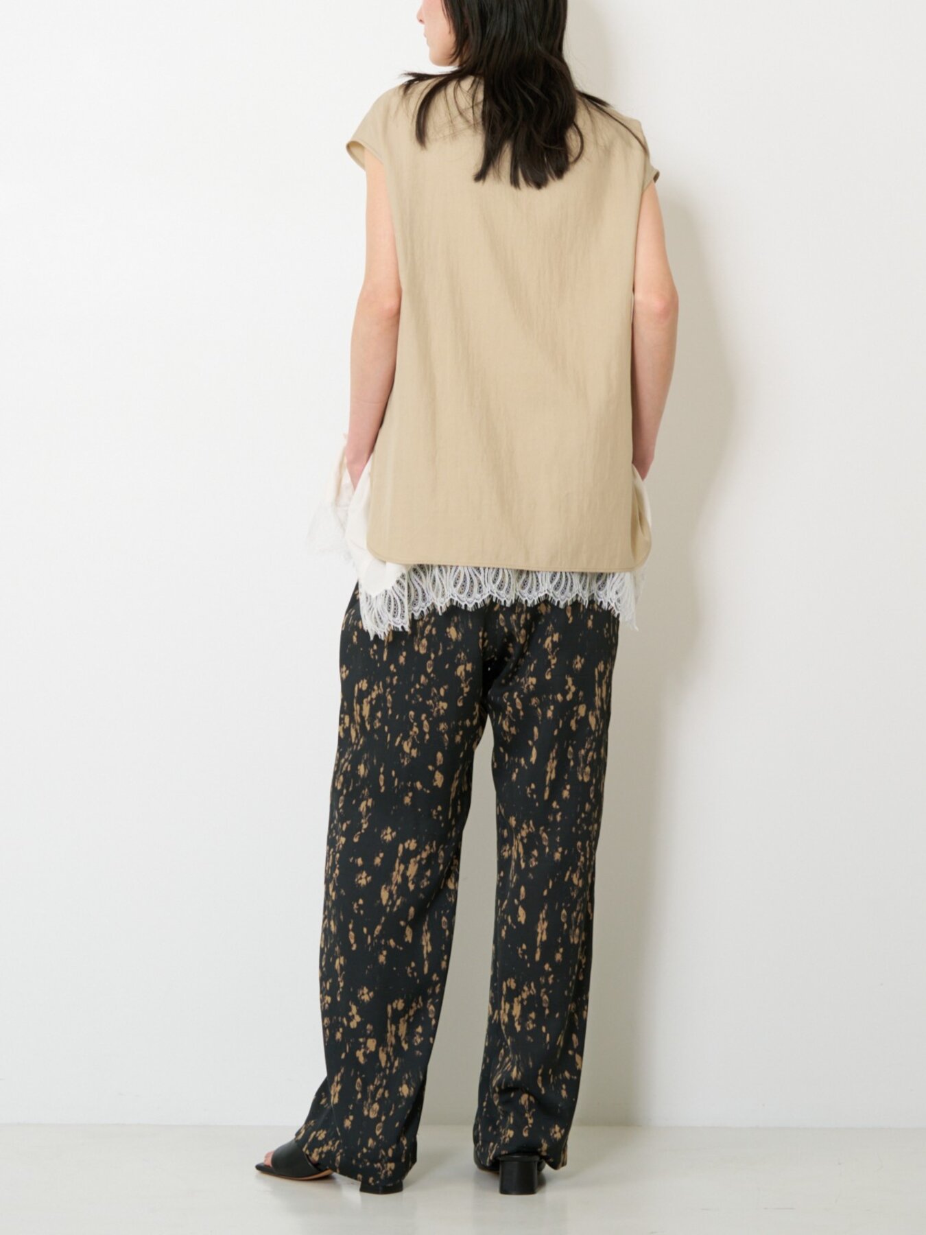 ウエストはゴム仕様でリラックス感のある穿き心地。すとんと落ちるストレートシルエットが脚のラインをすっきりと見せ、ラフになりすぎない上品な印象に仕上げます。