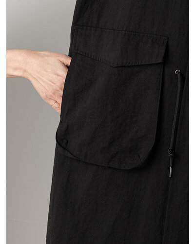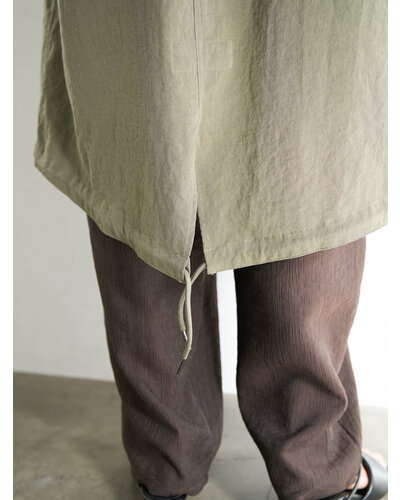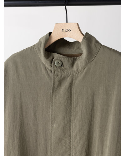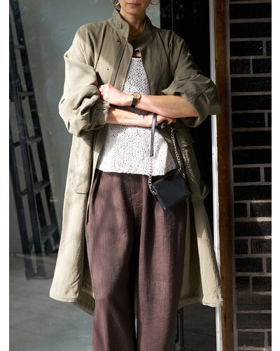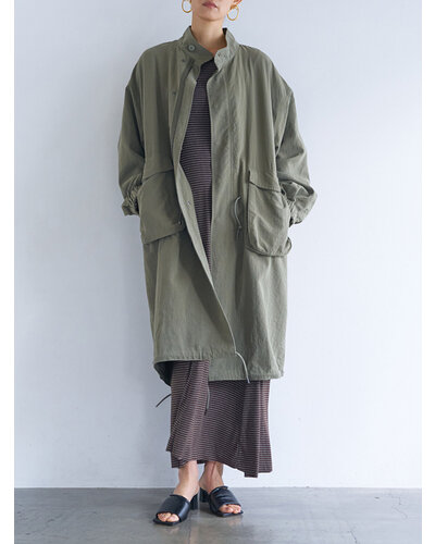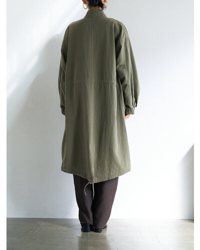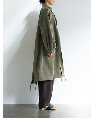 レーヨンやテンセルの柔らかで落ち感のある素材を使用し、たっぷりとしたボリュームがありながらも着膨れしない、大人の女性にぴったりなミリタリーコートに仕上げました。少しウールもブレンドすることで、素材の風合いが目を惹く奥行きのある表情に。さらに洗い加工を施すことで、より立体感とこなれた雰囲気を演出しています。袖口は2段階で調整可能。季節の変わり目で暑さを感じる時期には、シャツのように袖をたくし上げてラフに着こなせる仕様です。ポケットはフラップ付きのビッグポケットながら、サイドからも手を入れられる実用性の高いデザインに。