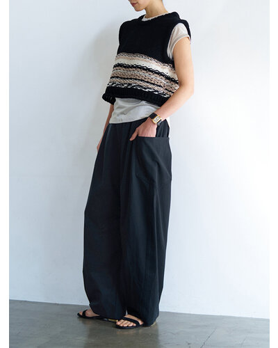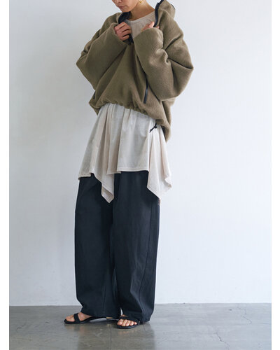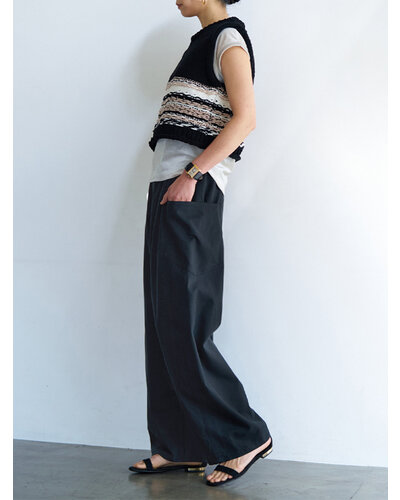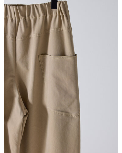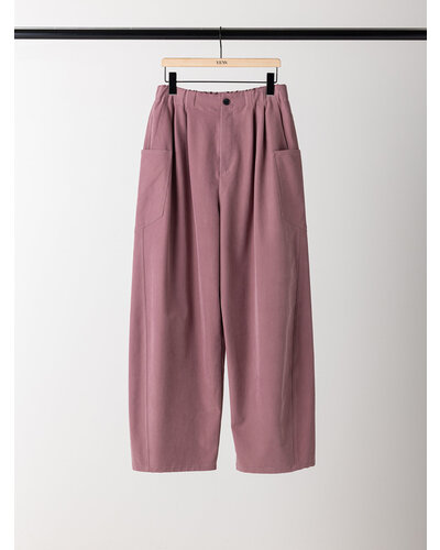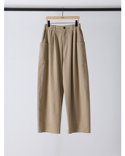 上質なドレープ感と微光沢のあるレーヨン混のツイル生地を使用。女性らしい素材感とマニッシュな雰囲気がMIXされた大人のカジュアルパンツに仕上げました。脇に施したビッグポケットデザインは、ヒップを程よくカバーすることで小尻効果に。とにかく大容量のポケットで、仕事で使用する書類やペットボトルなど、通常のパンツでは入らないような物も収容できるので、実用的なのもうれしいポイントです。ウエストはALLゴムのファスナー開き仕様、ベルト裏に紐をとおしてあるので、さまざまなサイズに対応できるよう設計しています。裾は靴の上で止まるように少し小さめにしてあるので、裾を引きずりにくくなっています。