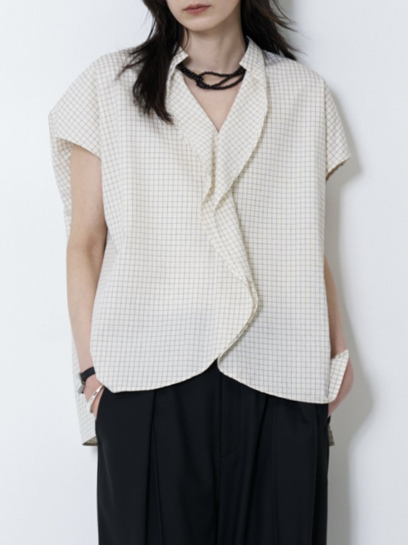 シャープなVネックラインが首元をすっきりと見せてくれます。