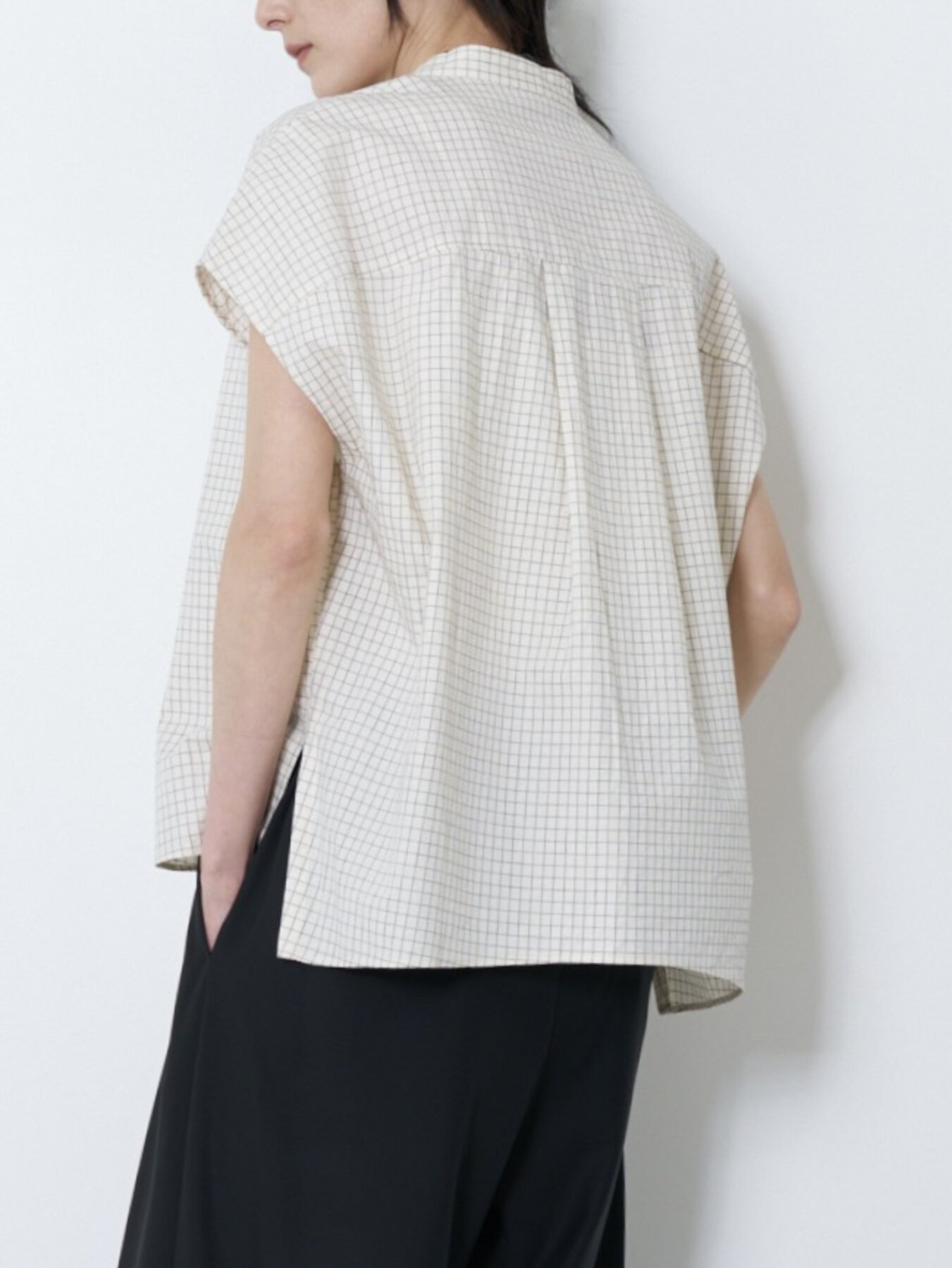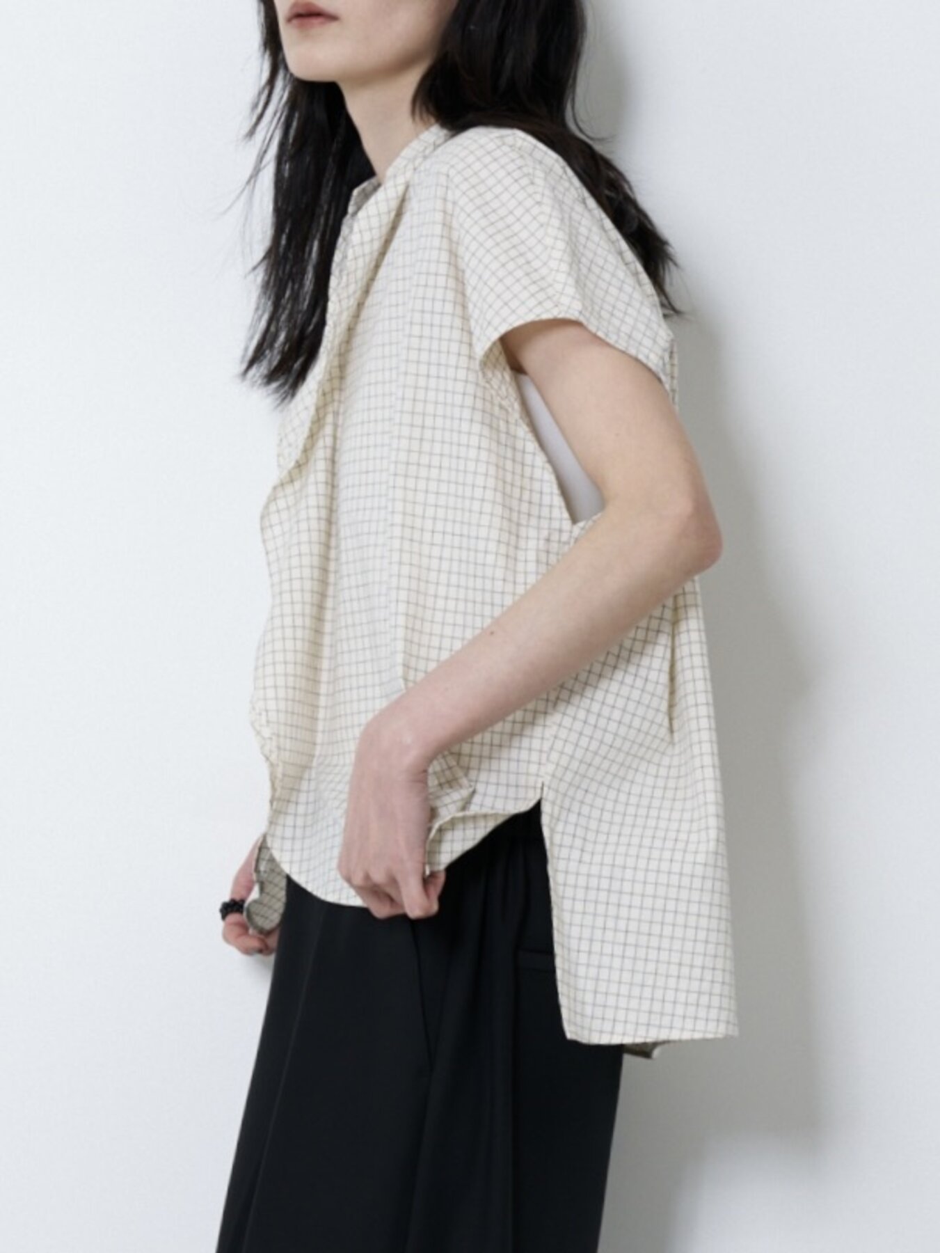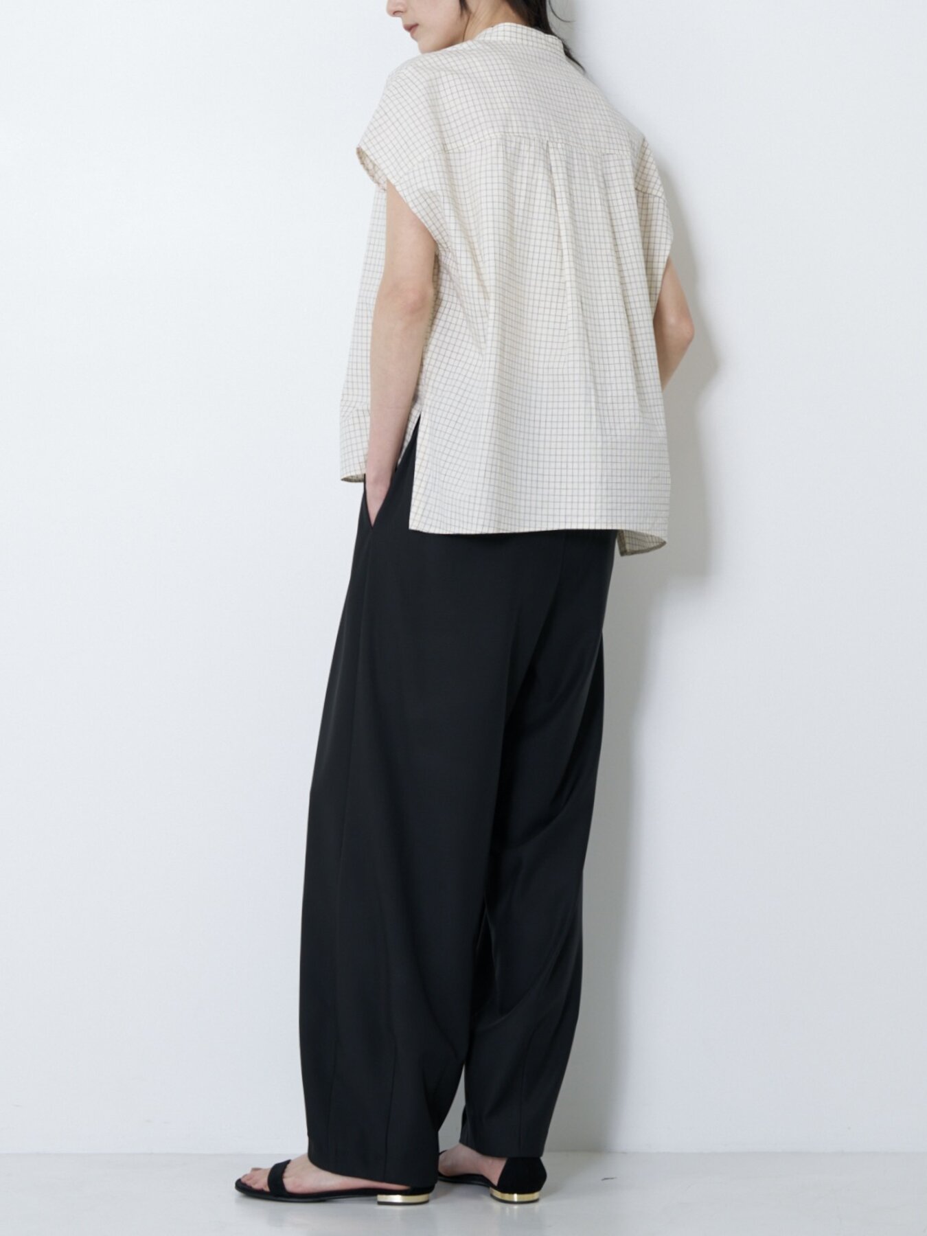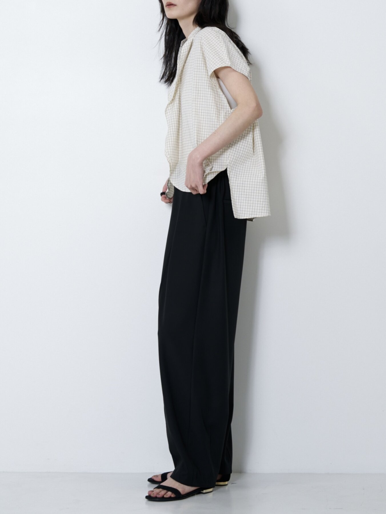 肩をやさしく覆うフレンチスリーブと、立体感あるボックスシルエットで抜け感あるバランスに。