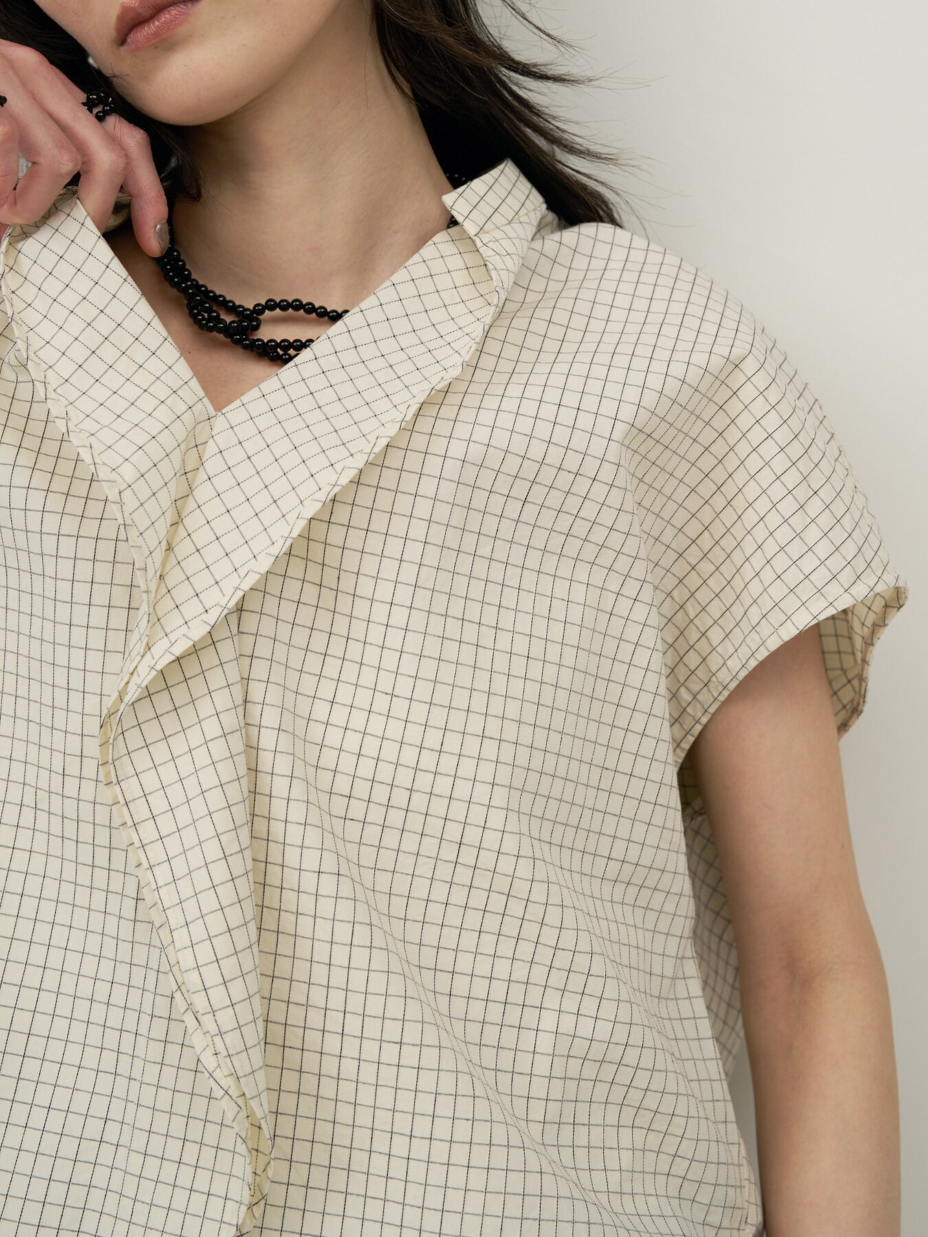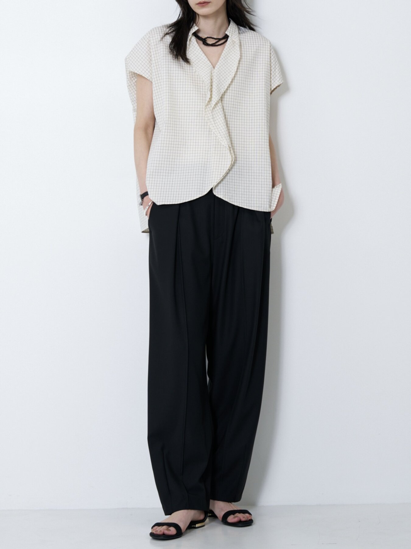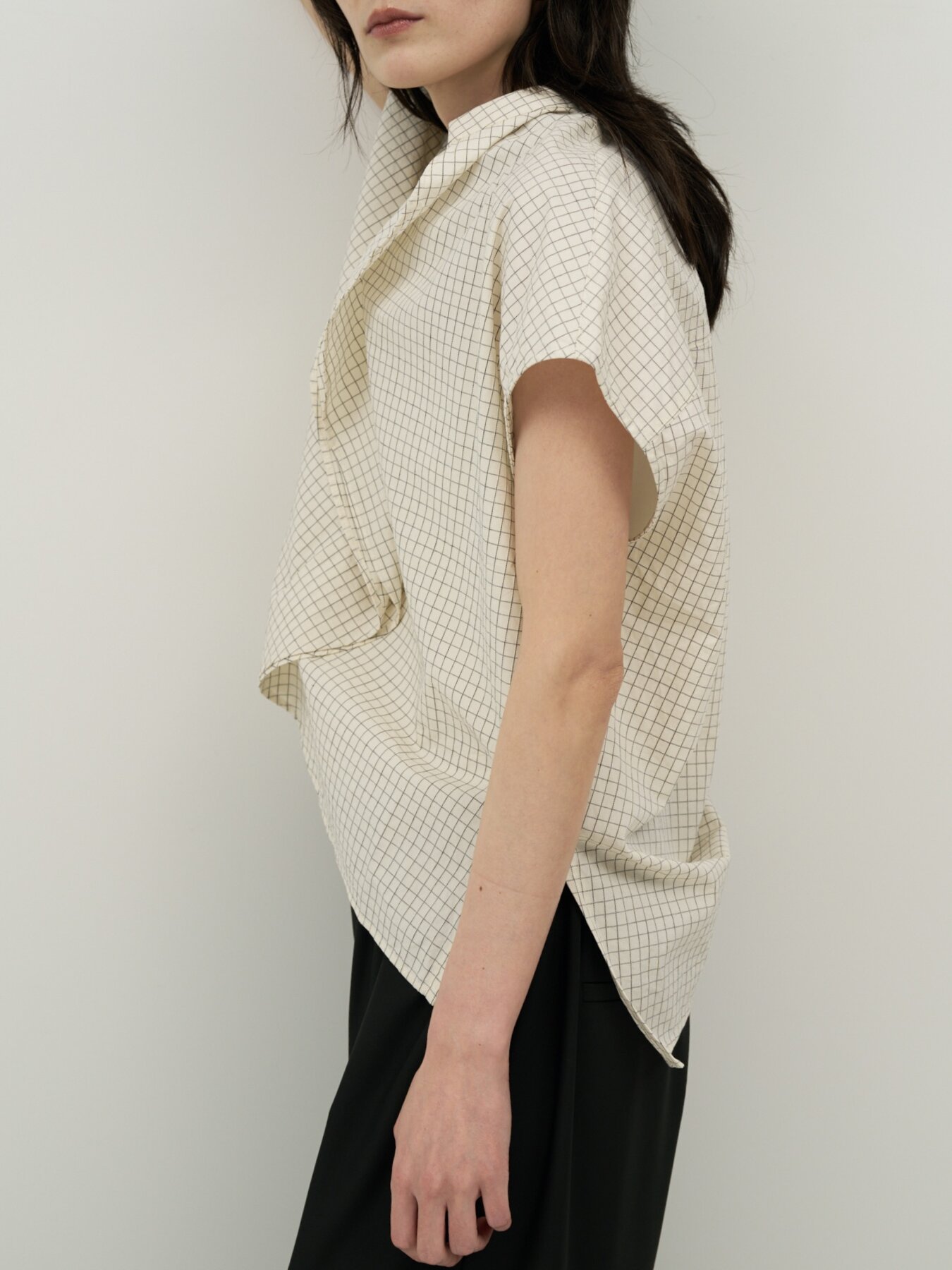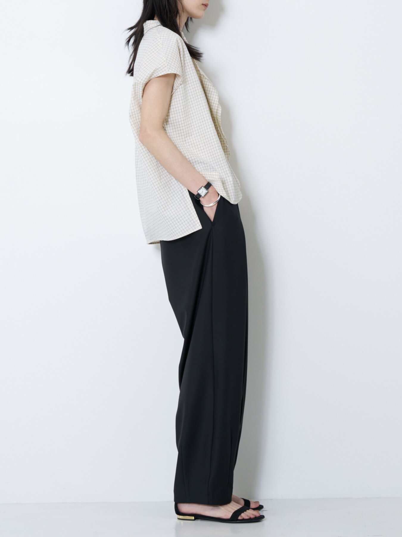 肩をやさしく覆うフレンチスリーブと、立体感あるボックスシルエットで抜け感あるバランスに。
