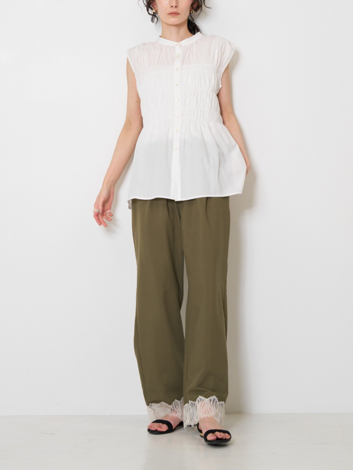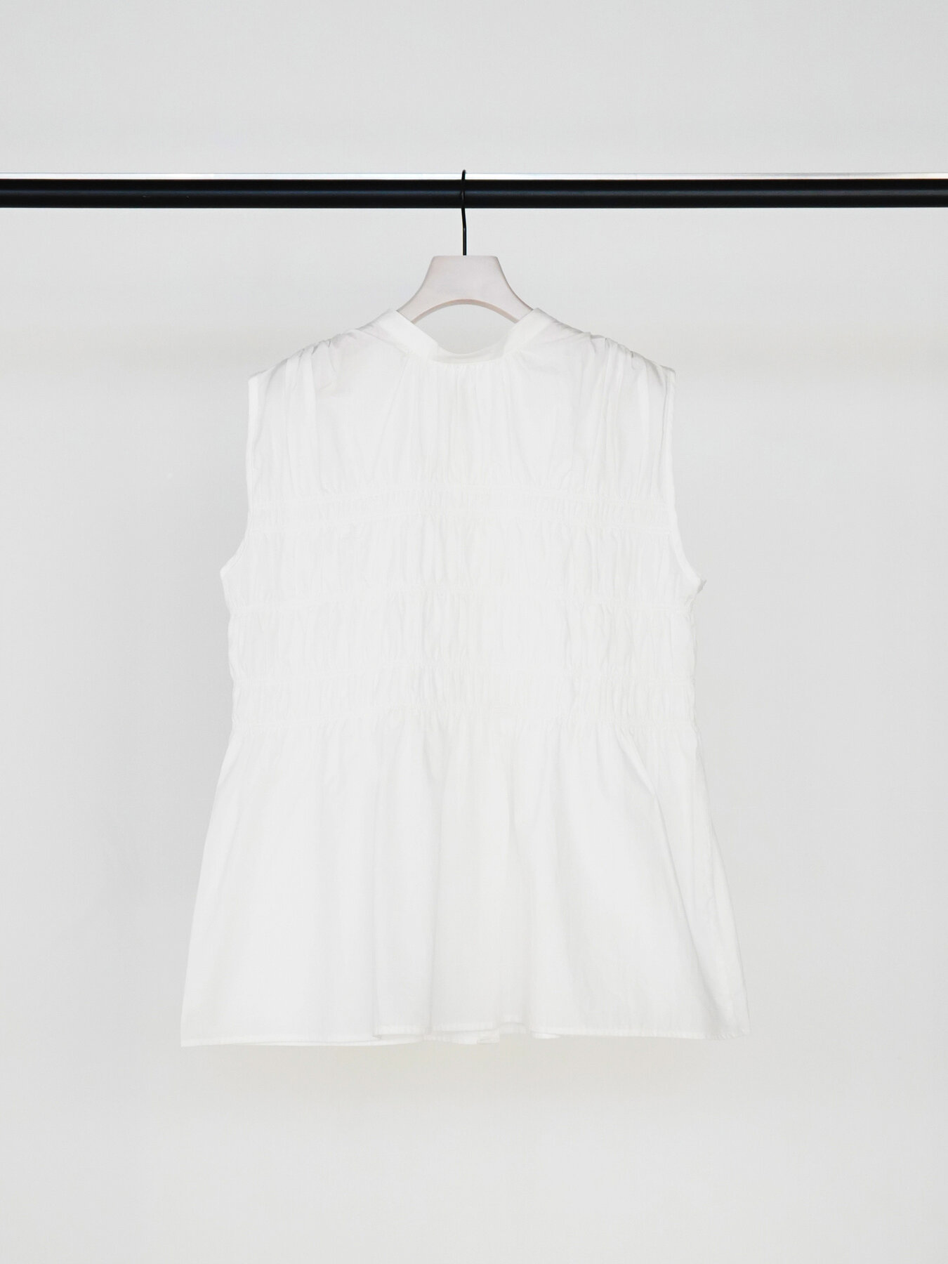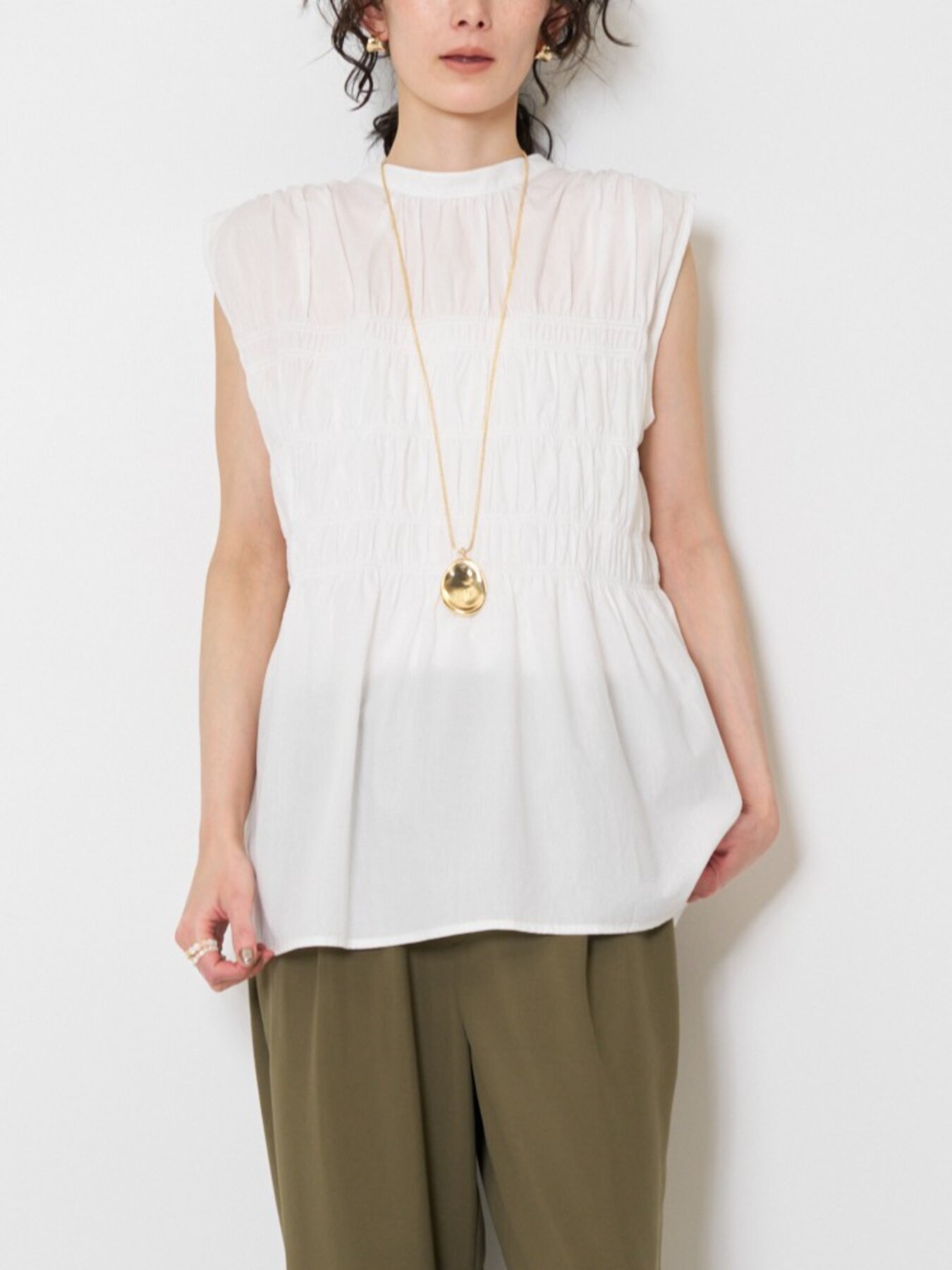 やわらかなコットン素材を使用した、シャーリングブラウス。