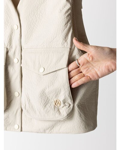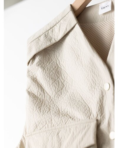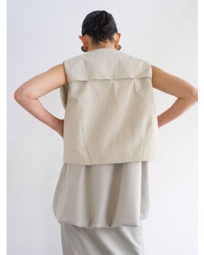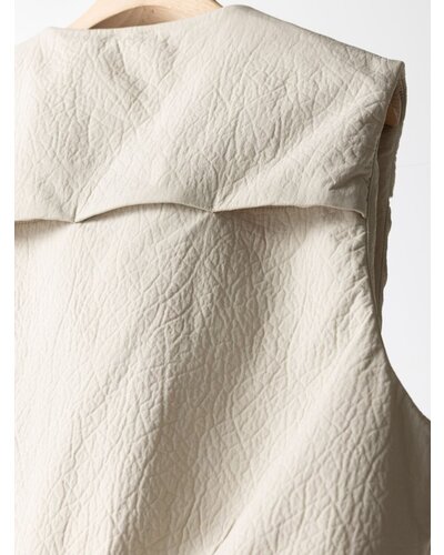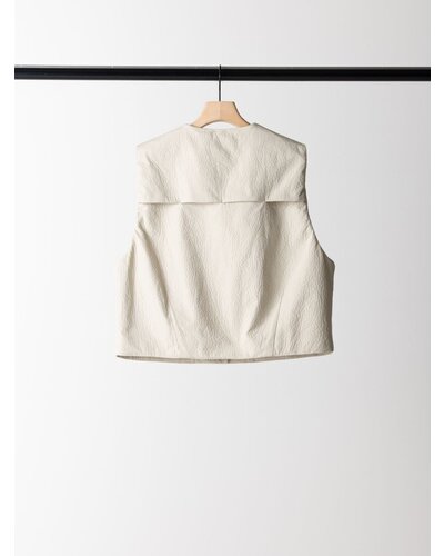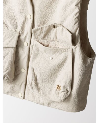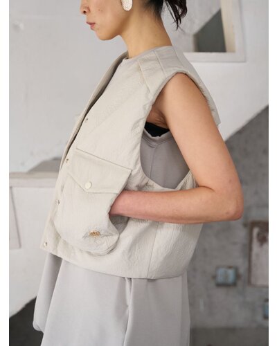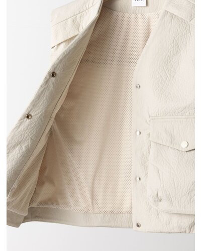 レザー調のエンボス素材を使用した、PUFFY MILITARY VEST。表面はさりげない凹凸感のあるレザーライクな質感。ハードになりがちなミリタリーデザインを、上品な印象へと引き上げます。裏側にはカットソー素材をボンディングし、中綿なしでもふんわりとした立体感を実現。やわらかな着心地で身体になじみ、衿まわりも優しい印象に仕上げています。イージーケアでご自宅でのお洗濯が可能なのも嬉しいポイントです。ポケットはフラップ付きのビッグポケット仕様。存在感がありながら、サイドからも手を入れられる実用的なデザインに。カジュアルな中に、絶妙なふんわり感が大人の可愛らしさをさりげなく引き立てます。背中ヨークにはベンチレーション機能を採用。さらにメッシュ裏地を使用することで、肌当たりの良さと通気性を確保しました。残暑の時期から快適に着用いただけます。細部までこだわり抜いた、存在感のある一枚。