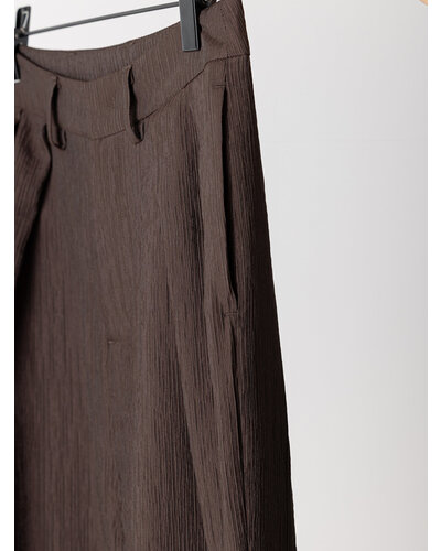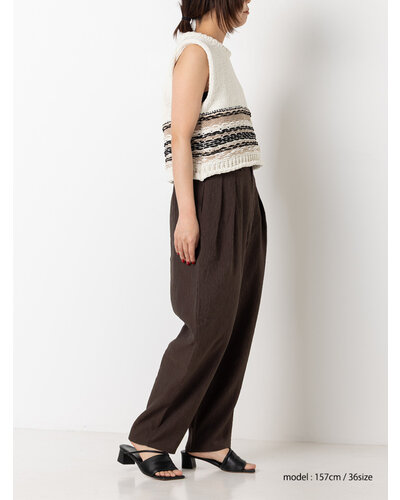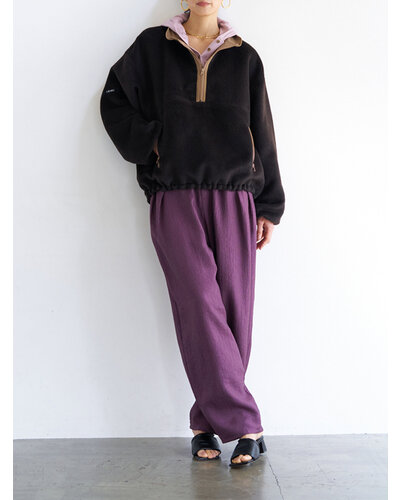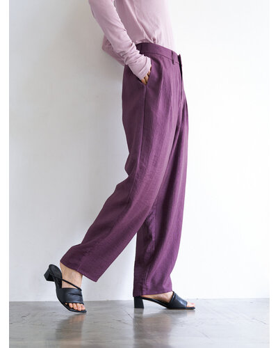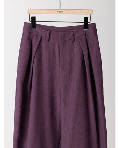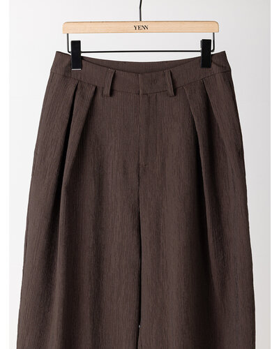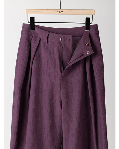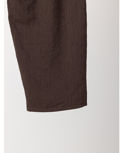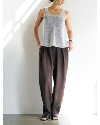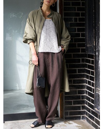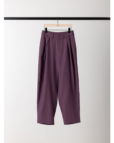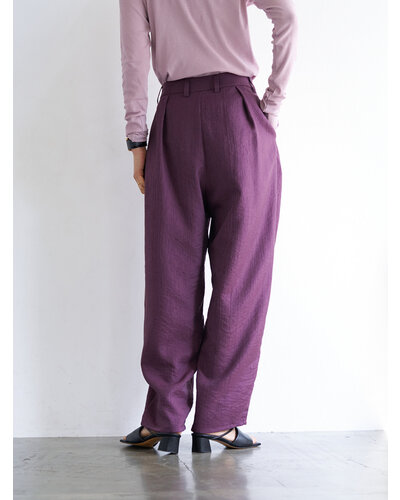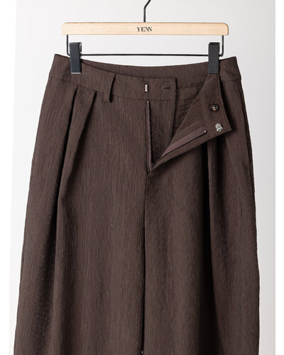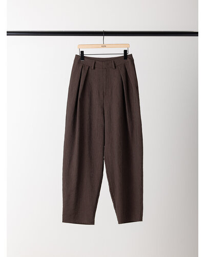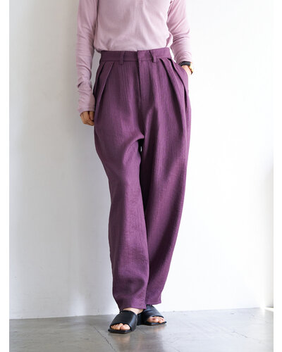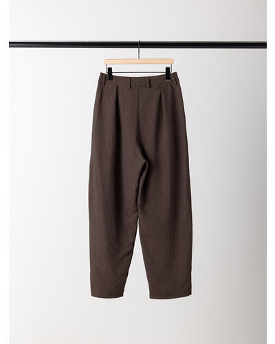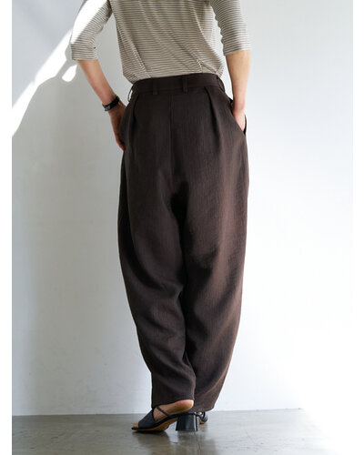 さりげない艶感と、楊柳のような縦畝が特徴の素材を使用し、カービーなカッティングのパンツに仕上げました。軽やかで落ち感がありながら、程よいハリも兼ね備えた生地感は、まだ暑さの残る秋にも快適に着用いただけます。上品なツヤがほどよい存在感を生み、シンプルなトップスともバランスよくスタイリングできる一本です。腰まわりにはしっかりとタックを入れることで立体感を持たせ、ヒップラインをさりげなくカバー。リラックス感と美しいシルエットを両立した、大人のためのパンツです。