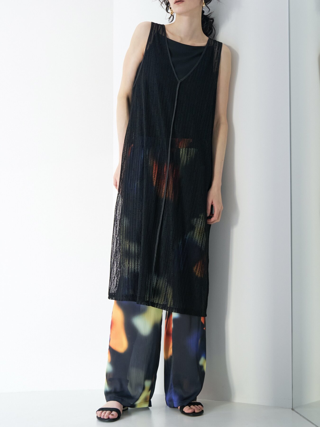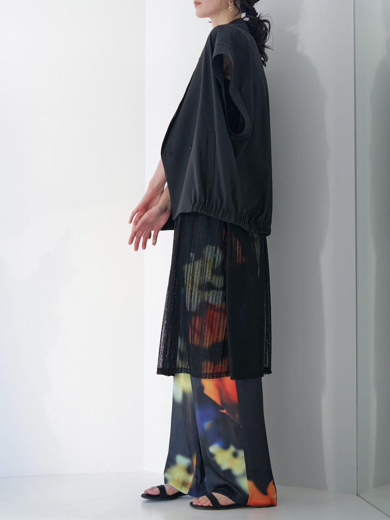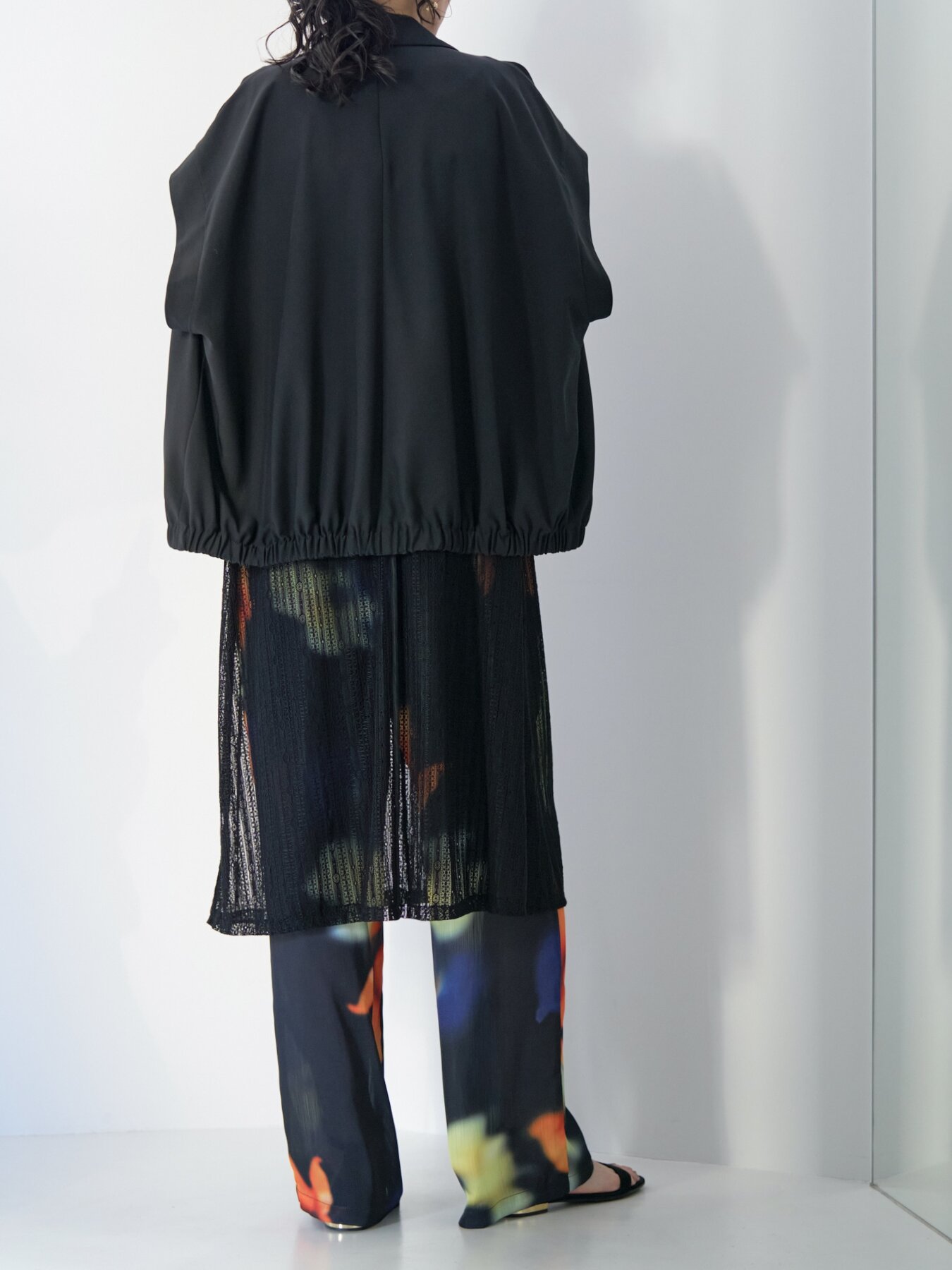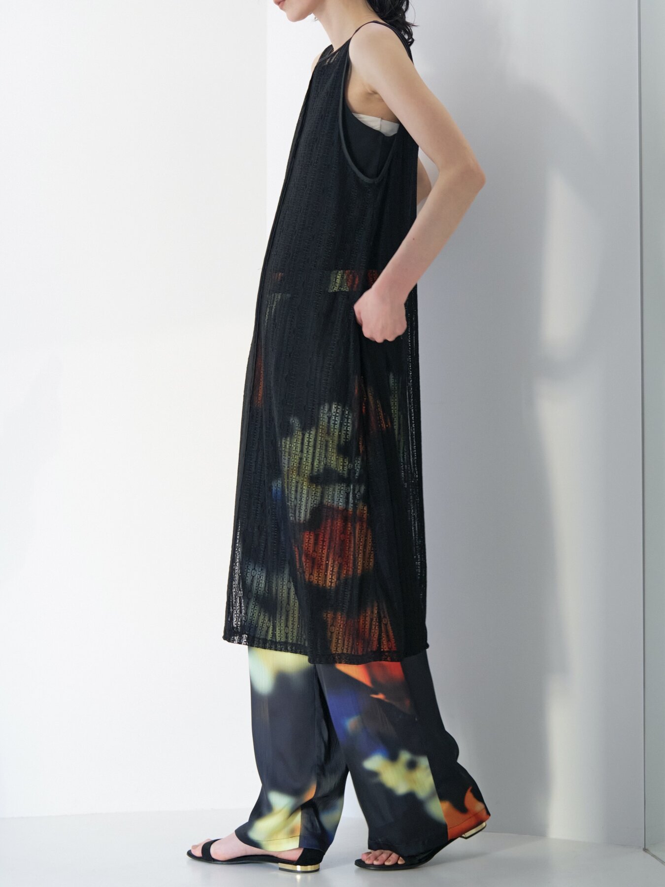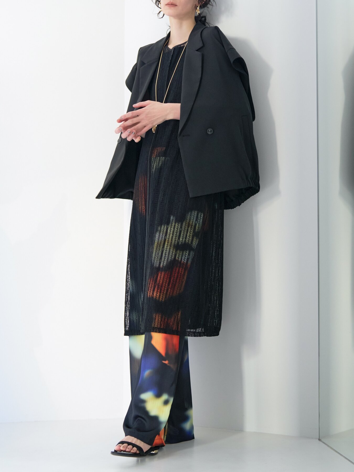 甘さを抑えた落ち感のあるストレートフォルムで、透かすことで魅せるニュアンスモードな1枚。