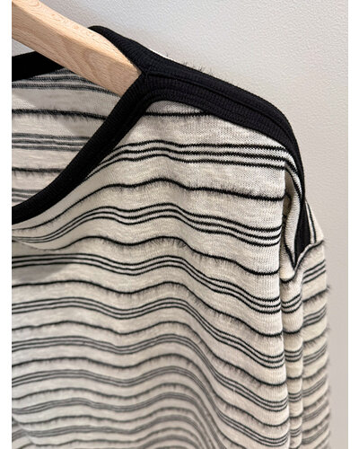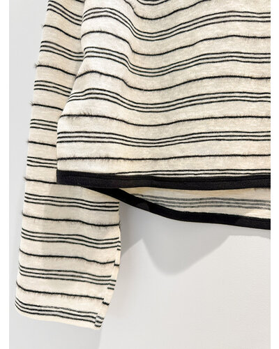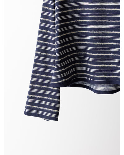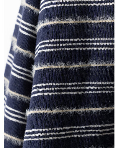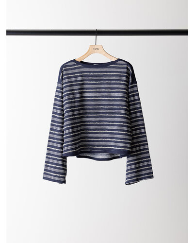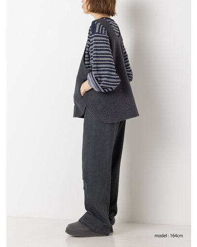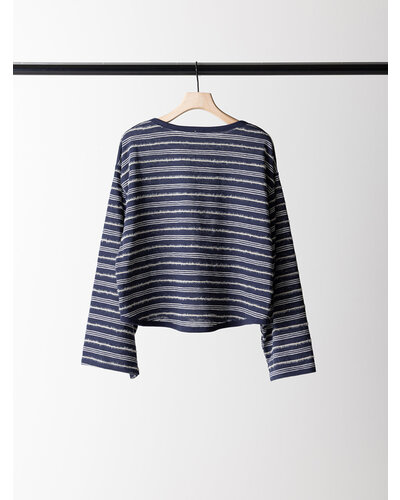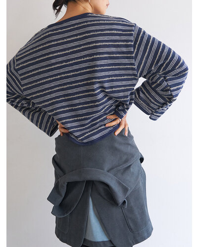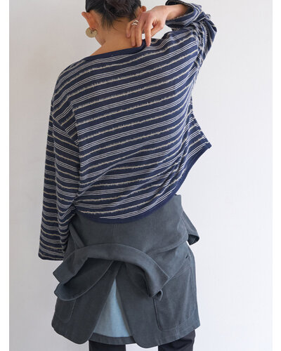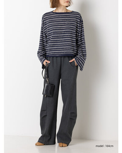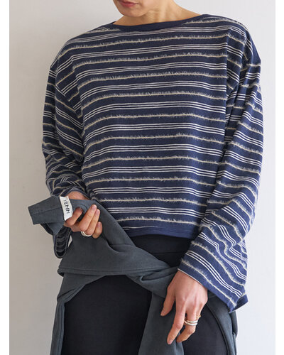 マルチボーダーの一部がフェザー素材で切り替えられている素材を使用した印象的なボーダートップス。ふわふわと柔らかな毛足のあるフェザーラインが、カジュアルなボーダーにさりげない女性らしさを添えています。衿ぐりはボートネックに仕上げ、デコルテを美しく見せる上品なシルエットに。ワイドなスリーブと、バランスよく設定した着丈がポイント。スカートやボリュームのあるパンツとも好相性で、シンプルなスタイリングでも程よい存在感を放つ一枚です。