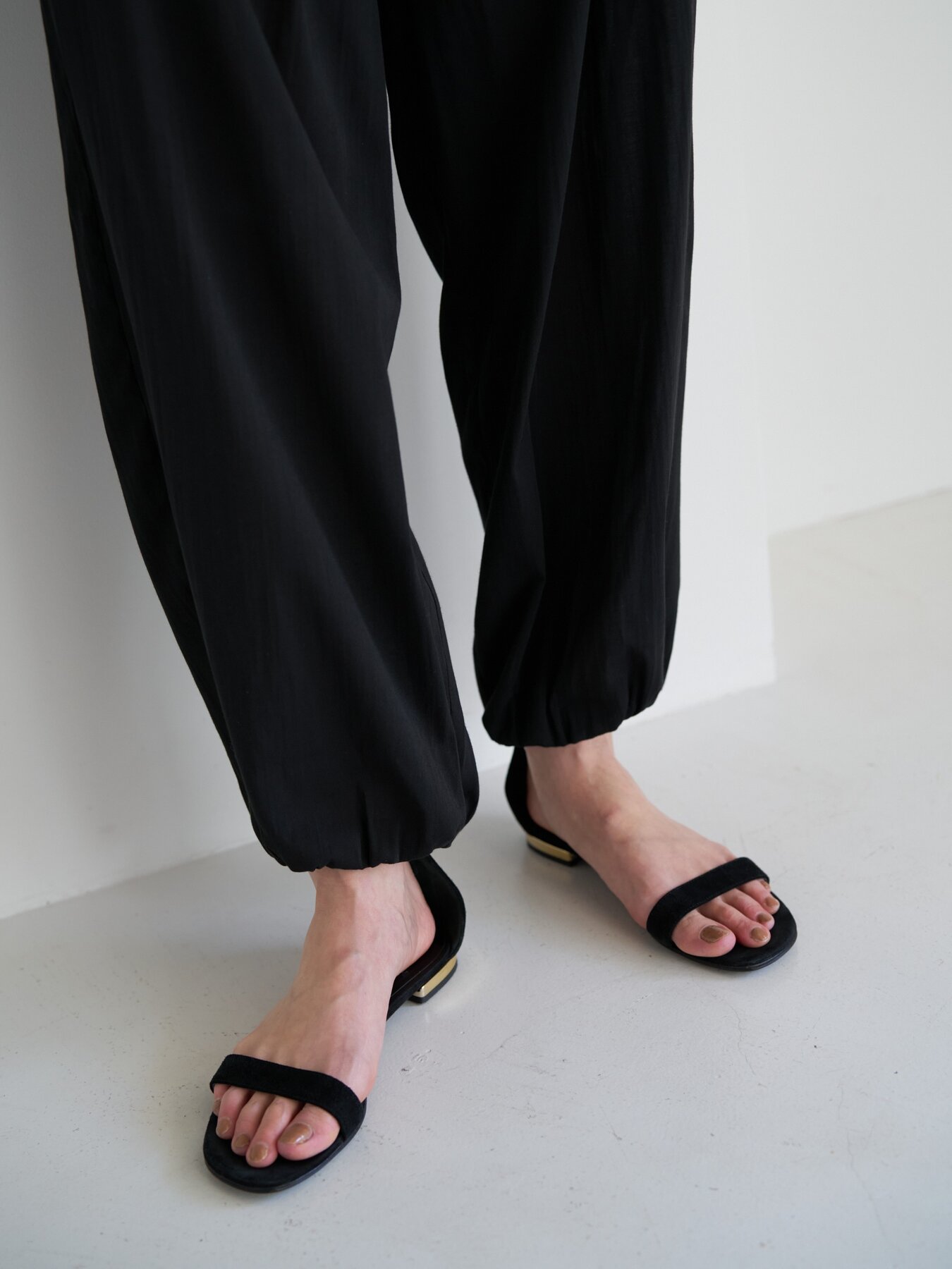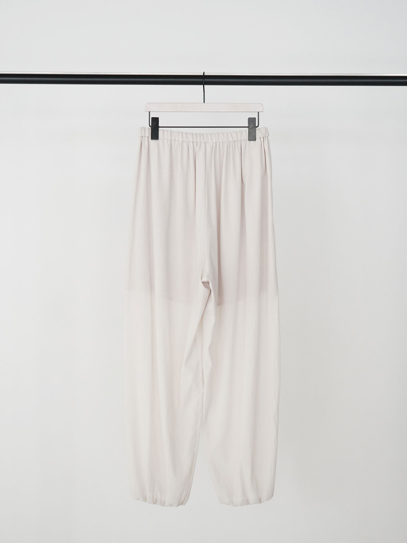 裾にはゴムを入れ、さらにゴムを内側に巻き込む仕様にすることで、カジュアル感を抑え、きれいめなモード感をプラス。