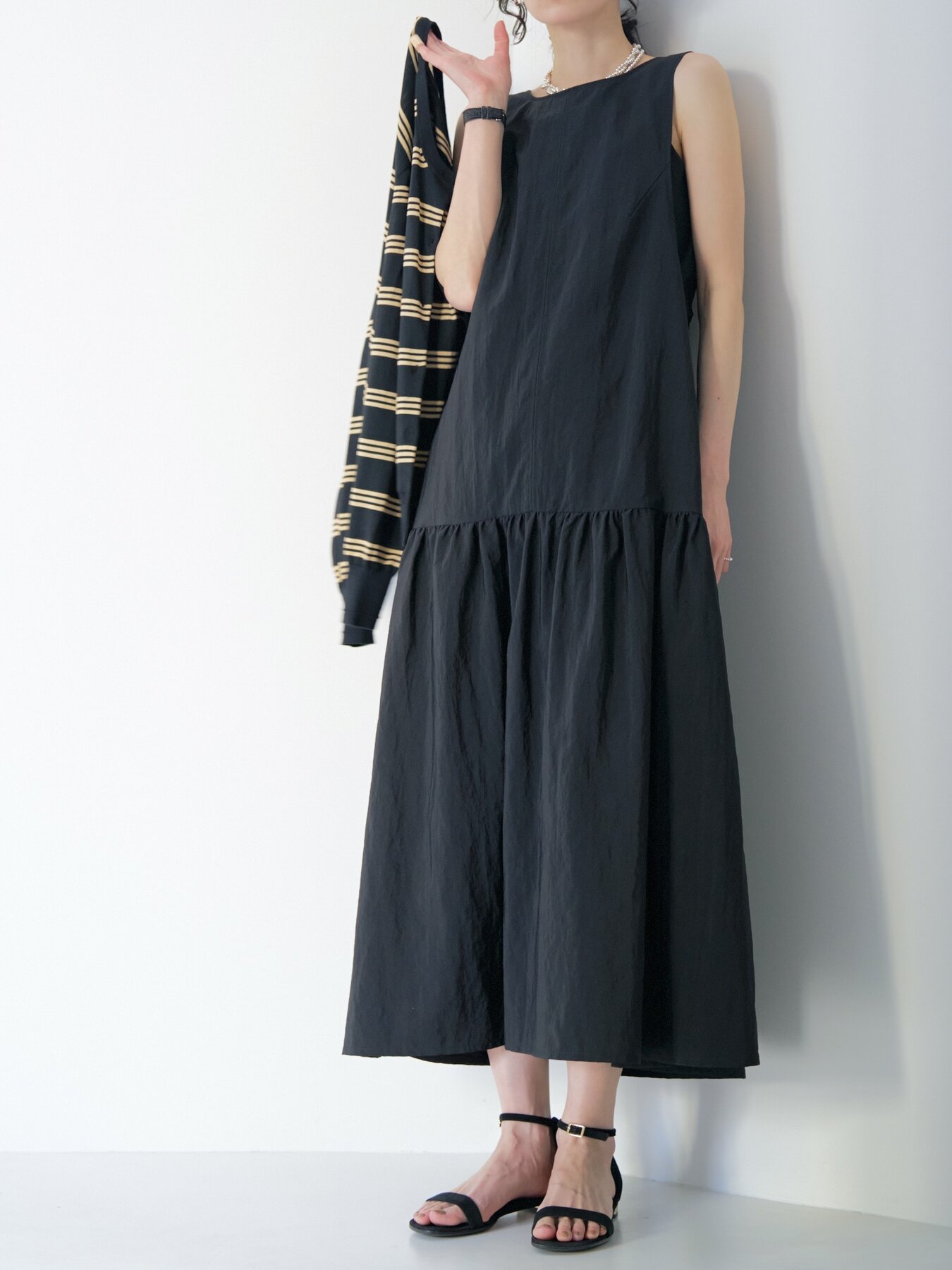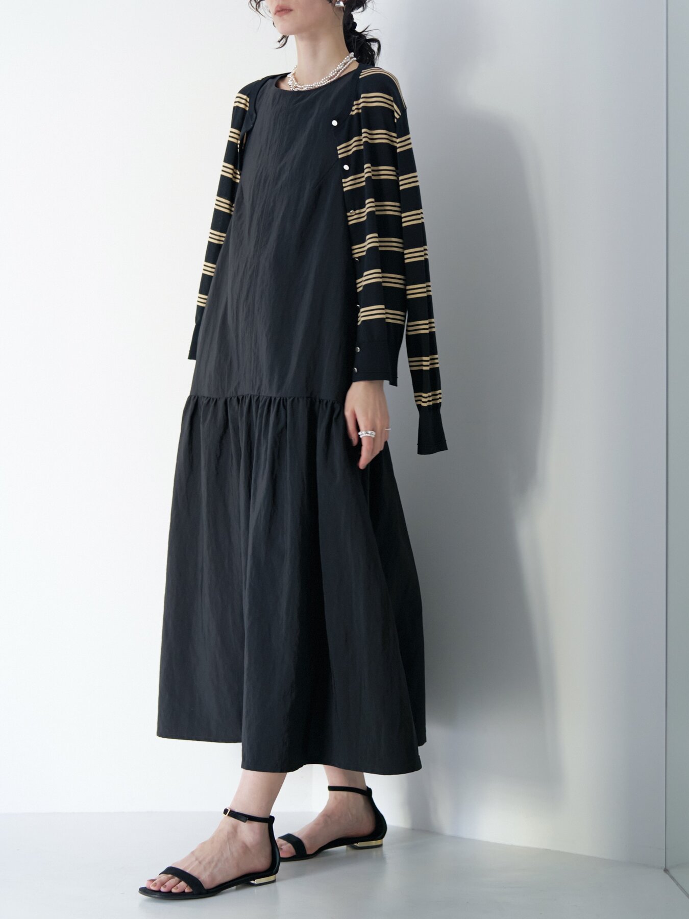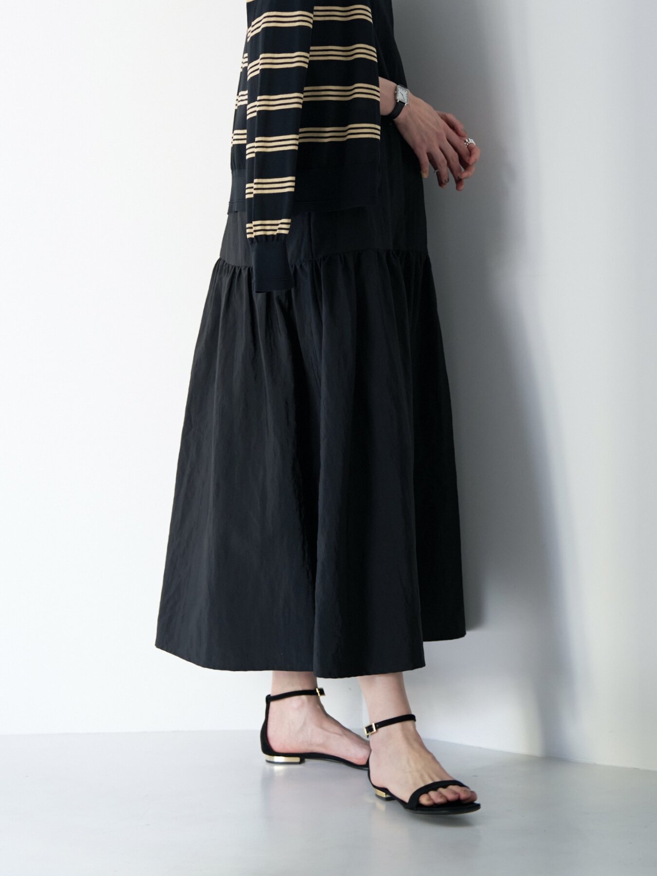 すっきりとしたストレートな身頃から分量感のあるティアードギャザーへと続くシルエットが、甘さを抑えたモードなニュアンスを作り出しています。