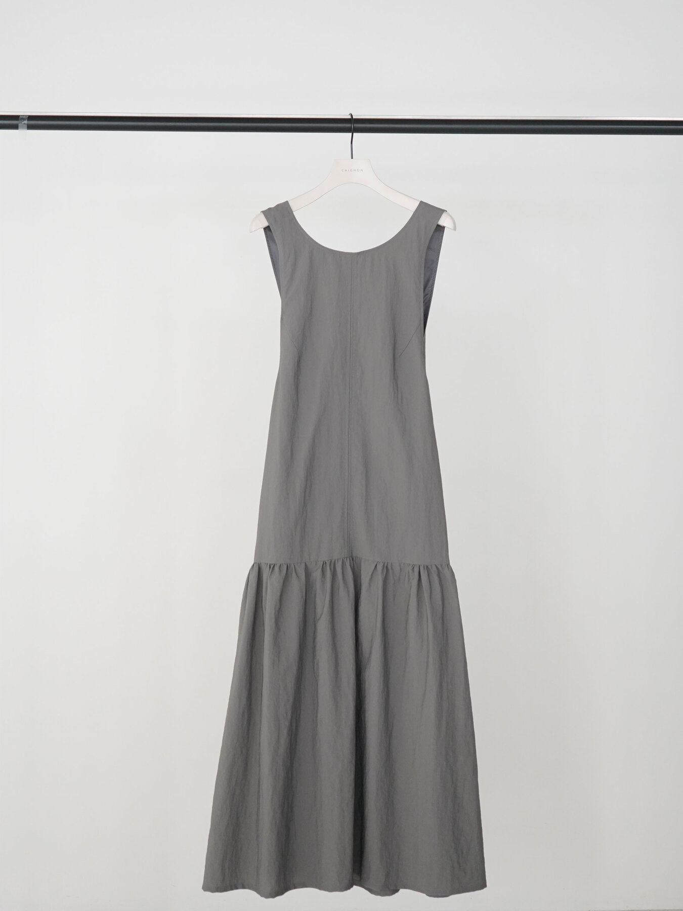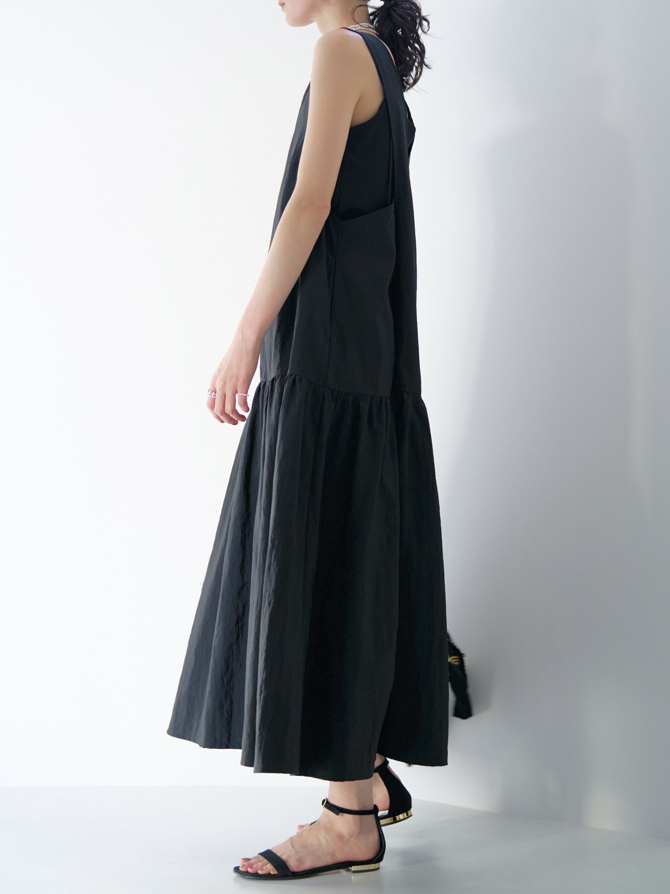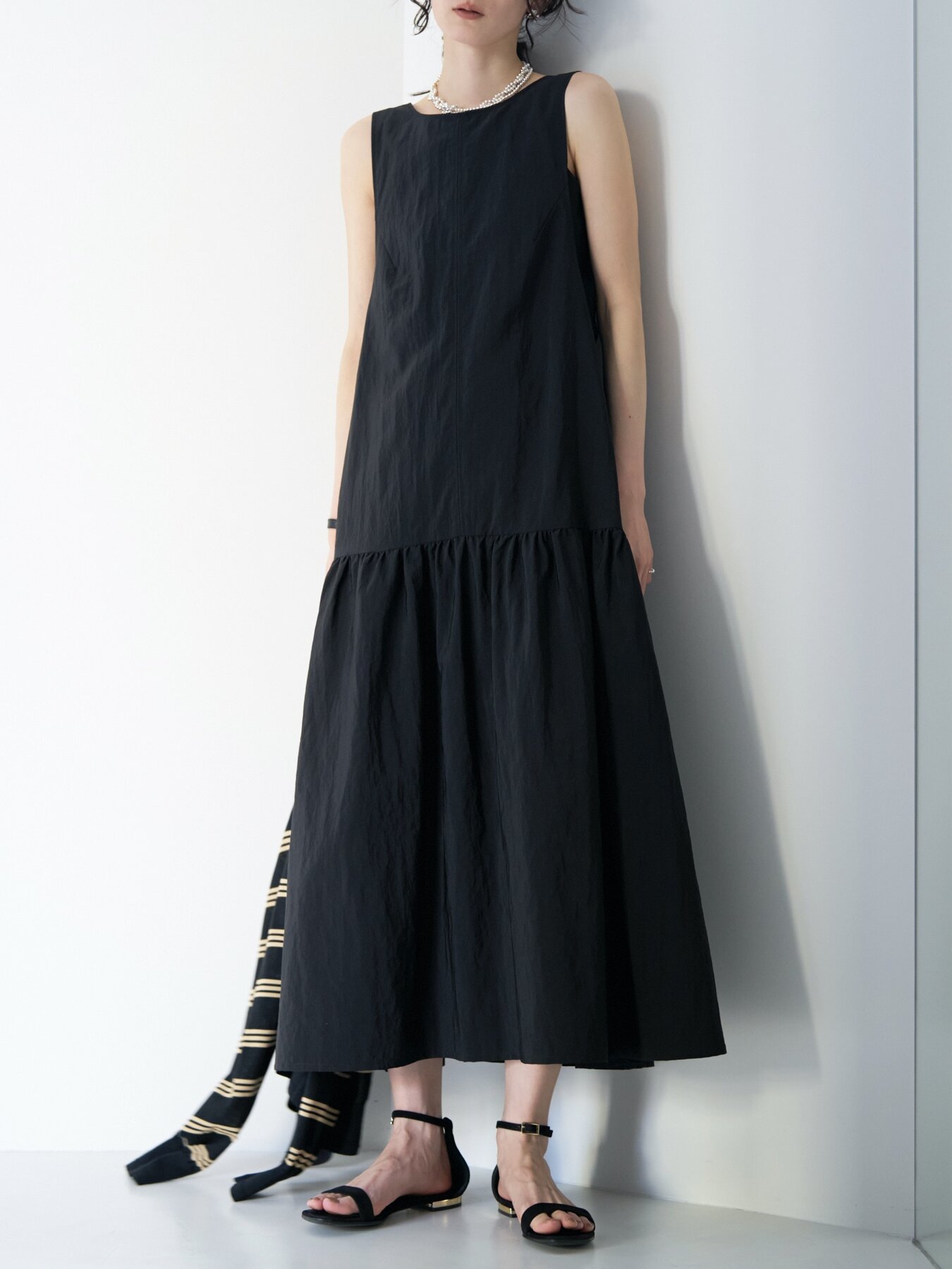 すっきりとしたストレートな身頃から分量感のあるティアードギャザーへと続くシルエットが、甘さを抑えたモードなニュアンスを作り出しています。