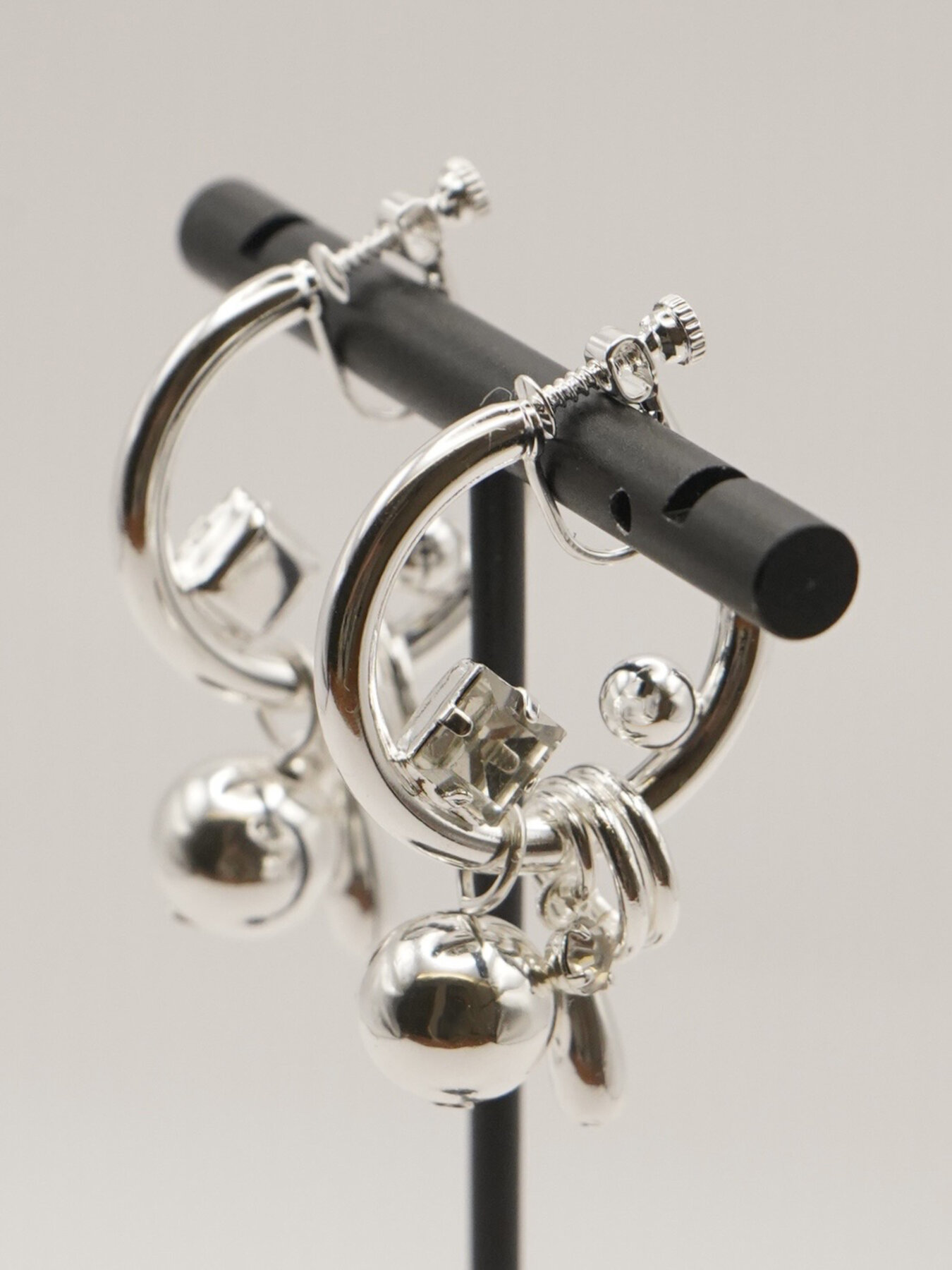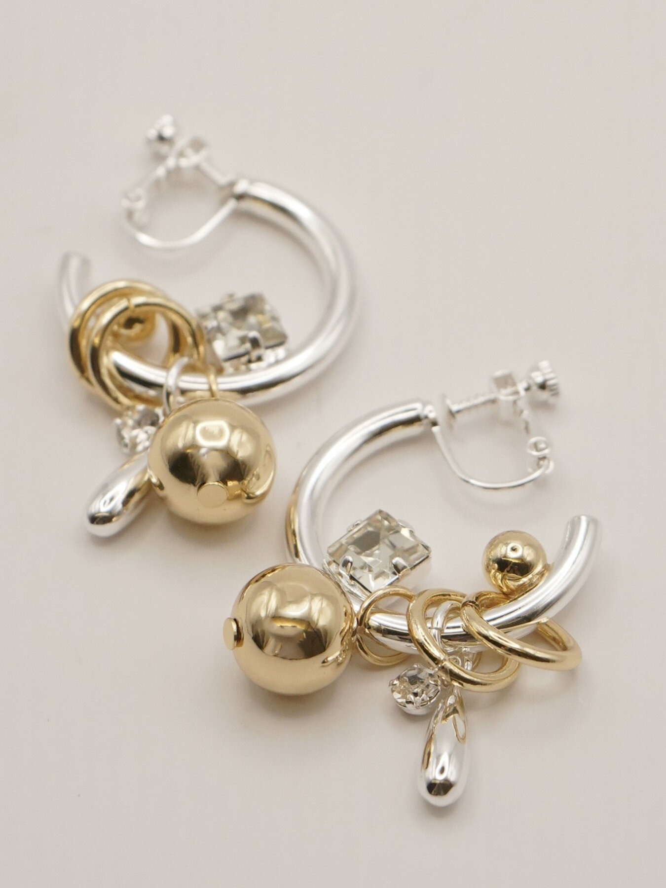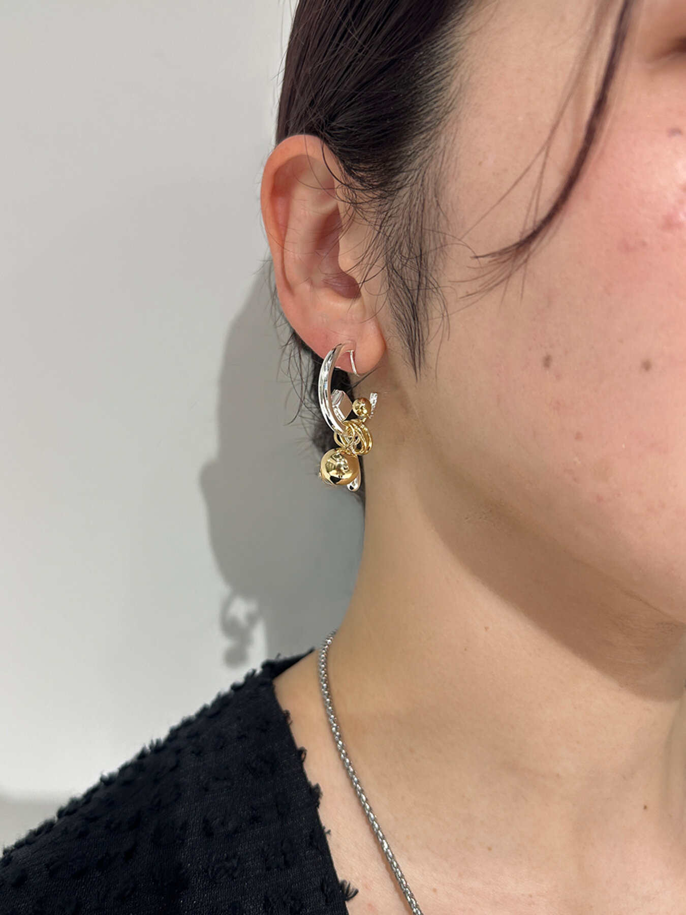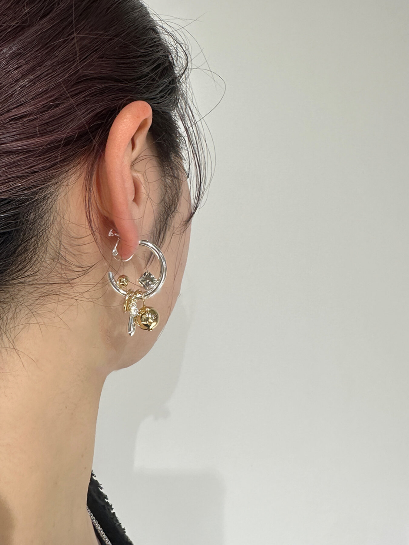 じゃらっとしたモチーフと程良いボリューム感が印象的な遊び心たっぷりのフープイヤリング。それぞれのパーツをバランスよく配置しつつ動きを活かしたデザインは、着けるだけで一際目立つ主役級イヤリングとなっております。カラーはシルバー、ゴールドの他に、SV×GDのミックスもご用意いたしました。同型でピアスもご用意いたしております。