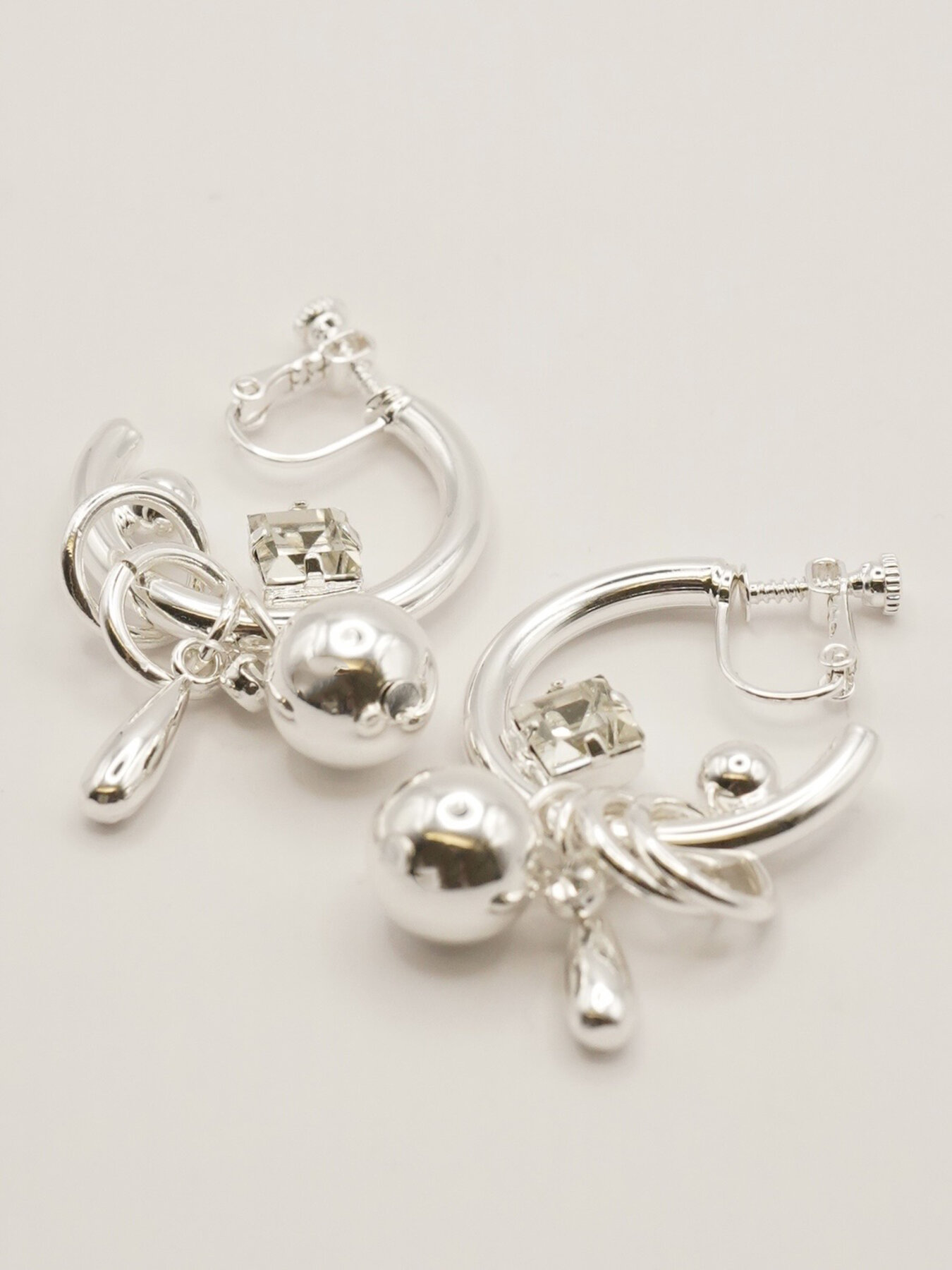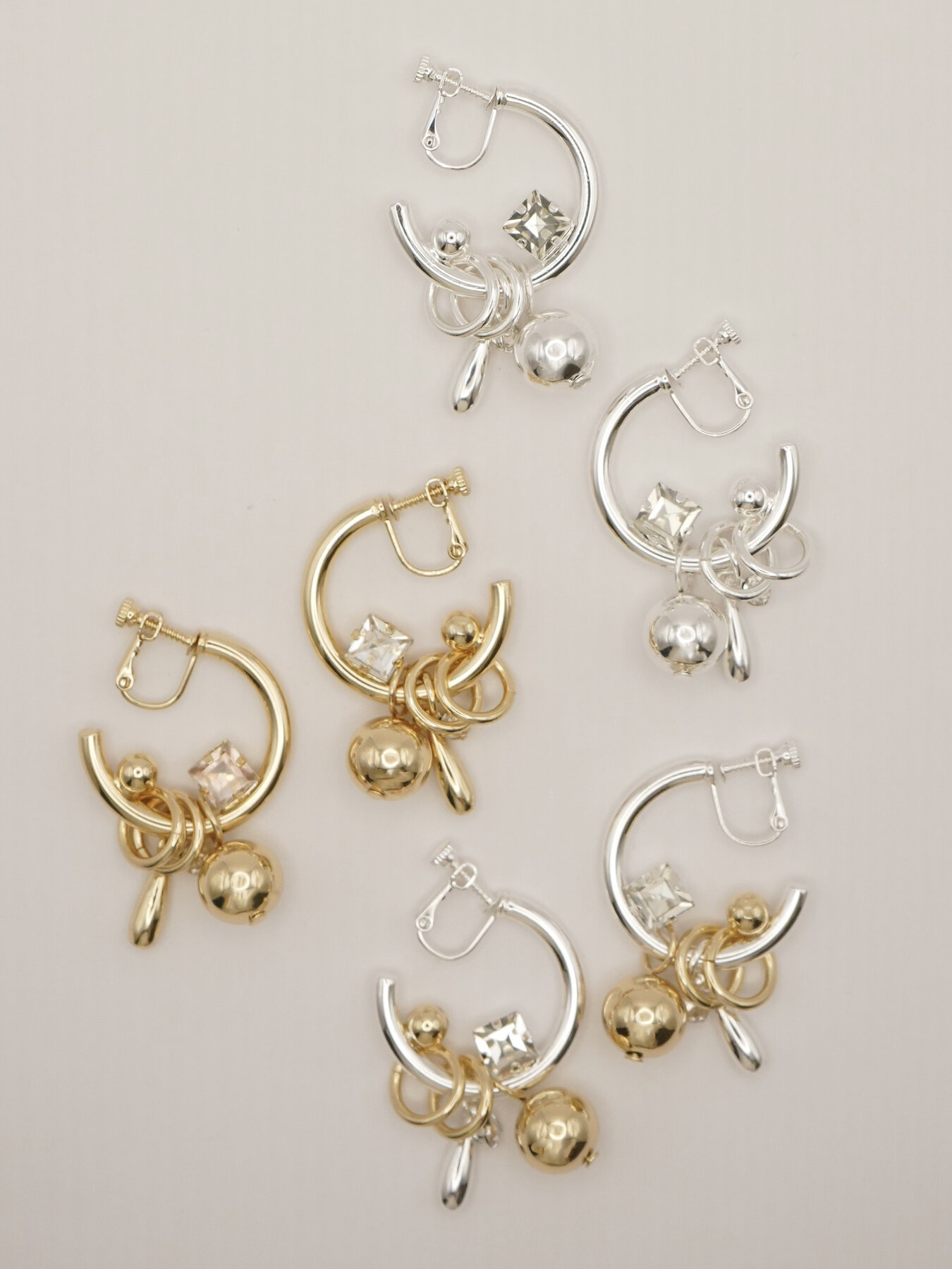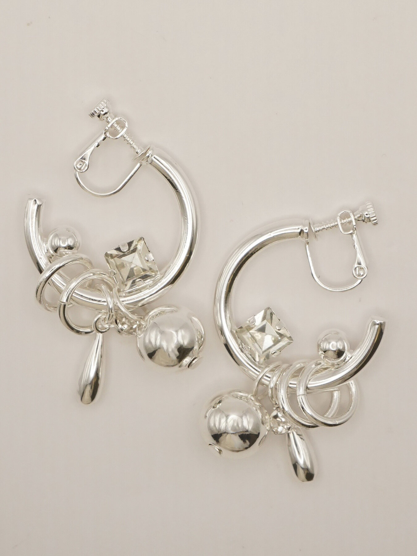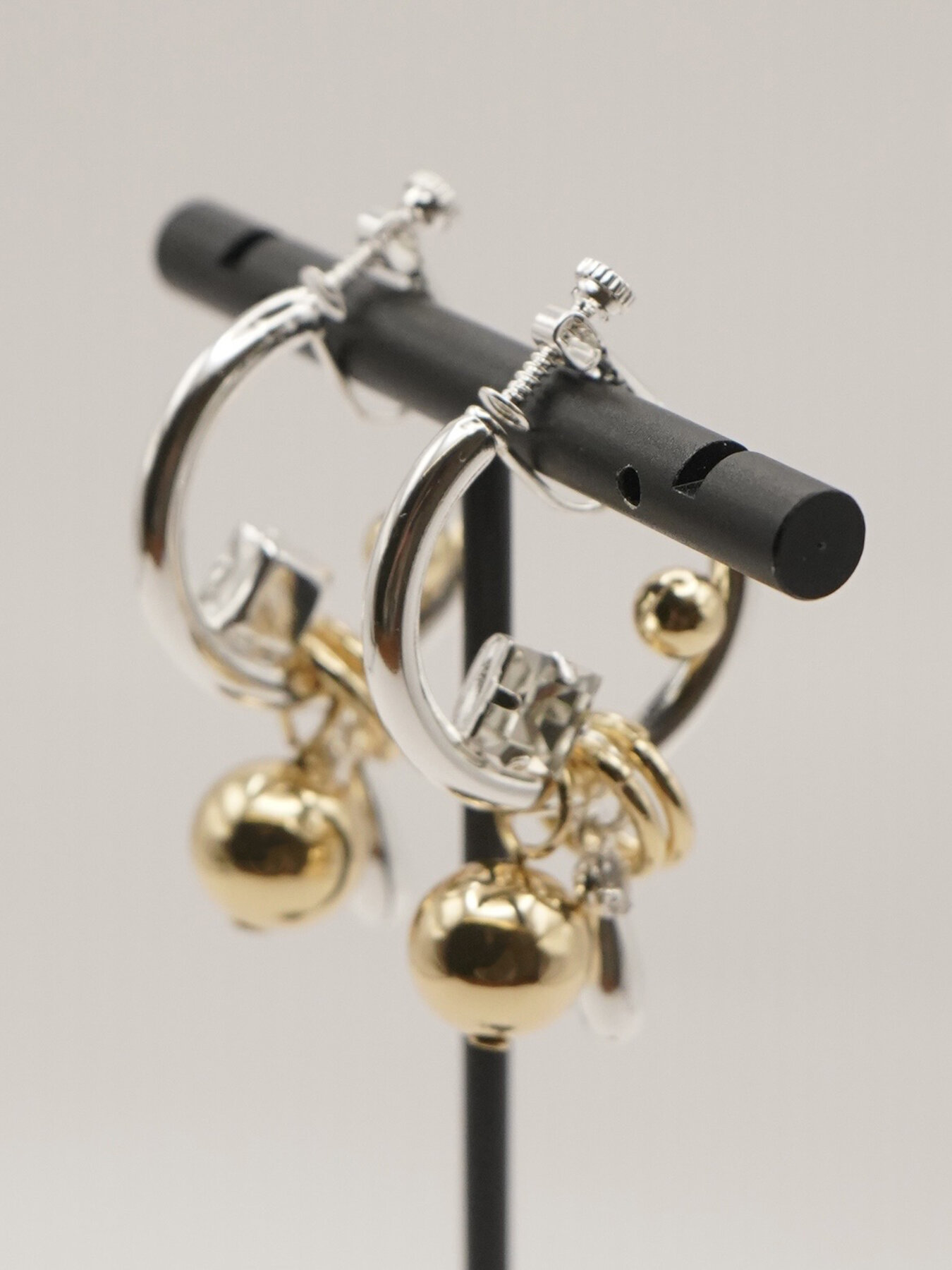 じゃらっとしたモチーフと程良いボリューム感が印象的な遊び心たっぷりのフープイヤリング。それぞれのパーツをバランスよく配置しつつ動きを活かしたデザインは、着けるだけで一際目立つ主役級イヤリングとなっております。カラーはシルバー、ゴールドの他に、SV×GDのミックスもご用意いたしました。同型でピアスもご用意いたしております。