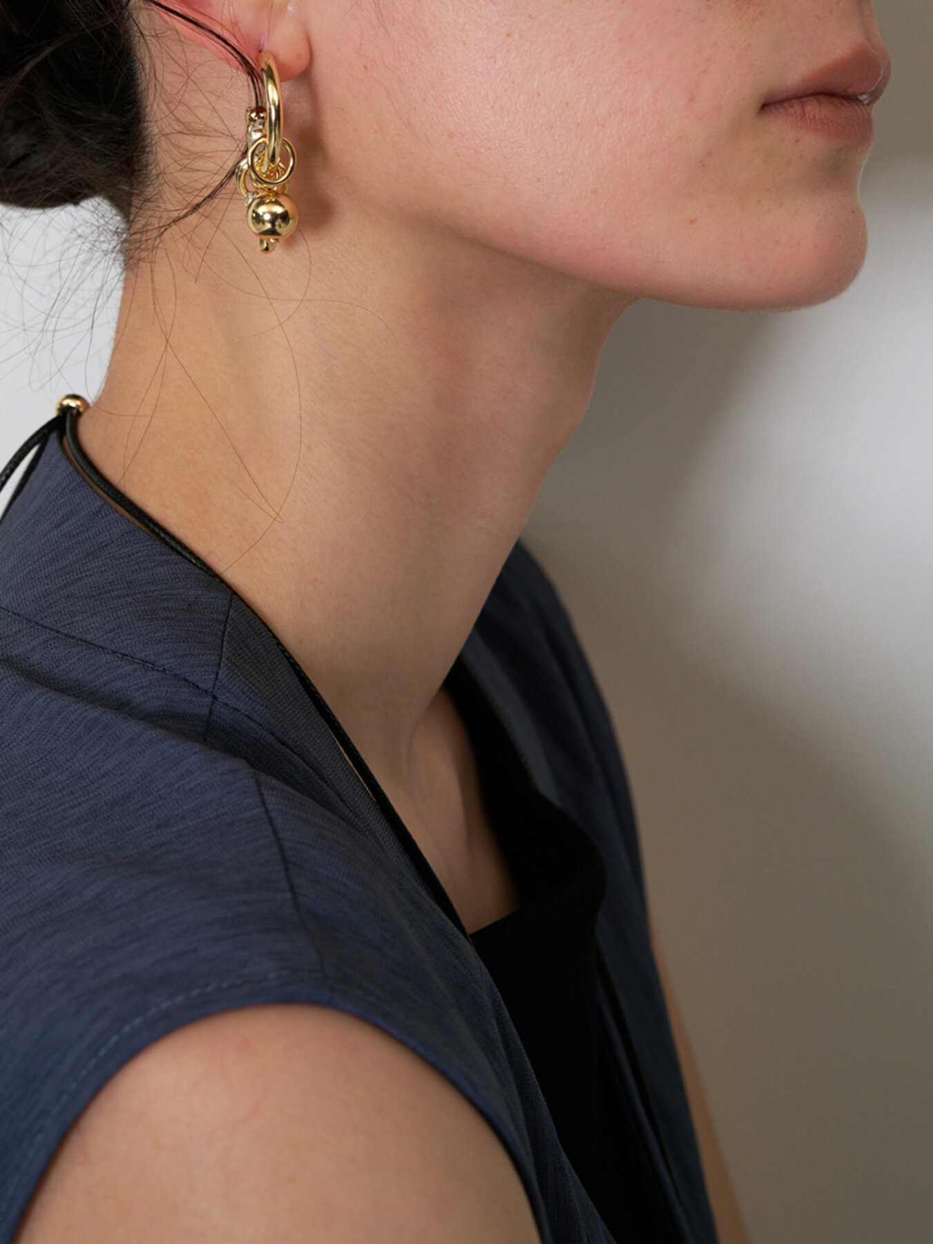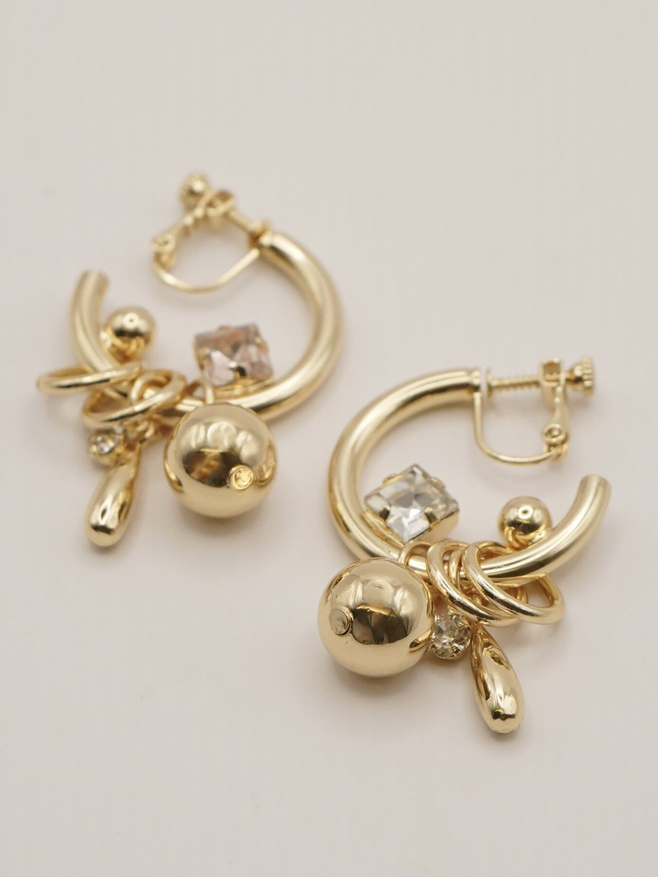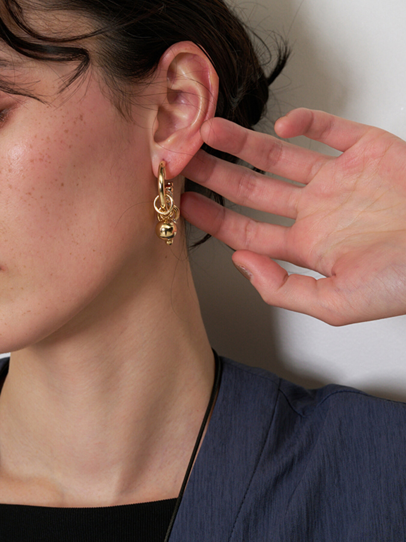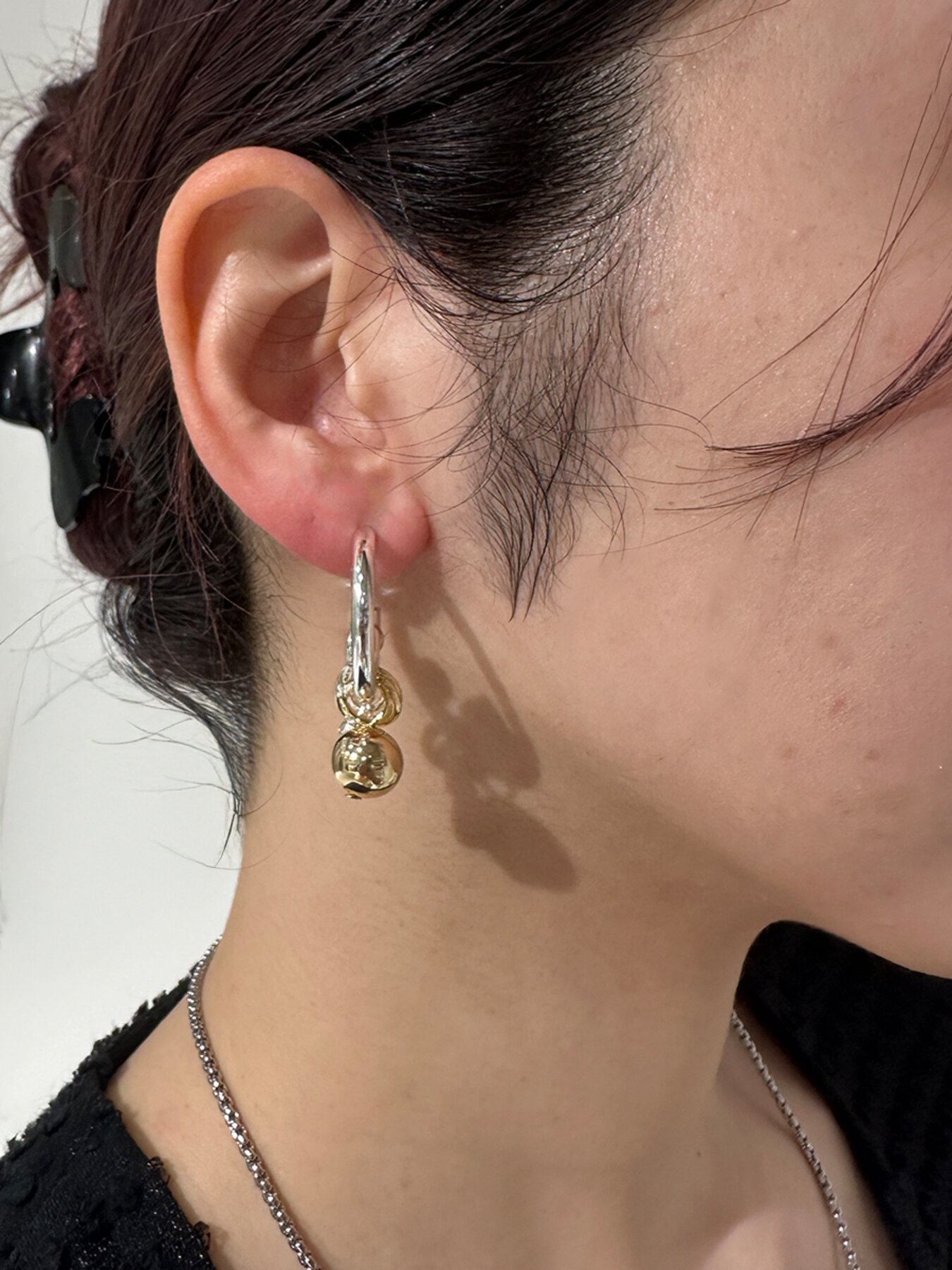じゃらっとしたモチーフと程良いボリューム感が印象的な遊び心たっぷりのフープイヤリング。それぞれのパーツをバランスよく配置しつつ動きを活かしたデザインは、着けるだけで一際目立つ主役級イヤリングとなっております。カラーはシルバー、ゴールドの他に、SV×GDのミックスもご用意いたしました。同型でピアスもご用意いたしております。