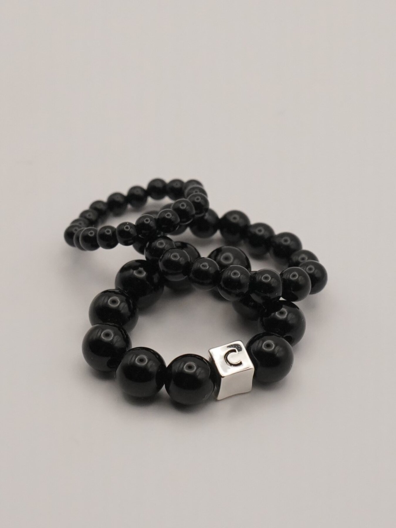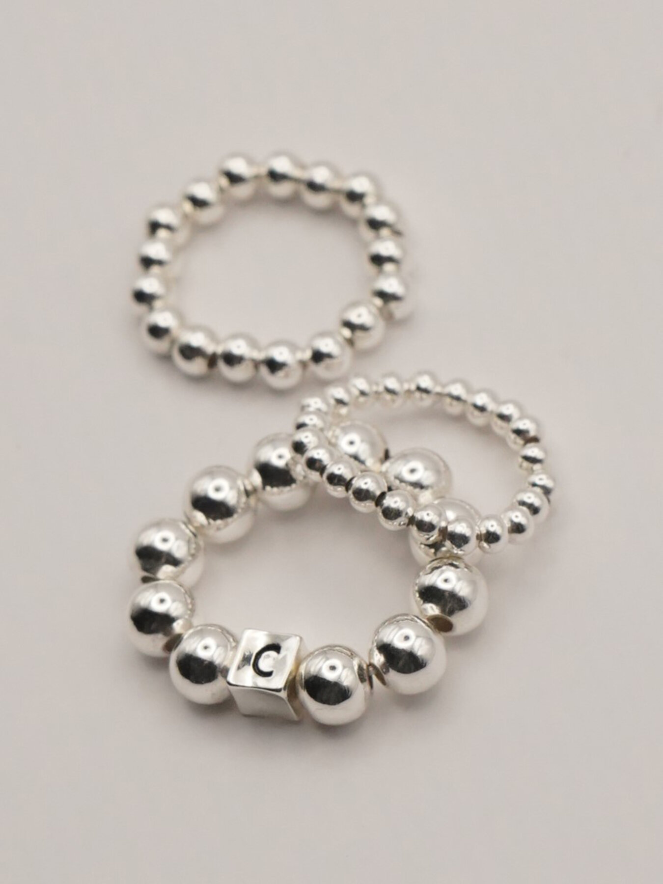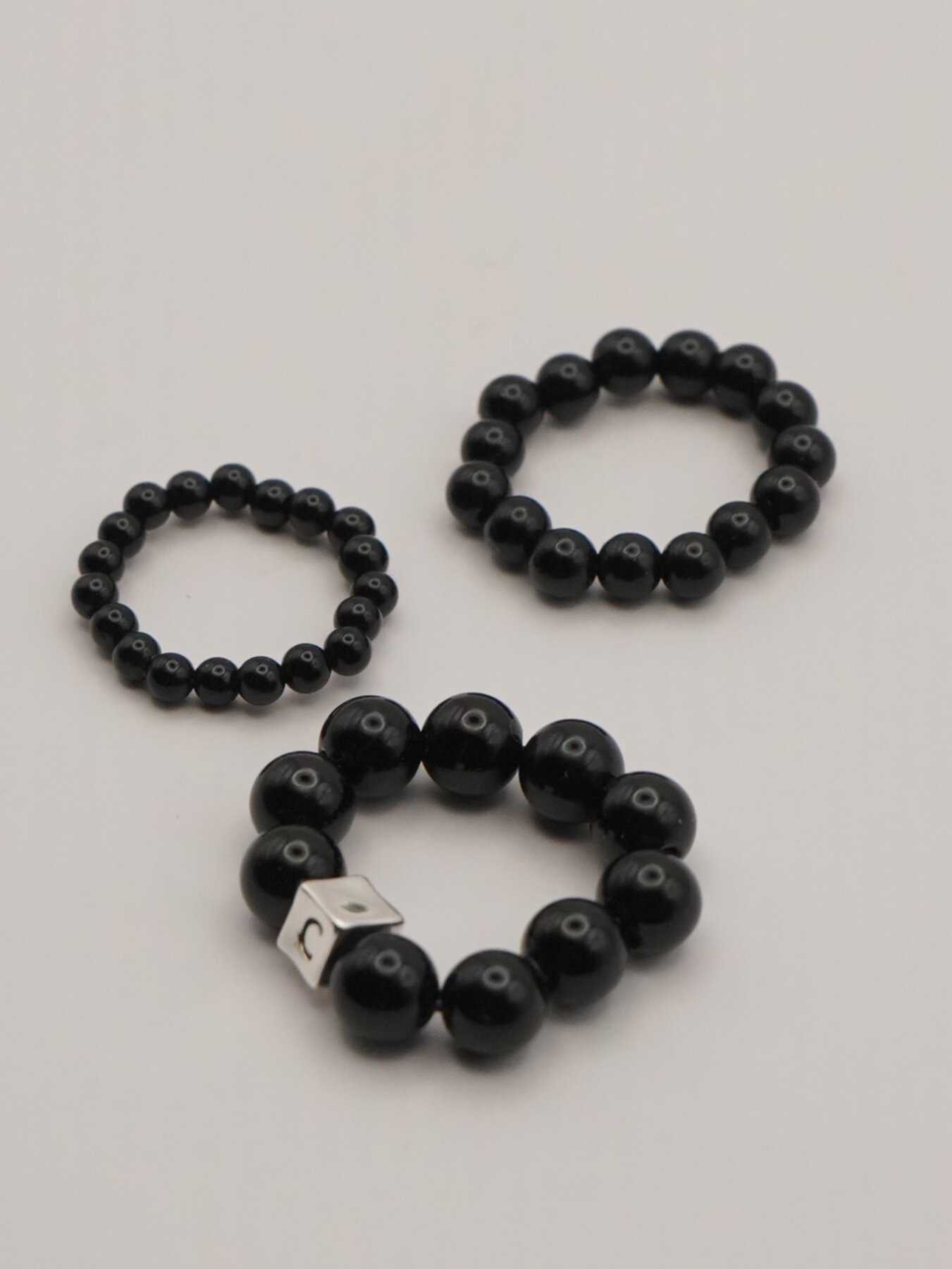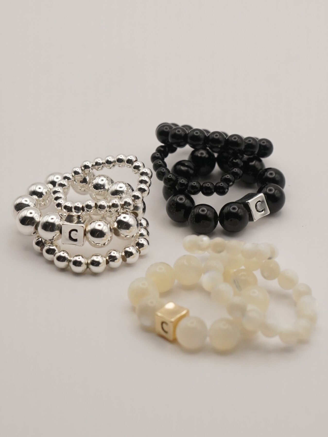丸玉ビーズリング3本セットは、指に着けてるだけでトレンド感とおしゃれさを増し増しにしてくれる遊び心のある大人可愛いリングとなっております。それぞれサイズの違う丸玉リングですが、ゴムリングなのでFREEサイズで愉しめるのも嬉しいポイントです。カラーは、オフホワイト(マザーオブパール)、ブラック(オニキス )、シルバー(真鍮/メッキ)の3色をご用意いたしました。シルバーは、中空の真鍮玉を使っていますので見た目はもちろん、触った時の感触や重さも高級感のある仕上がりになっております。一番大きな丸玉リングにはCHIGNONのCが刻印された変形スクエアパーツが施されております。