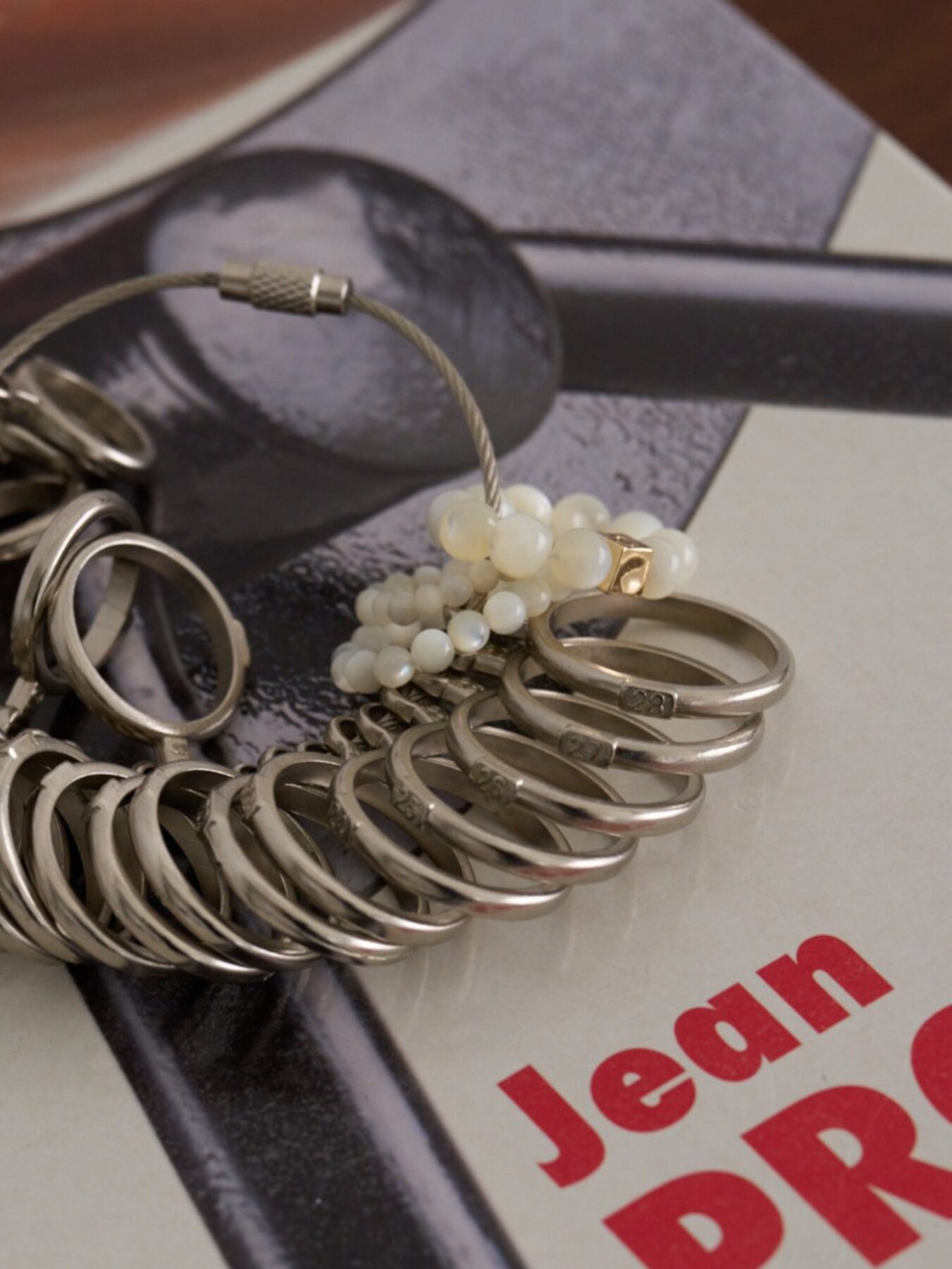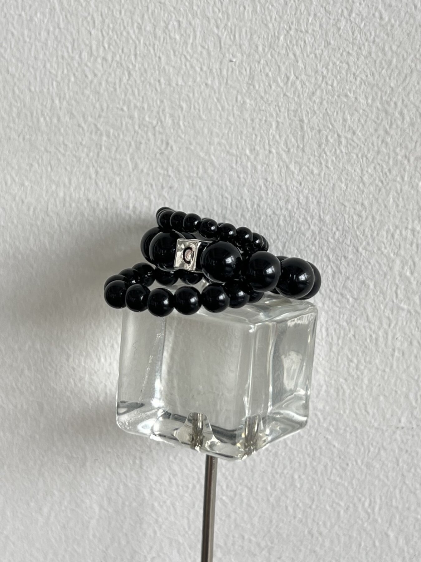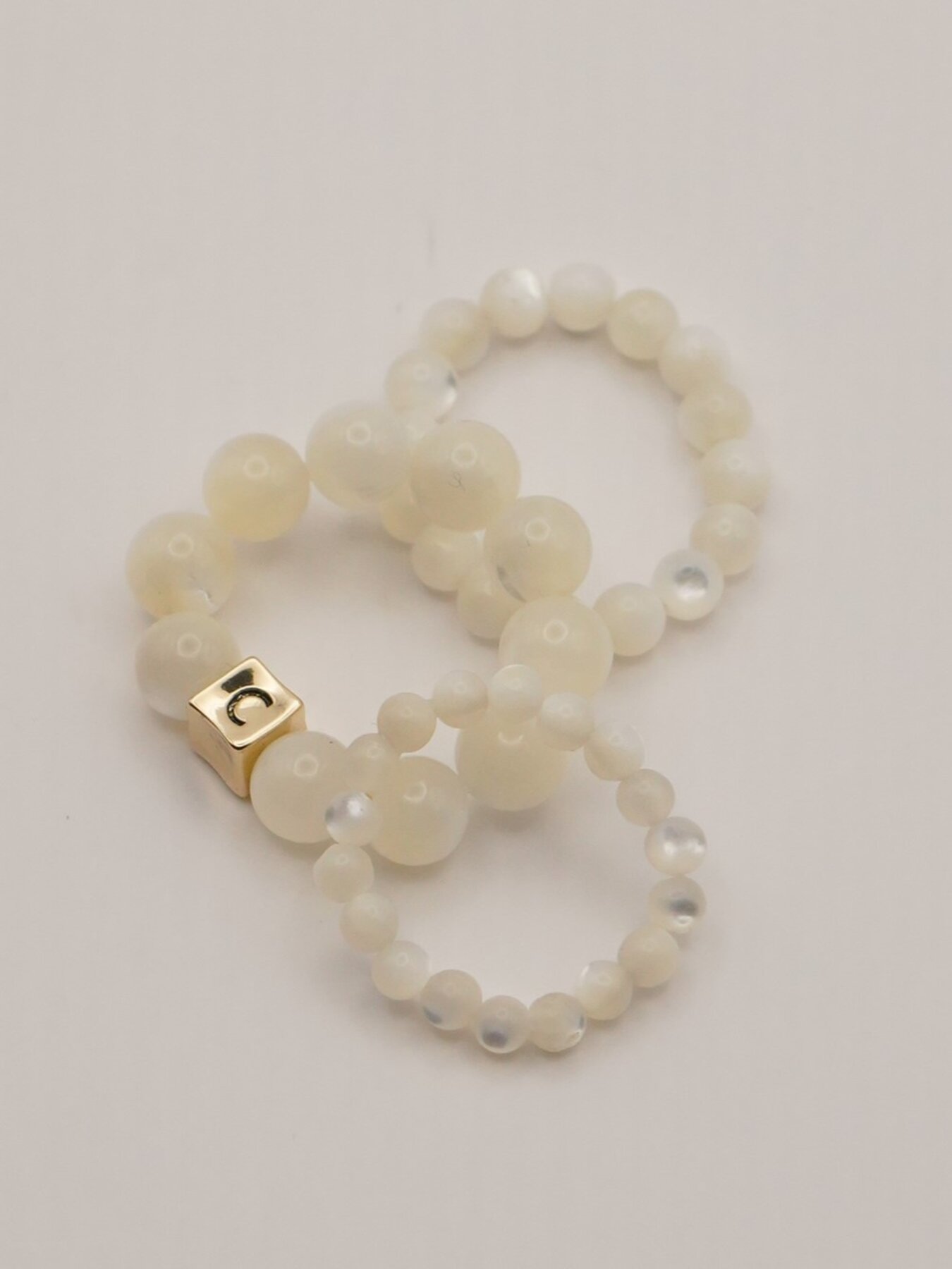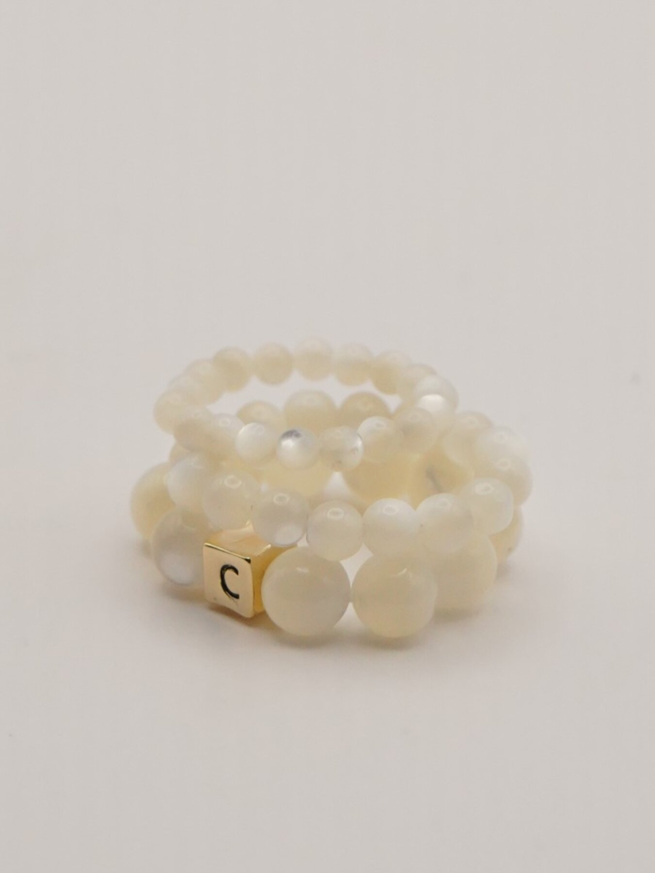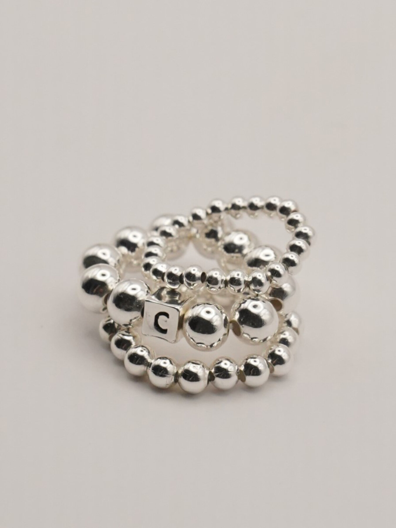 丸玉ビーズリング3本セットは、指に着けてるだけでトレンド感とおしゃれさを増し増しにしてくれる遊び心のある大人可愛いリングとなっております。それぞれサイズの違う丸玉リングですが、ゴムリングなのでFREEサイズで愉しめるのも嬉しいポイントです。カラーは、オフホワイト(マザーオブパール)、ブラック(オニキス )、シルバー(真鍮/メッキ)の3色をご用意いたしました。シルバーは、中空の真鍮玉を使っていますので見た目はもちろん、触った時の感触や重さも高級感のある仕上がりになっております。一番大きな丸玉リングにはCHIGNONのCが刻印された変形スクエアパーツが施されております。