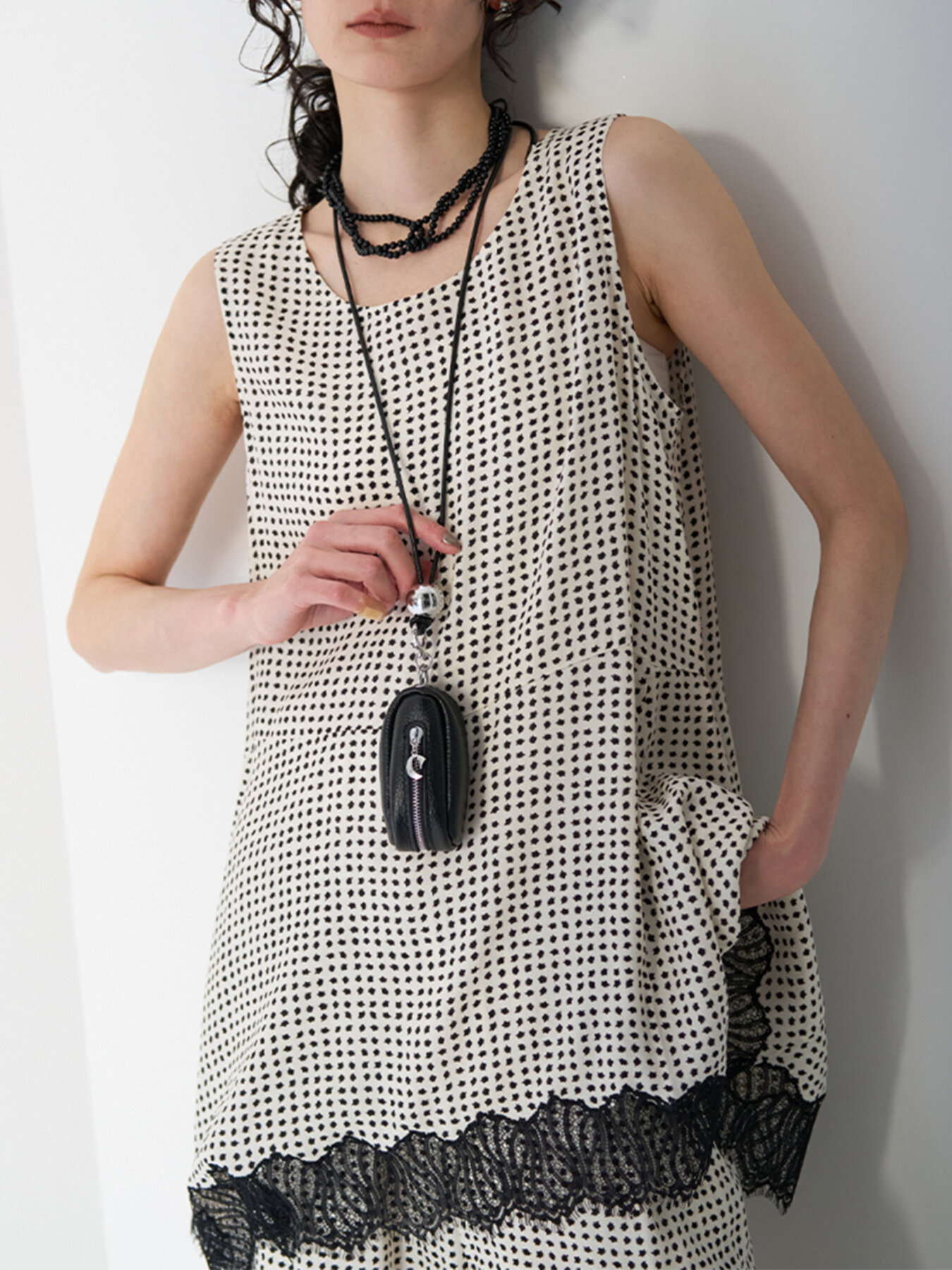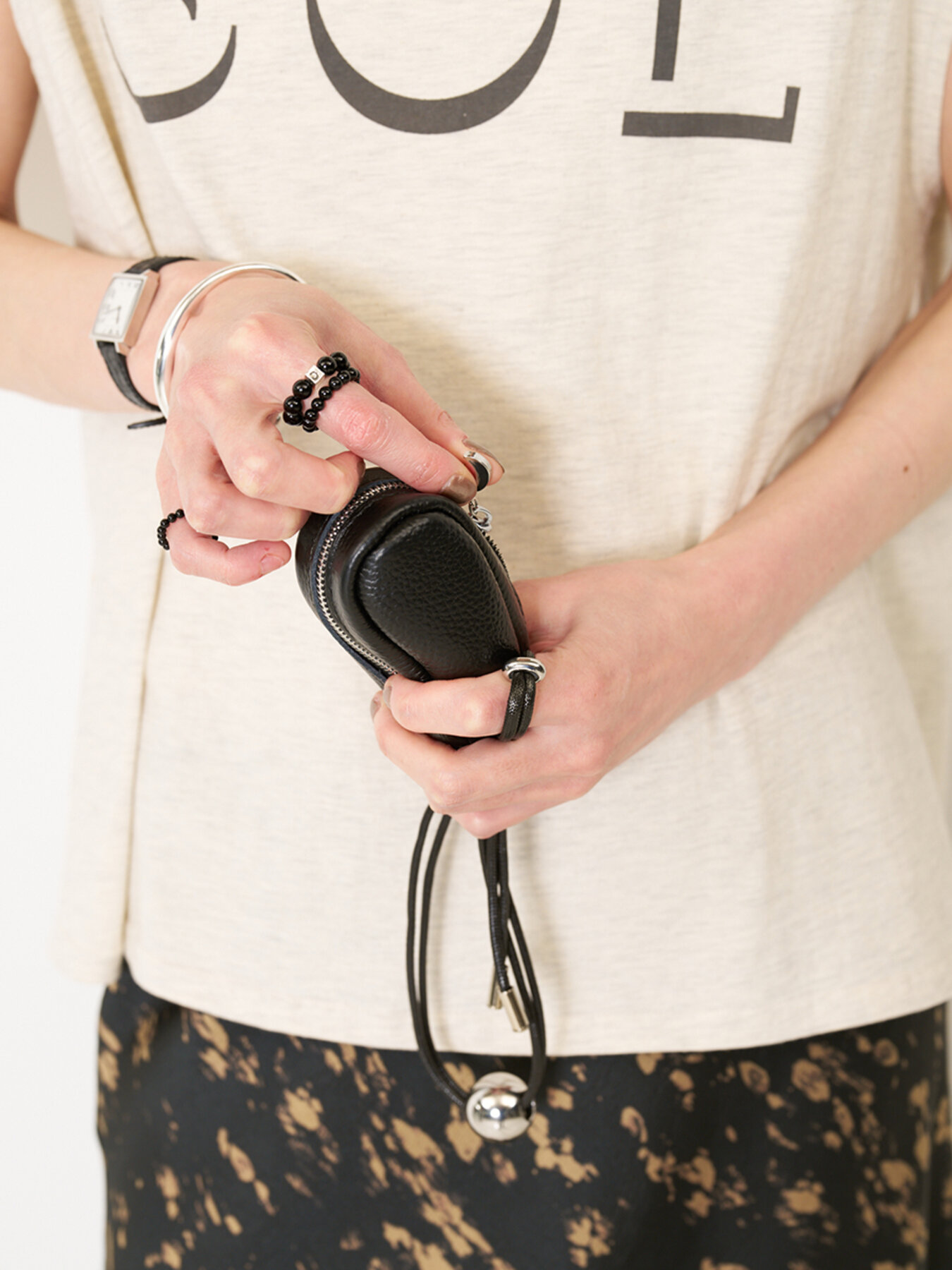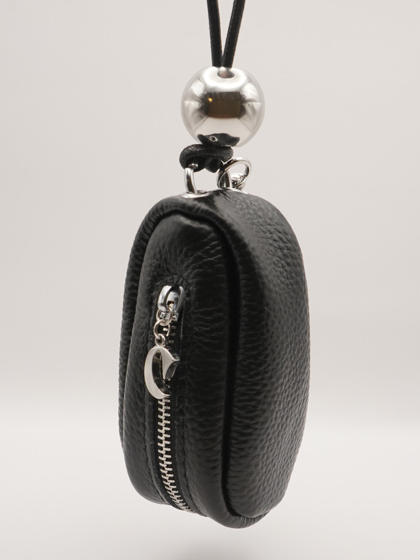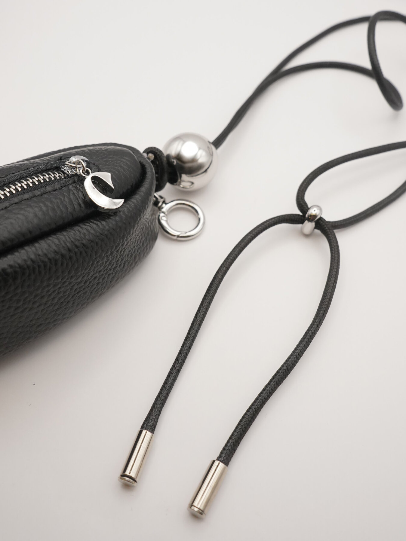 リアルレザー(牛革)のシンプルな縦長ポーチと、シルバーの丸玉付の黒コードの組み合わせが目を惹くポーチ&ネックレス。ポーチには丸カラビナが付いていますので、お手持ちのバッグやパンツのベルトループ部分につけて愉しんでも◎コードネックレス部分は長さ調節が可能なので、前に垂らしたり、ショルダー風にして斜めにつけてたり、短く持って小さいバッグのように使うのもオススメです。ポーチのチャック部分にはCHIGNONのCチャームを施しております。