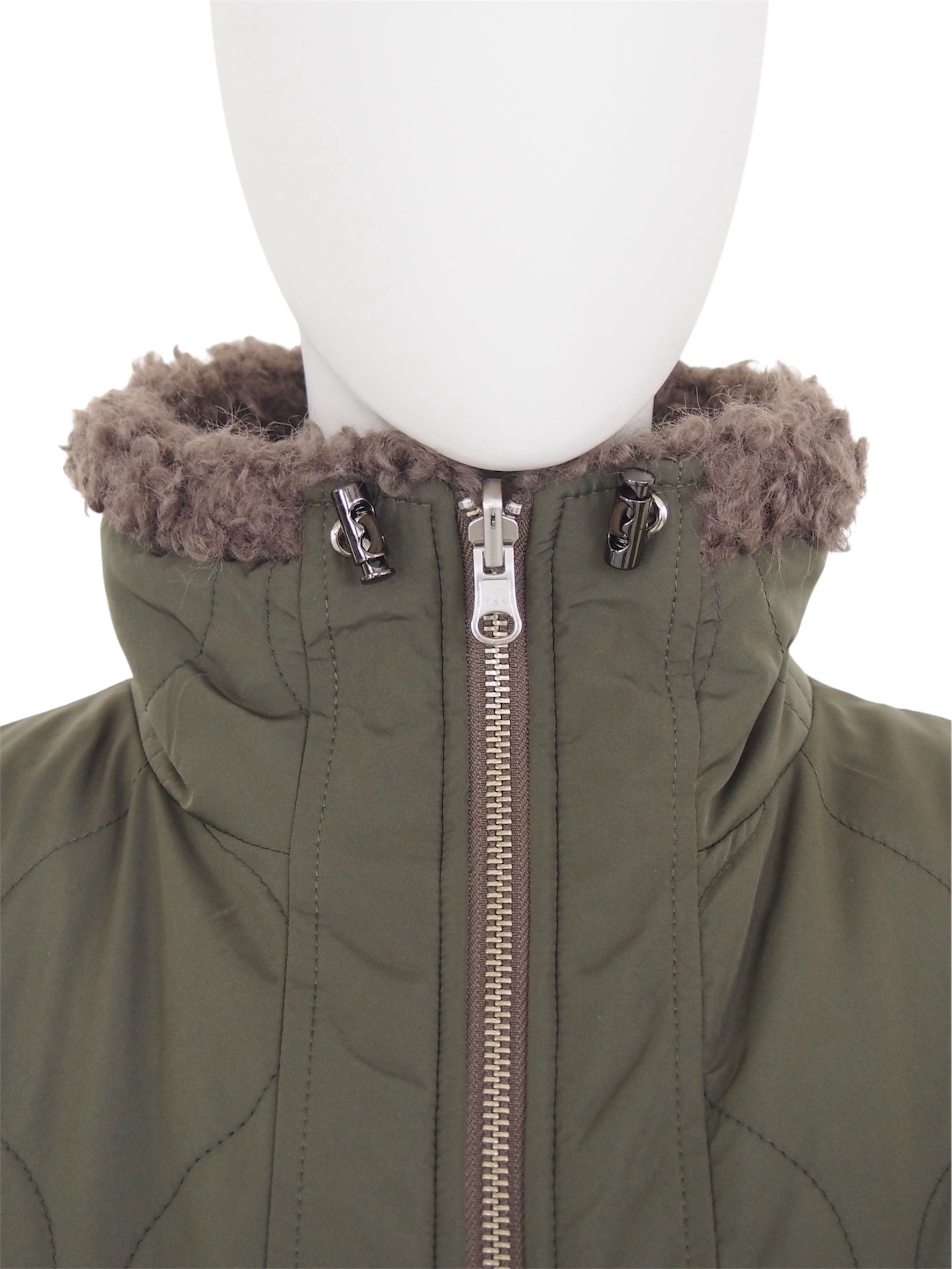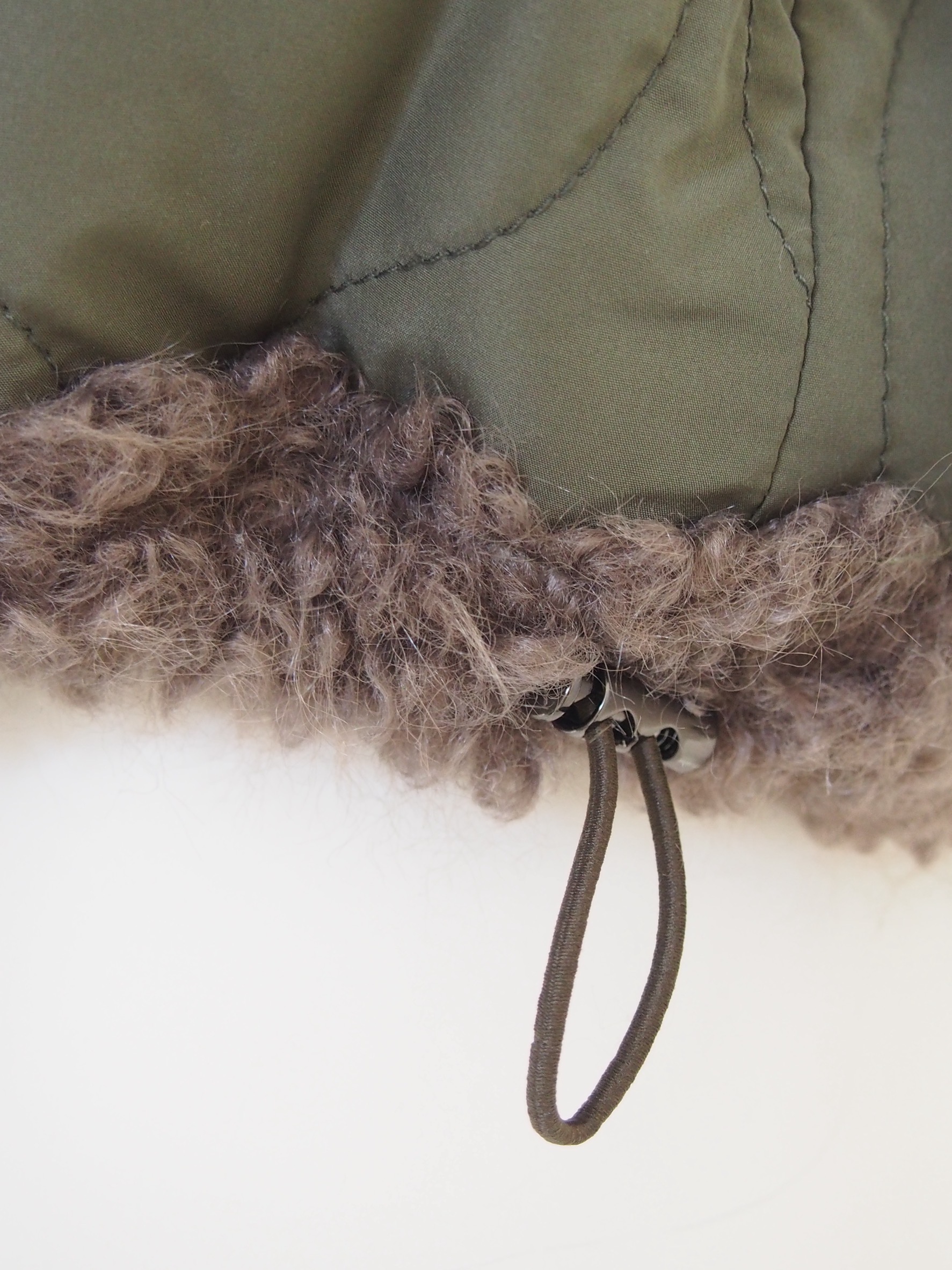 片面はヘチマ柄キルティングにボアトリミングを施したミリタリーテイスト、もう片面は全面ファーで大人っぽく上品な雰囲気に仕上げました。