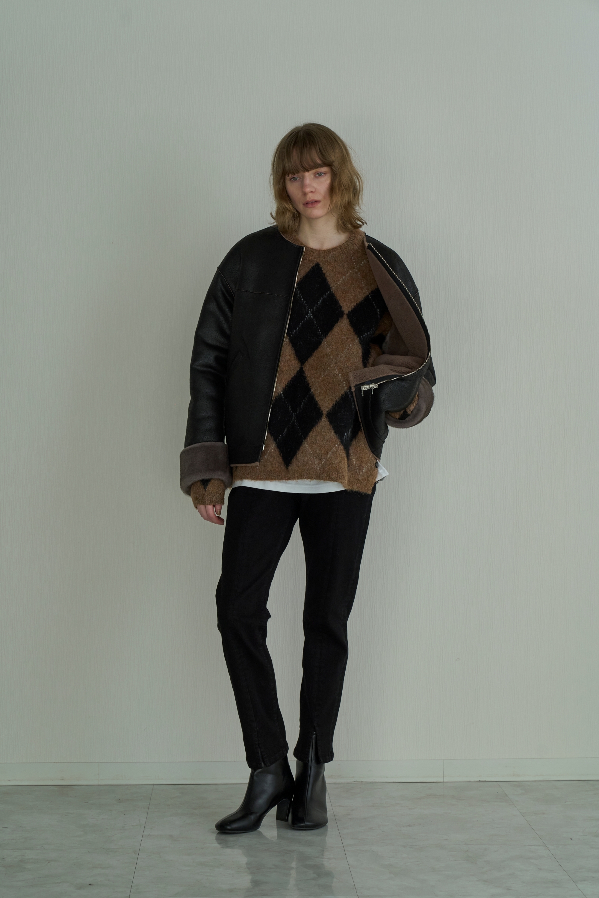 アクリル混の糸を5ゲージのアーガイル柄ジャガードで編み上げた存在感あるニット素材。