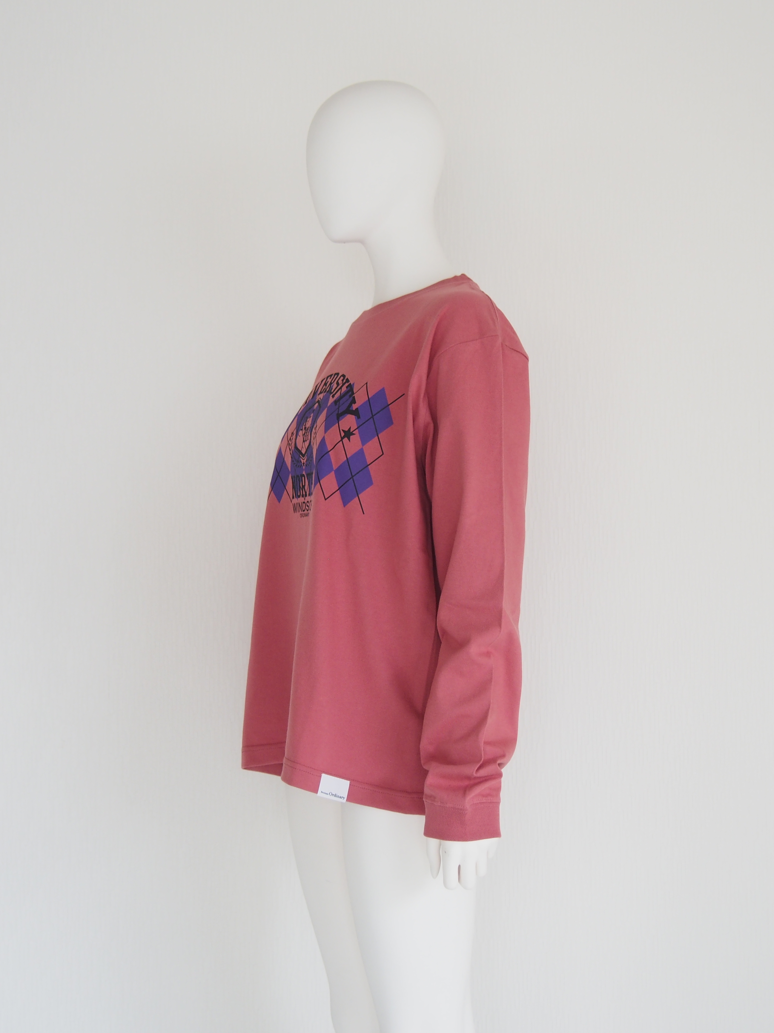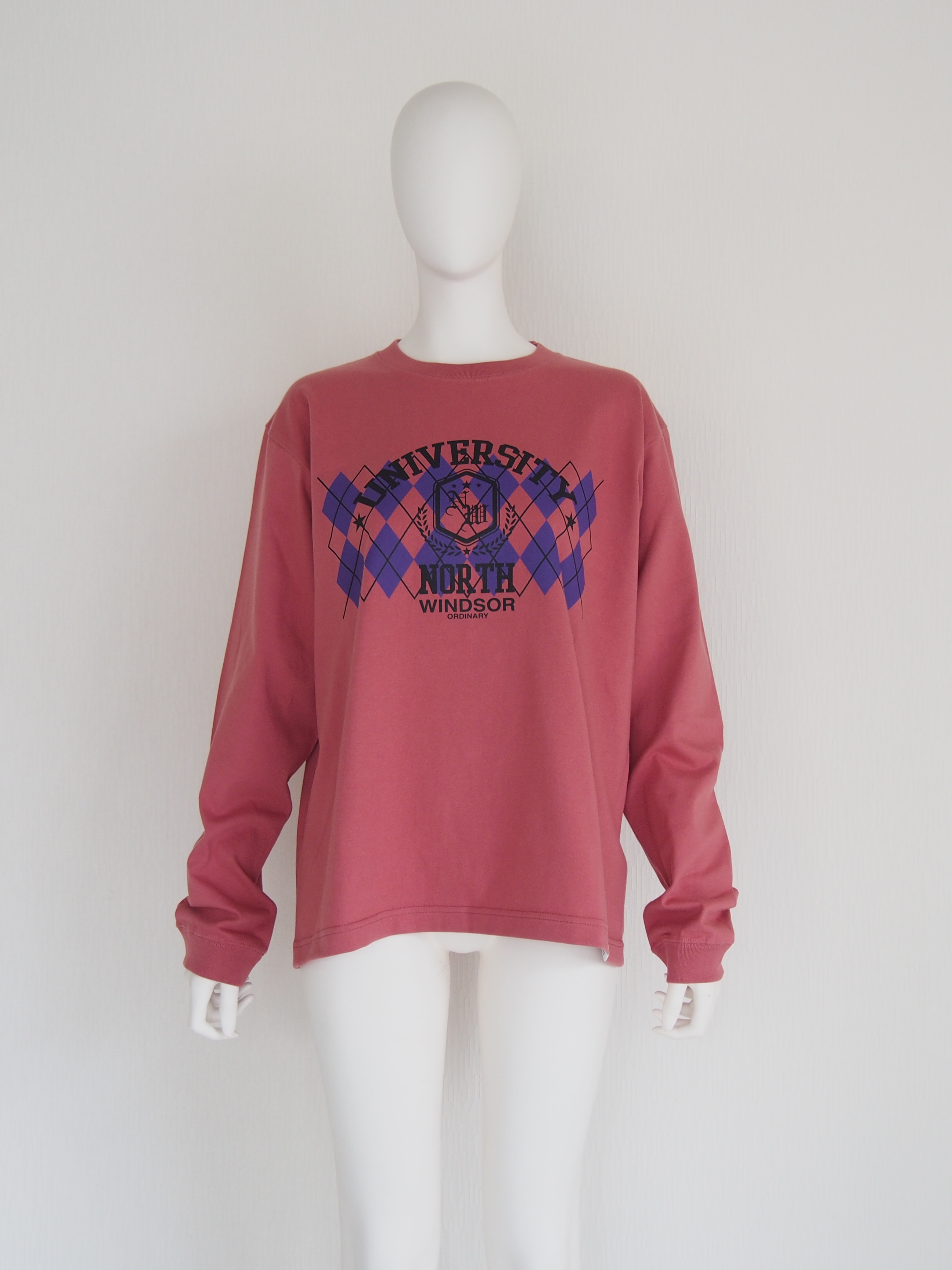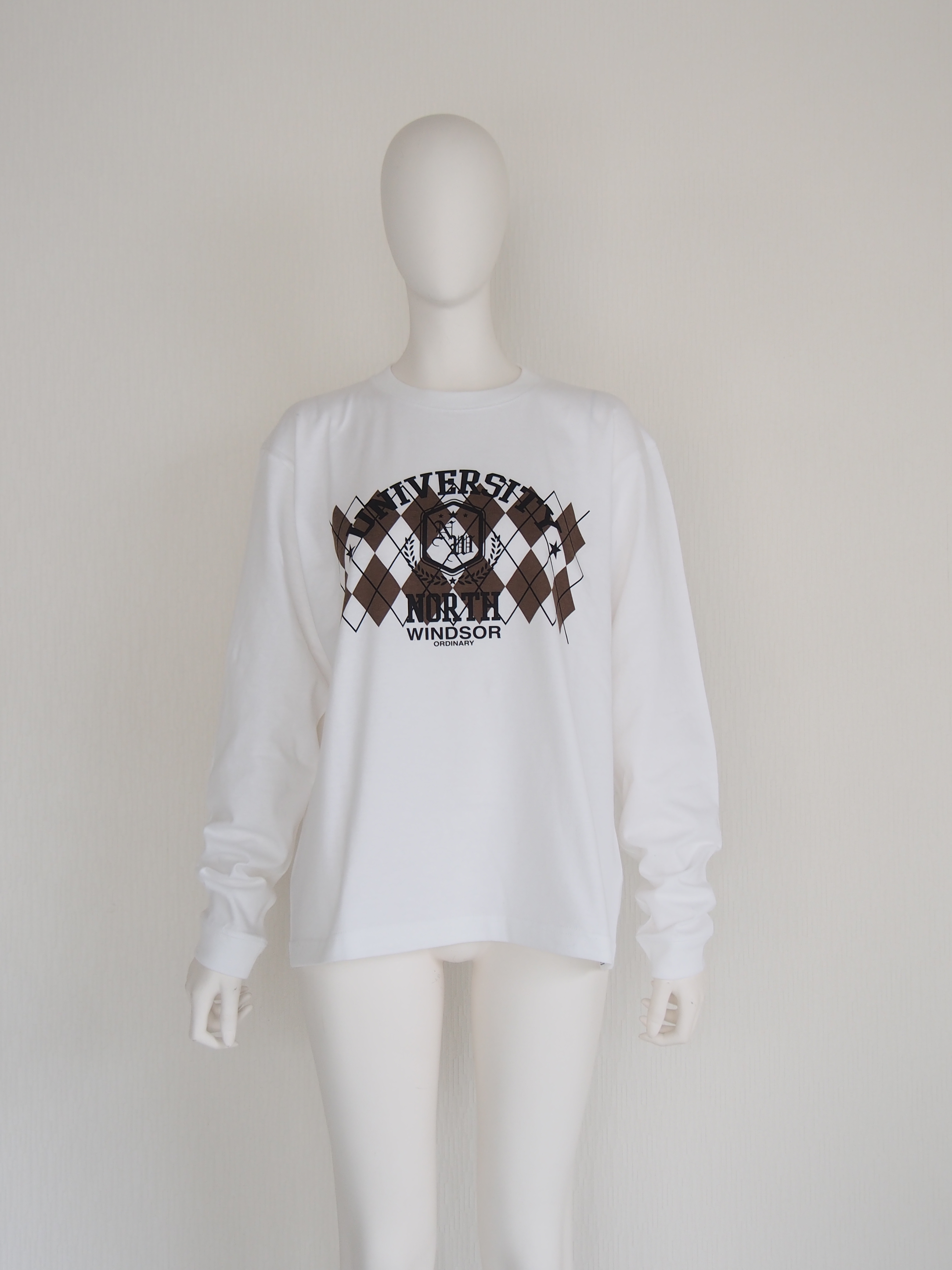 アーガイル柄とカレッジモチーフを組み合わせたグラフィックが印象的なロングスリーブTシャツ。
