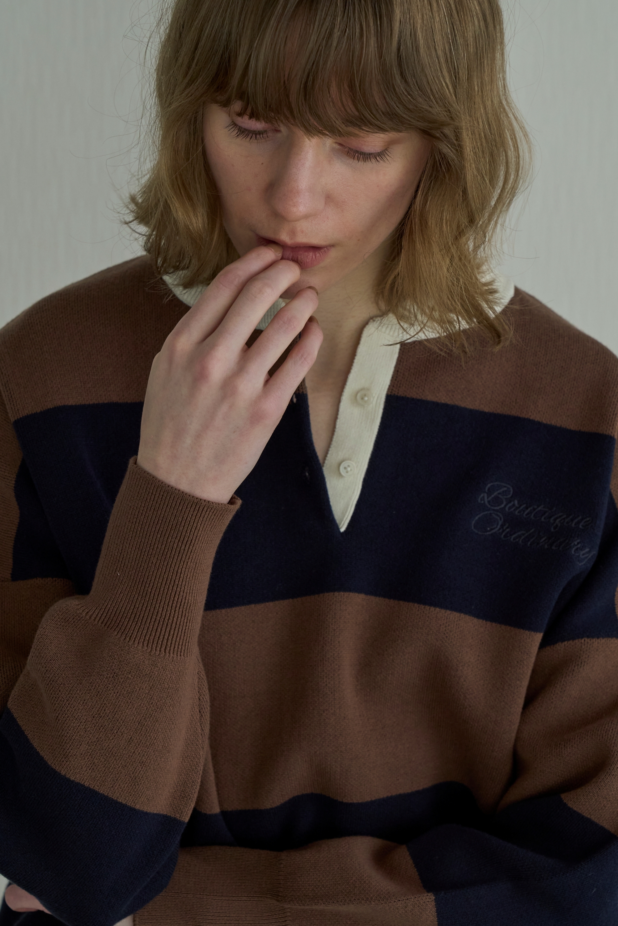 ラガーシャツをベースに、大人トラッドな雰囲気に仕上げたヘンリーネックニット。