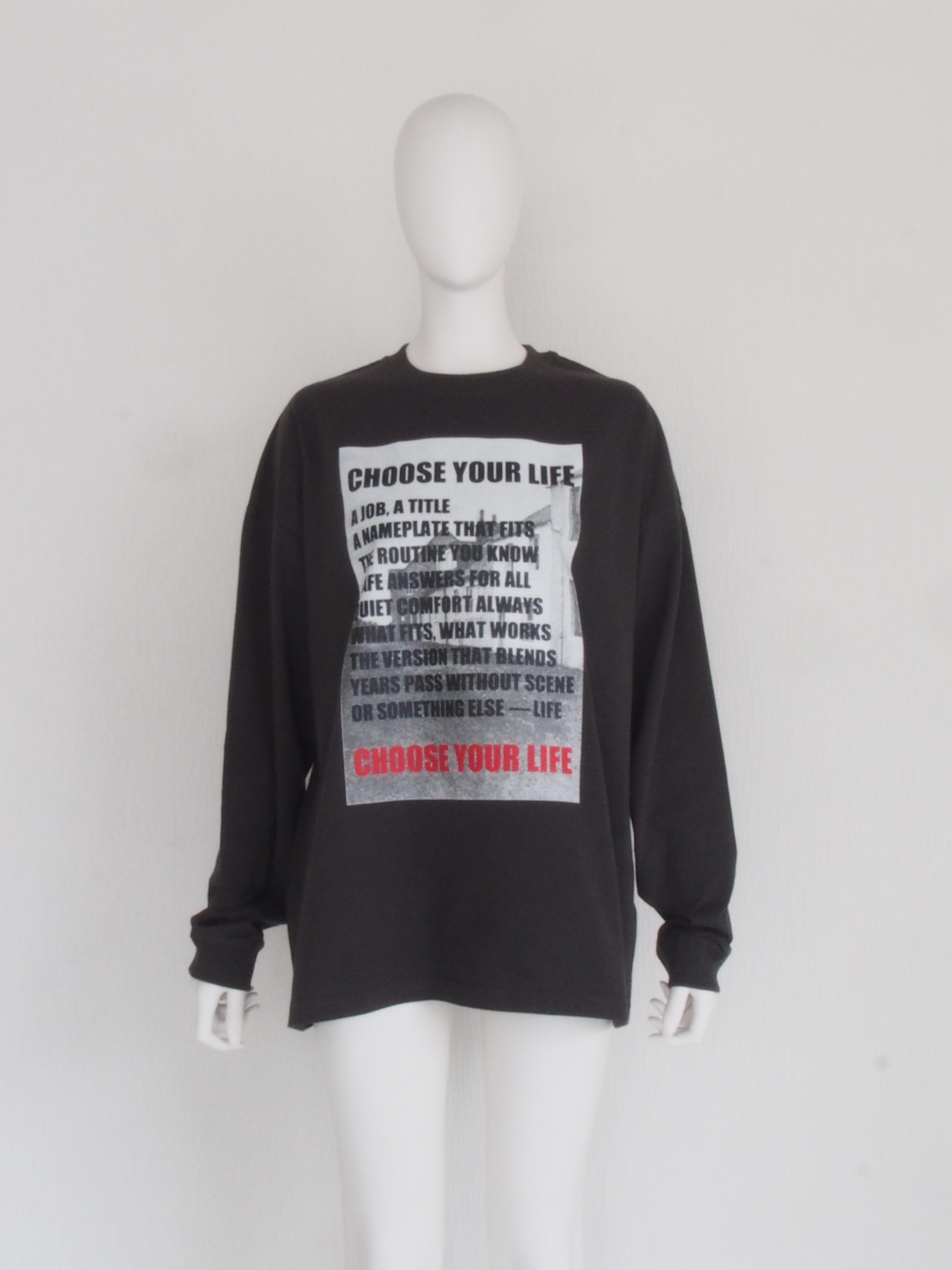 “CHOOSE YOUR LIFE”のメッセージがさりげなくカルチャーの空気感を漂わせ、1枚でスタイリングのアクセントになるアイテムに仕上げました。